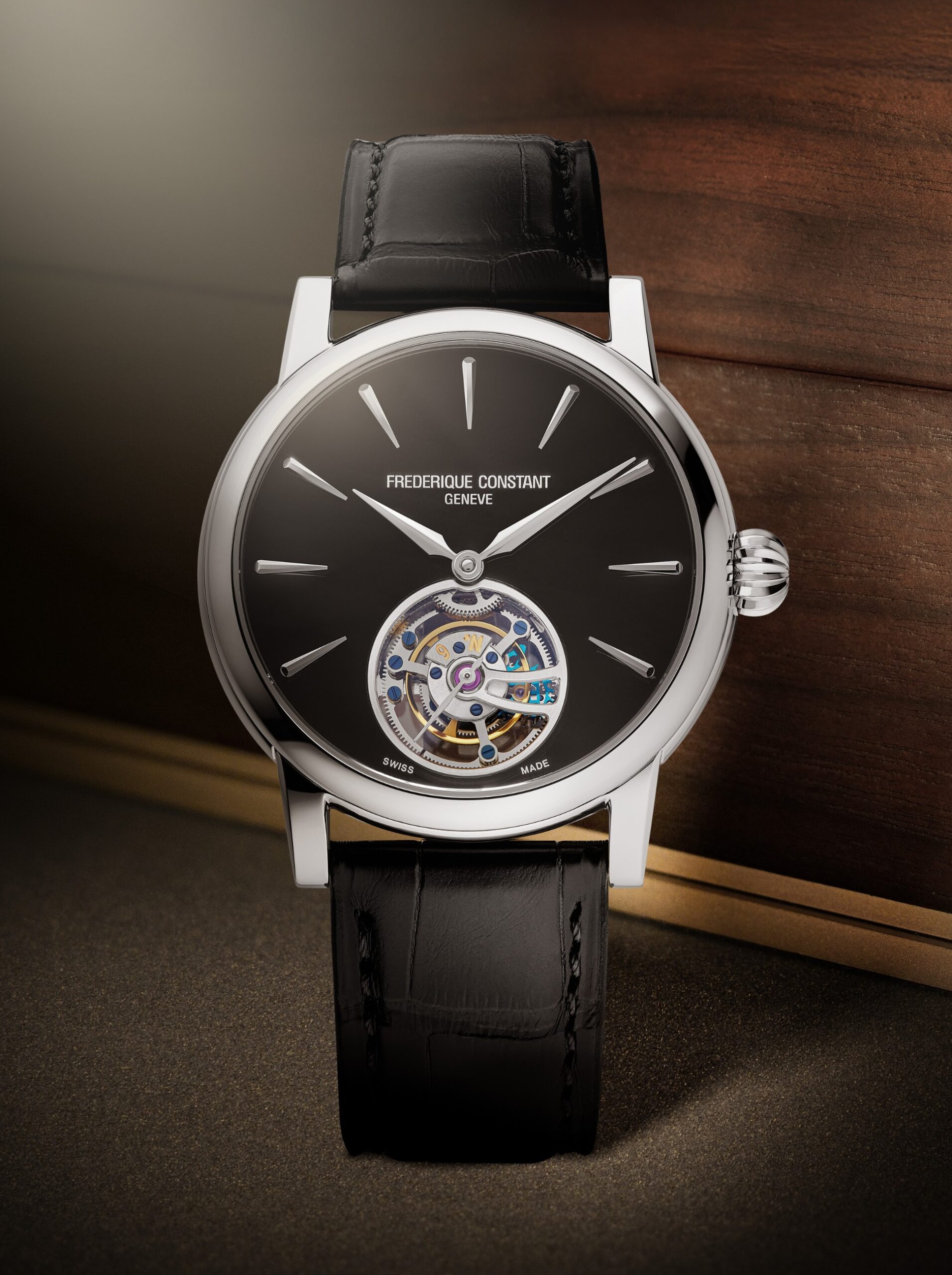 Với Classic Tourbillon Manufacture, Frederique Constant đã tạo nên một thiết kế tối giản đầy kịch tính với mặt số onyx đen. Với bề mặt đen mịn, đôi khi điểm xuyết các lớp trắng hoặc sắc độ khác, loại đá quý toát lên vẻ huyền bí và mạnh mẽ. Thiết kế tối giản của chiếc đồng hồ thép 39mm và giới hạn 37 chiếc toàn cầu cho phép ánh nhìn tập trung hoàn toàn vào tourbillon manufacture. Ở vị trí 6 giờ, cơ chế điều chỉnh được giữ cố định bởi một cầu nối với các đường vát kết hợp đánh bóng thủ công.