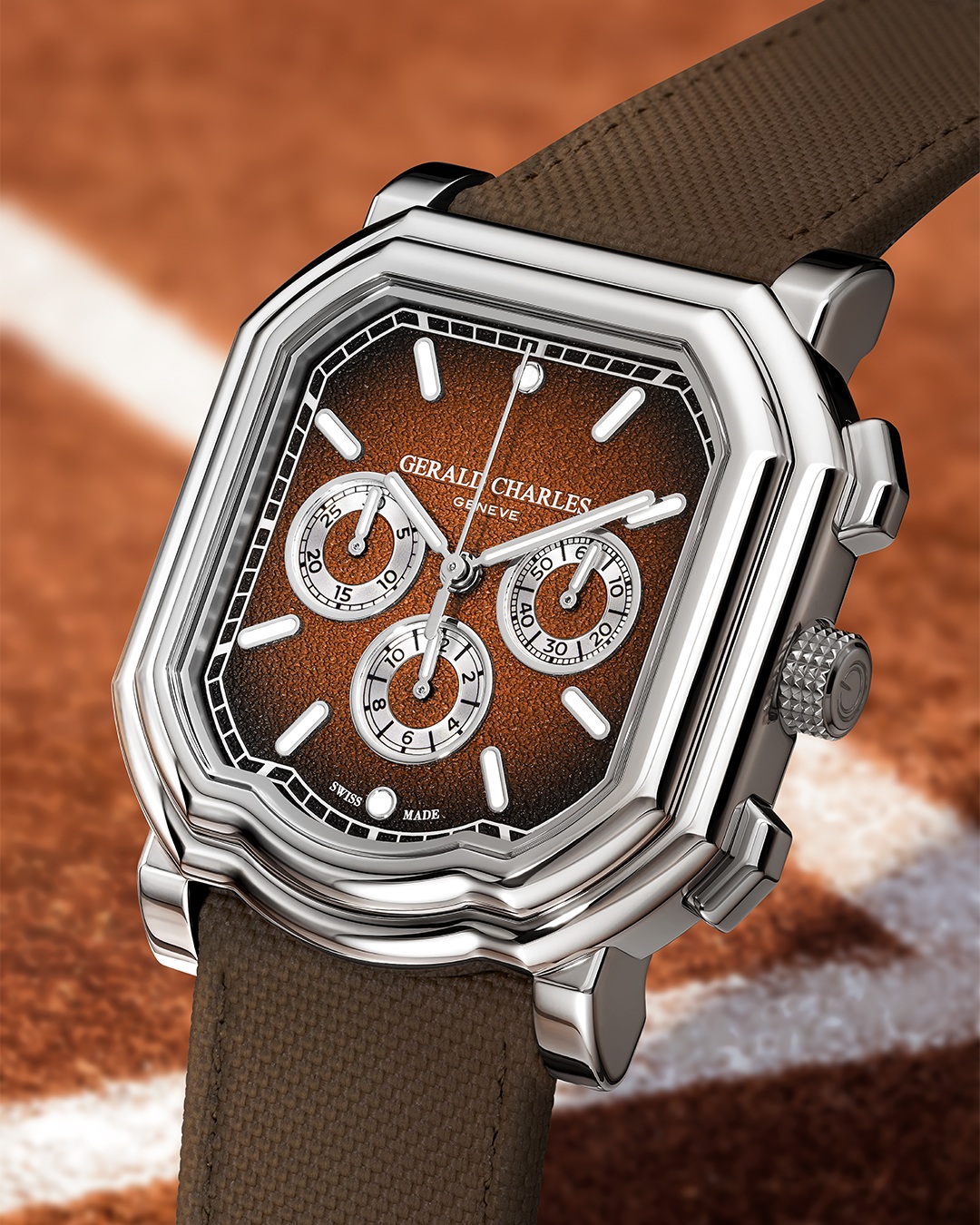 Nguồn năng lượng của quần vợt chuyên nghiệp còn đong đầy trong thiết kế chronograph sang trọng mà Gerald Charles phú cho Maestro 3.0 Chronograph Clay. Mặt số fumé với bề mặt họa tiết phong phú lấy cảm hứng từ sân đất nện đỏ mang tính biểu tượng, tạo nên ngôn ngữ thẩm mỹ khác biệt, kết hợp độ bền của đồng hồ thể thao với tinh thần chế tác Thụy Sỹ cao cấp.