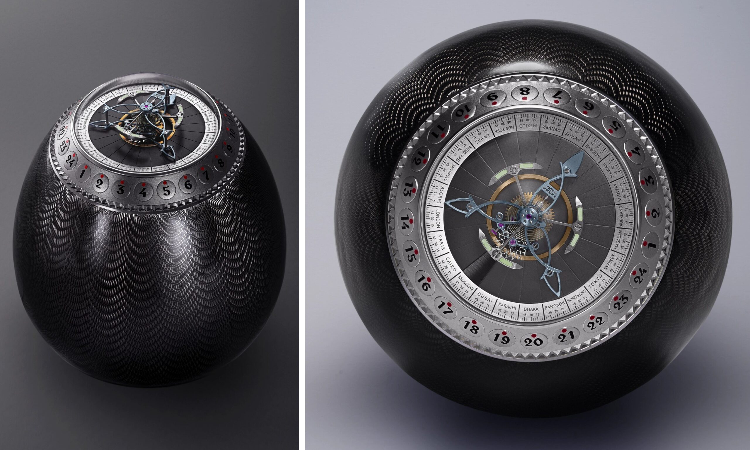 Anton Suhanov đã lựa chọn một hướng đi hoàn toàn khác khi tạo nên St. Petersburg Easter Egg Tourbillon, chiếc đồng hồ để bàn trông như “quả trứng của Columbus”: đứng thẳng hoàn hảo mà dường như không cần bộ phận nâng đỡ. Tạo tác thể hiện hình trứng thuần khiết, gồm ba phần chính: đế bằng thép không gỉ đánh bóng gương; thân “vỏ trứng” bằng bạc hoàn thiện guilloché thủ công phủ men nóng trong suốt và một mái vòm sapphire phía trên lồng tourbillon cùng các hiển thị thời gian. Chi tiết duy nhất phá vỡ bề mặt nhẵn mịn hoàn mỹ là vành gờ có khía và khắc thang thời gian 24 giờ. Thang này cũng cho phép xác định giây thông qua tourbillon xoay một vòng đúng 24 giây. Việc chỉnh giờ được thực hiện bằng cách xoay vành gờ – đồng thời cập nhật cho cả 24 múi giờ. Riêng khu vực giờ địa phương của Moscow (và St. Petersburg) được hoàn thiện bằng các đường chải hướng tâm, tạo độ tương phản tinh tế với 23 ô còn lại trên đĩa thành phố.