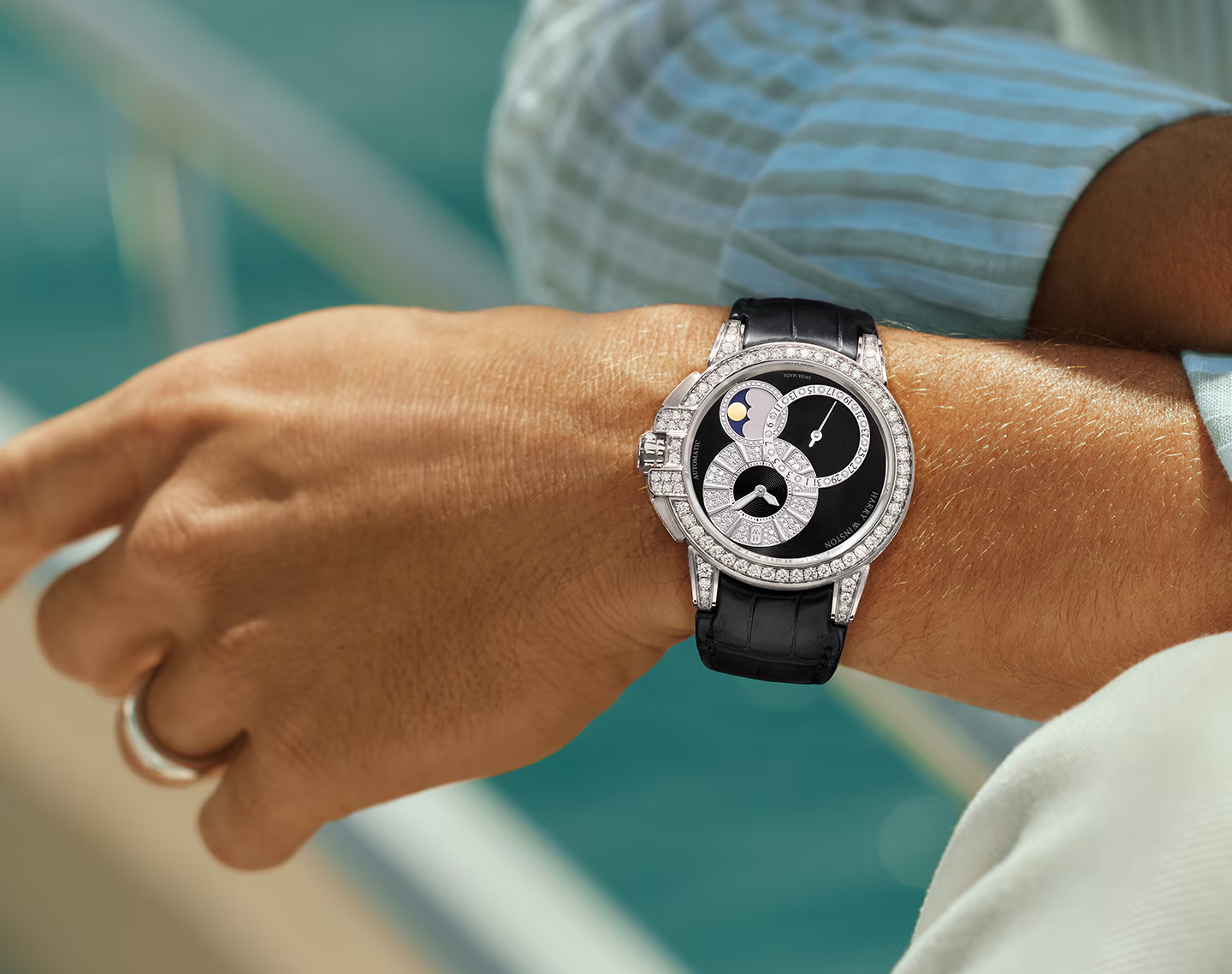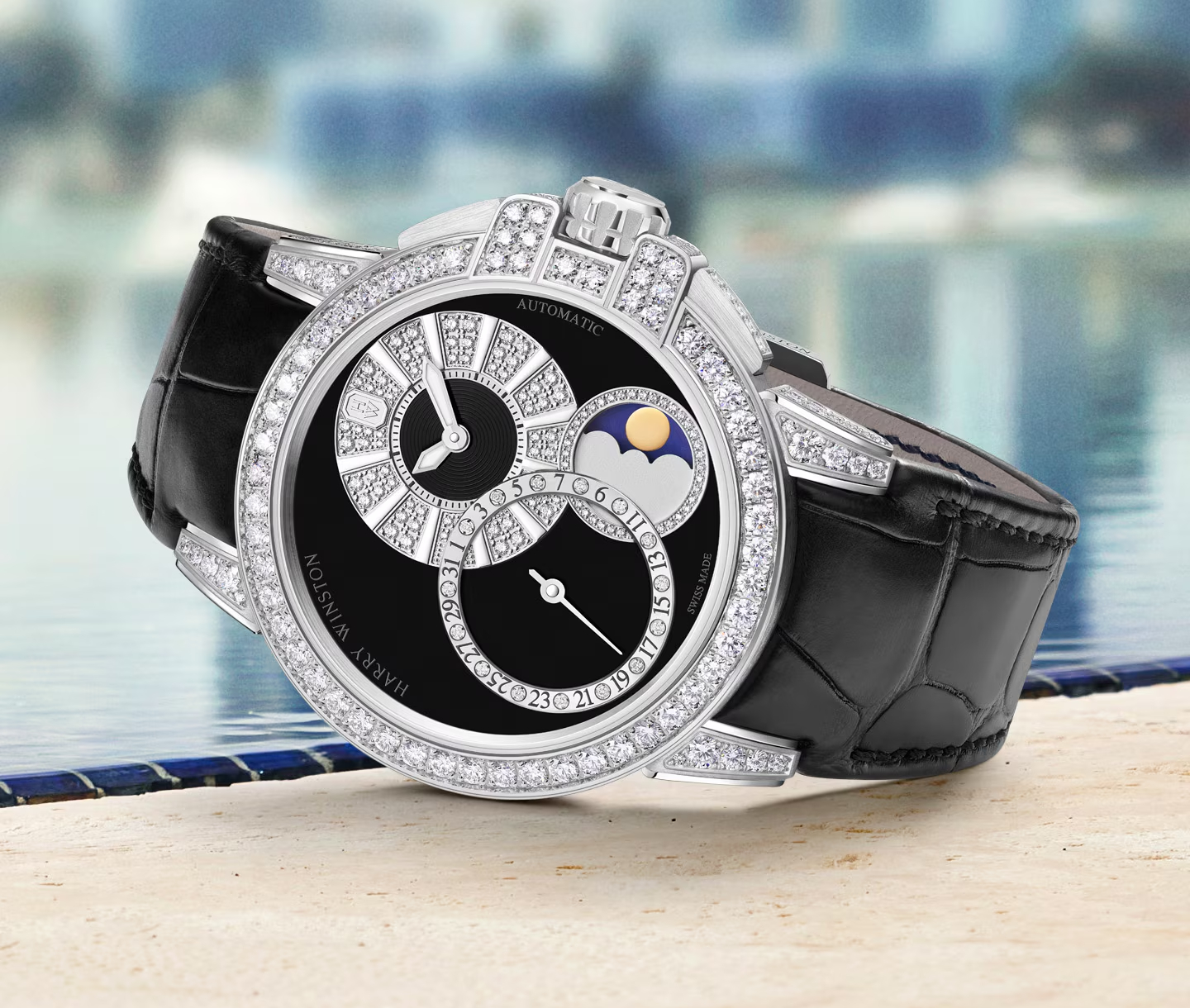 Từng khoảnh khắc trôi qua được Harry Winston tôn vinh trọn vẹn với Ocean Date Moon Phase Automatic 42mm. Kết hợp mặt số onyx đen điểm xuyết kim cương giác cắt brilliant và vỏ vàng trắng 18K, tân phẩm thu hút chú ý bằng vẻ đẹp thanh lịch đậm chất thể thao tỏa sáng trong mọi ngữ cảnh, từ chuyến phiêu lưu ngoài trời đến nhịp sống đô thị hiện đại.