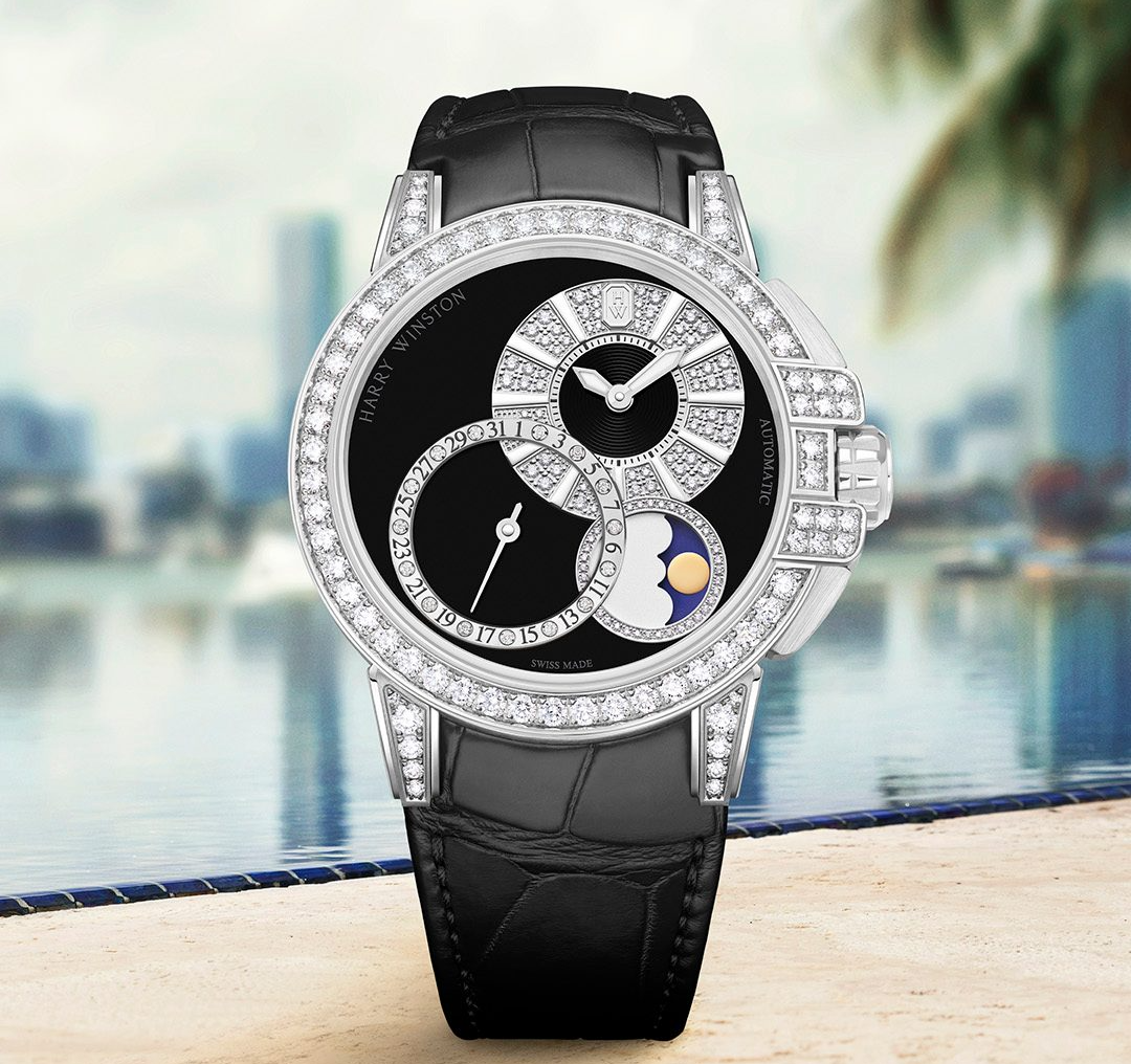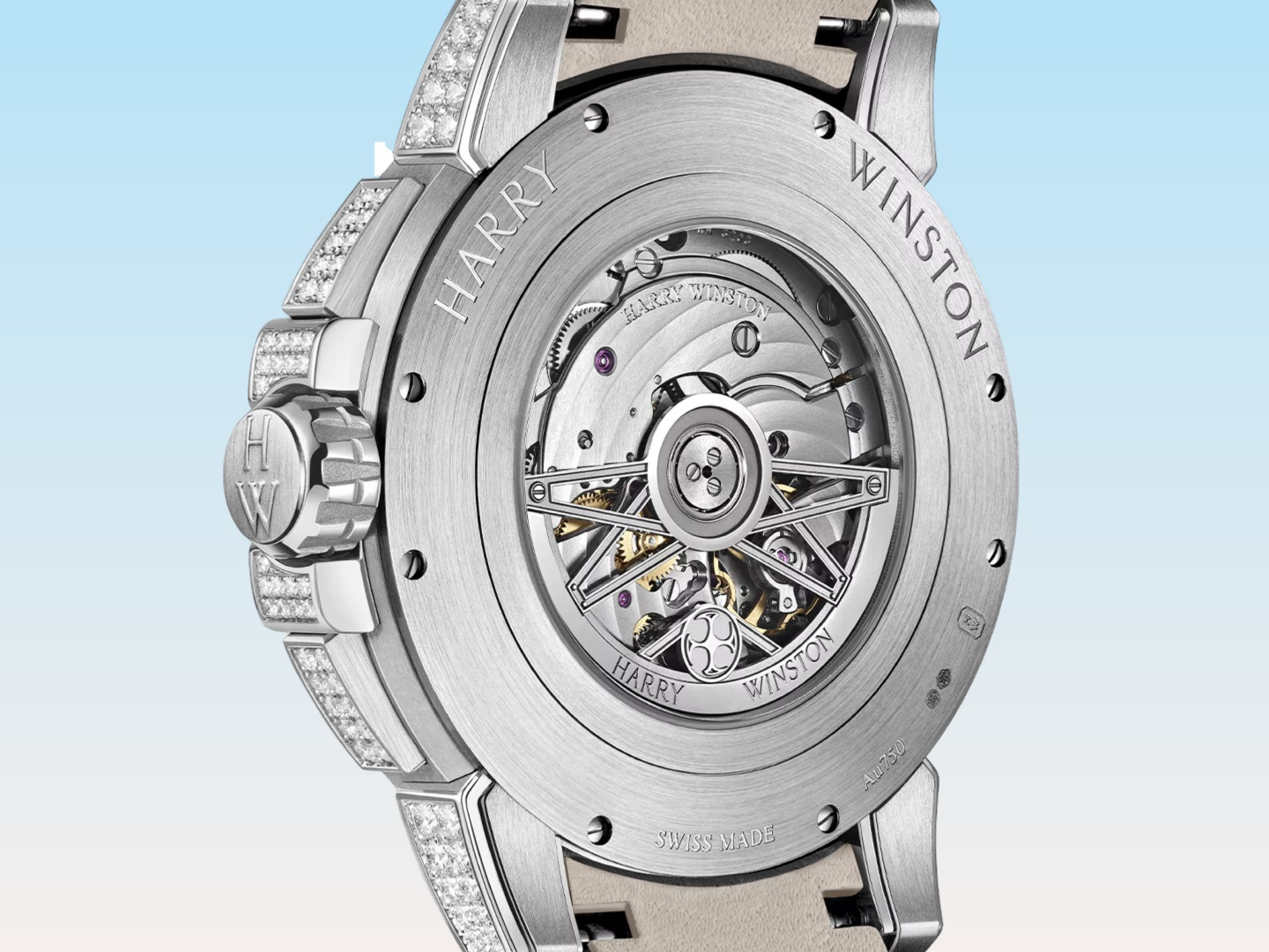 Thêm lần nữa, nghệ thuật chế tác kim hoàn đỉnh cao cùng kỹ thuật cơ học bậc thầy thông thạo bởi Harry Winston được phô diễn trọn vẹn. Nằm vừa vặn bên trong vỏ vàng trắng 18K đường kính 42mm đồng thời trưng bày hoạt động qua mặt sau kính sapphire trong suốt, Calibre HW3203 – bộ máy tự động – đảm bảo duy trì chính xác các chức năng giờ và phút lệch tâm, lịch ngày và tuần trăng.