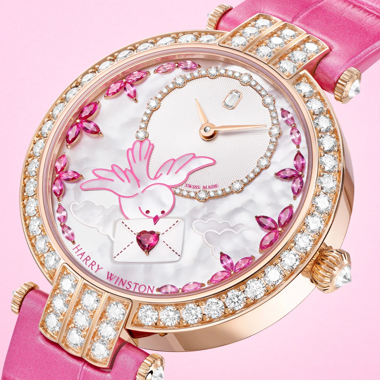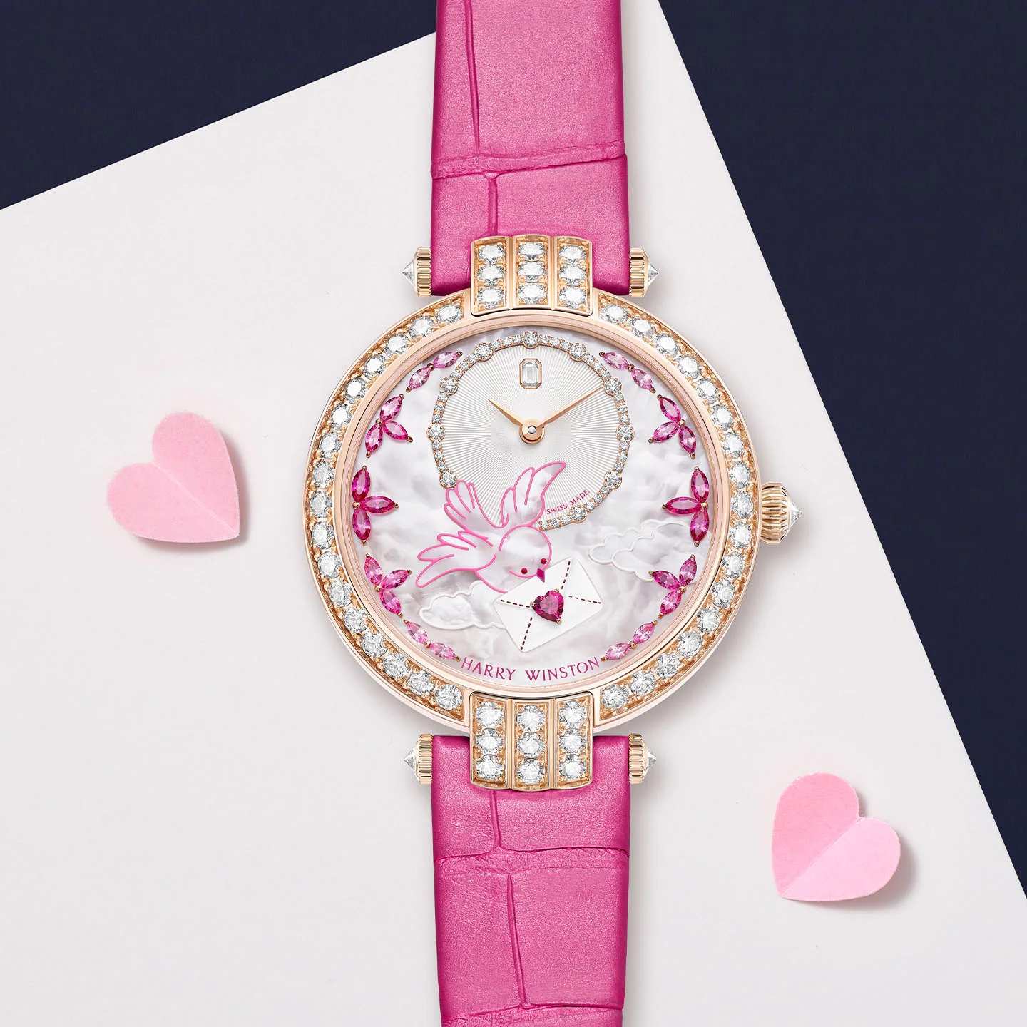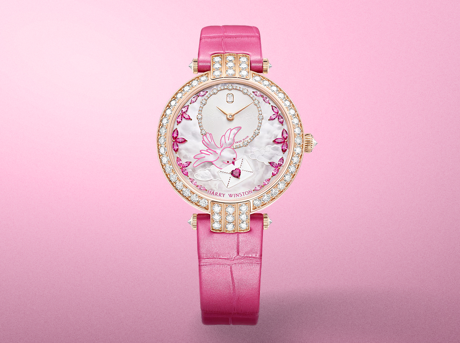 hông chỉ đóng vai trò bộ sưu tập lưu giữ khoảnh khắc đầu tiên Harry Winston bước vào vũ trụ đồng hồ cao cấp vào năm 1989, Premier đã nhanh chóng trở thành dấu ấn biểu tượng của nhà kim hoàn Hoa Kỳ. Dành riêng cho phái đẹp, bộ sưu tập chinh phục giới mộ điệu bằng ngôn ngữ sáng tạo độc bản, được thể hiện tinh tế trong từng thiết kế.Toát lên vẻ đẹp ngọt ngào, Premier Valentine’s Day Automatic 36mm ngân vang bản tình ca lứa đôi say đắm dưới góc nhìn thi vị và đầy chủ ý. Thiết kế mới khai thác hình ảnh lãng mạn của một bức thư tình, nơi mặt số trở thành không gian kể chuyện. Nổi bật trên nền xà cừ trắng beaded là hình ảnh chú chim duyên dáng mang theo thông điệp yêu thương, kết hợp cùng chi tiết lá thư phủ sơn mài với trái tim ruby giác cắt hình trái tim – biểu tượng tinh tế của cảm xúc chân thành.