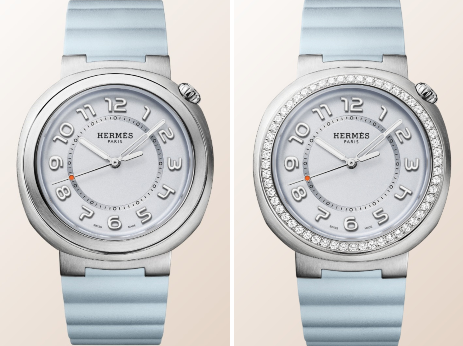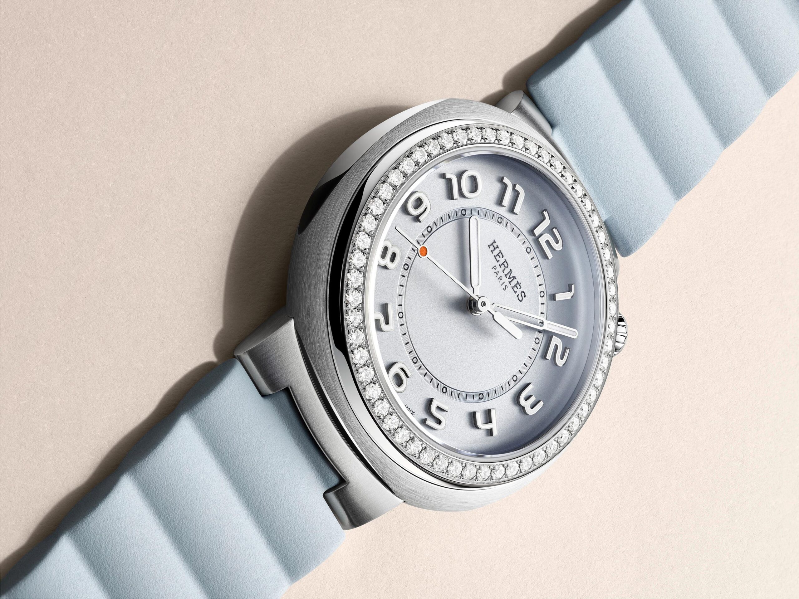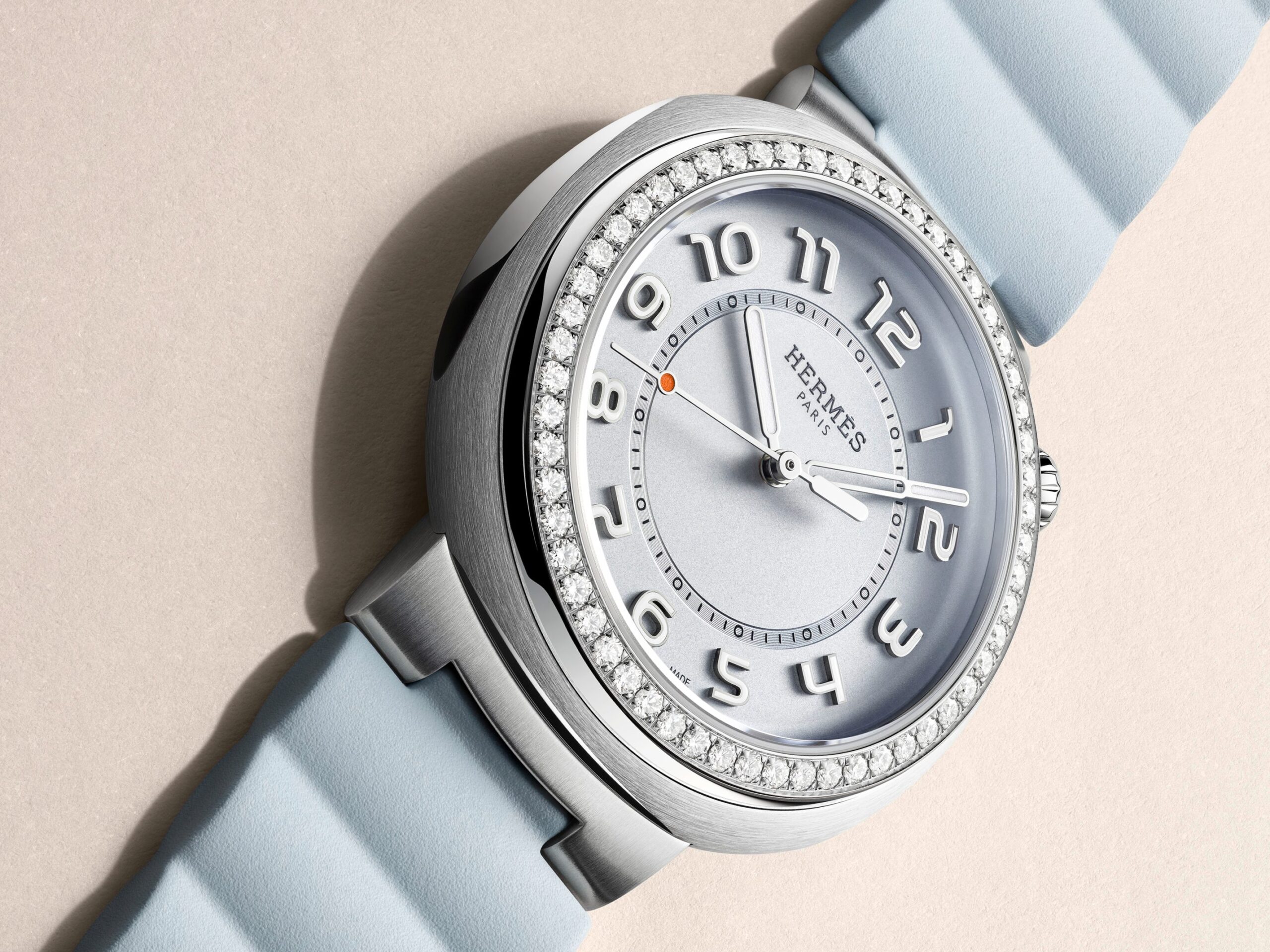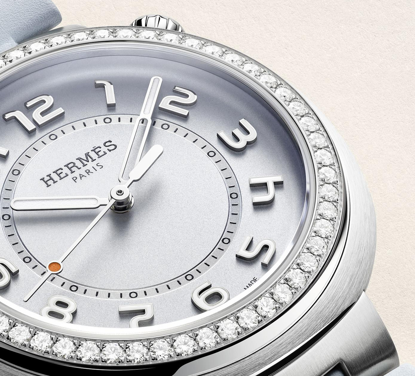 Hermès Cut mới sở hữu mặt số xanh da trời nhạt – gợi liên tưởng đến những tầng mây nhẹ nhàng trôi giữa không trung – được viền quanh bởi vành gờ thép đánh bóng trơn hoặc nạm 56 viên kim cương lấp lánh. Lặng lẽ lướt đi trên phông nền đơn giản mà tinh tế chứa bộ cọc số Ả Rập dập nổi được thiết kế với font chữ độc bản cùng vòng phút, bộ kim phủ rhodium phát quang di chuyển nhịp nhàng. Trong đó, kim giây nổi bật với chấm cam đặc trưng, tạo nên chiều sâu thị giác tinh tế.