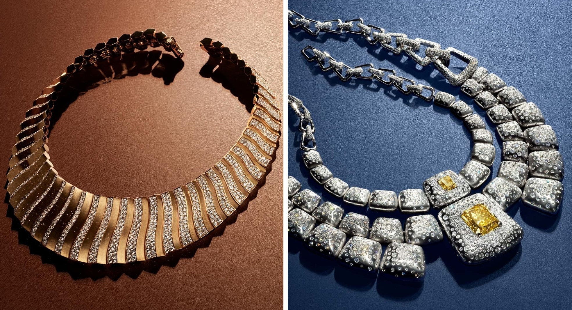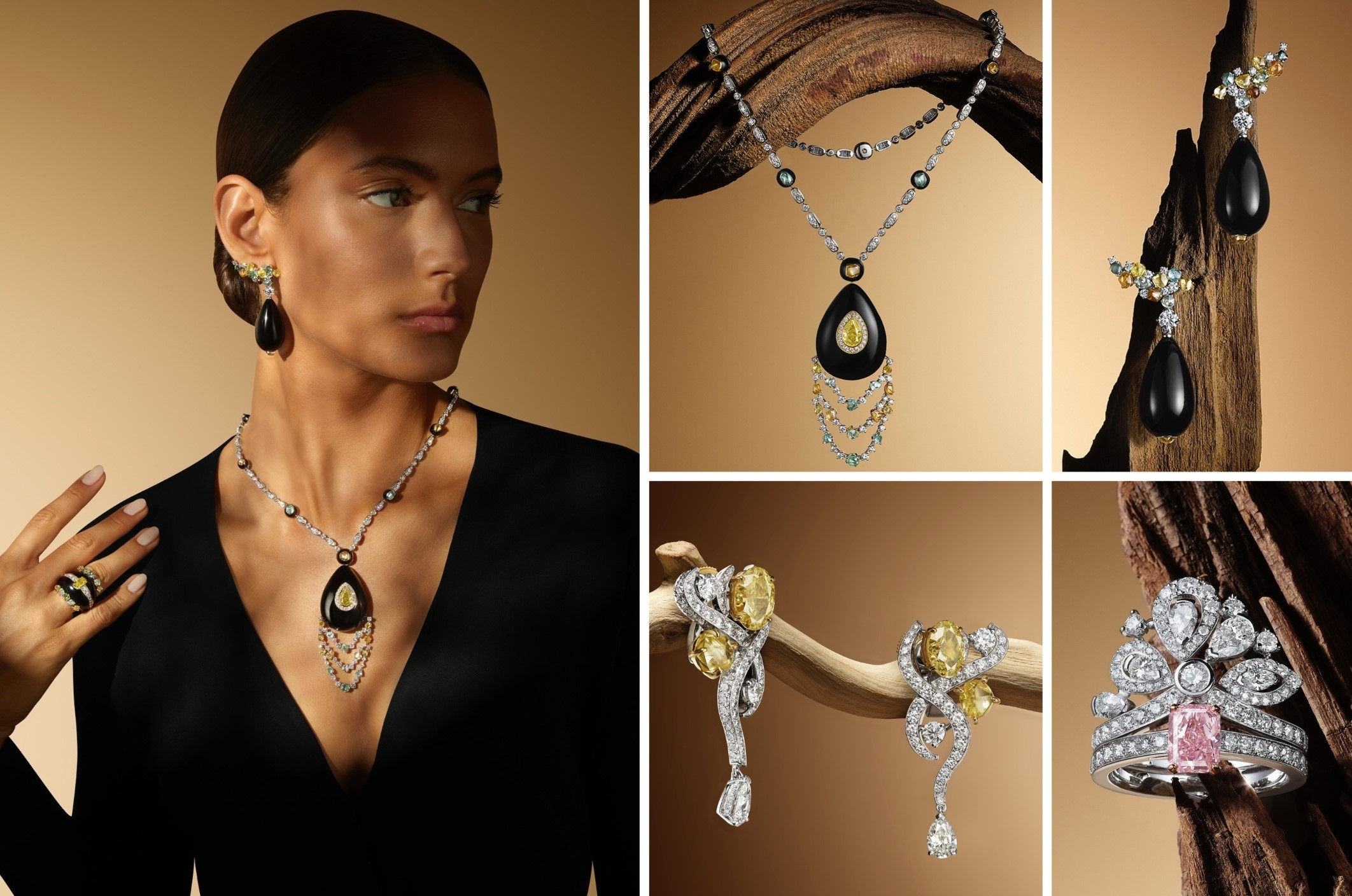 Trong Essence Of Nature: Chapter Two, De Beers tiếp tục khắc họa vẻ đẹp thiên nhiên thông qua hình tượng cây cối, biểu tượng đầy sức sống và ý nghĩa văn hóa tại các vùng đất mà hãng khai thác kim cương. Mỗi thiết kế như một lát cắt địa lý được kết nối bằng ngôn ngữ của đá quý, ánh sáng cùng cấu trúc điêu khắc tinh xảo. Gợi lên hình ảnh dẻo dai của camelthorn giữa sa mạc Namibia khô cằn, những nhành trơ lá được Camelthorn Resilience tái hiện sống động bằng vàng đánh bóng chạm vân thủ công, điểm xuyết kim cương thô trắng và nâu, tựa lớp vỏ sần sùi thách thức thời gian. Dòng chảy tiếp nối đến Botswana với Baobab Magnitude, nơi hình khối mạnh mẽ của cây bao báp sừng sững hiện ra thông qua hiệu ứng tương phản giữa đá jet đen, kim cương trắng cùng kim cương màu. Quang cảnh đầy khắc nghiệt dần nhường chỗ cho sắc tím mộng mơ của Jacaranda Bloom – lấy cảm hứng từ loài hoa Jacaranda nở rộ trên các con phố Nam Phi – gợi liên tưởng đến tán lá, hoa khẽ đung đưa trong gió. Cuối cùng, DeBeers dừng chân tại Canada với Maple Colours, cho phép hình ảnh lá phong trở nên sống động như thật, thông qua các mô-típ hình học vàng trắng, vàng hồng và vàng vàng, ôm trọn sắc đá quý cam tượng trưng mùa thu rực rỡ.