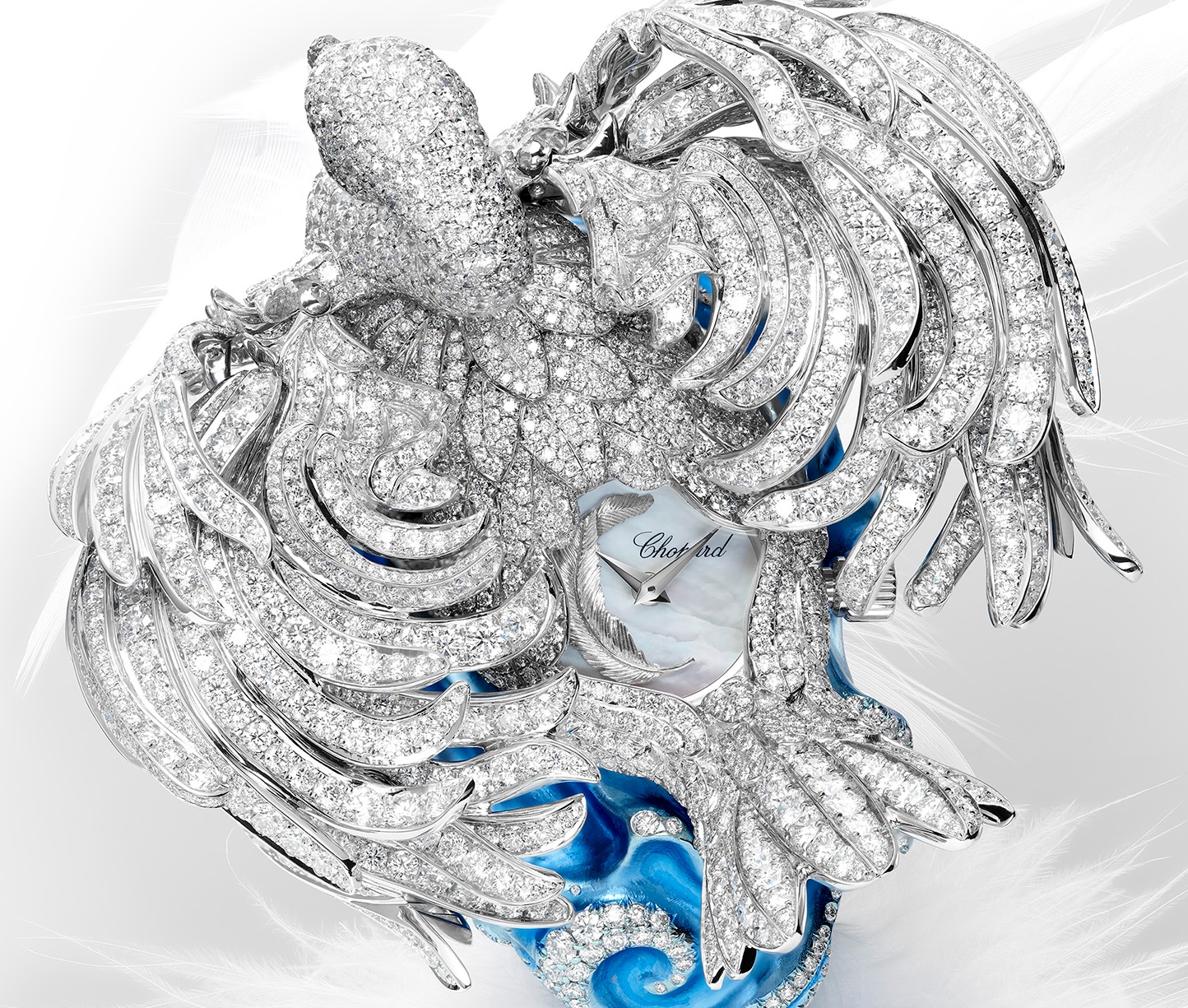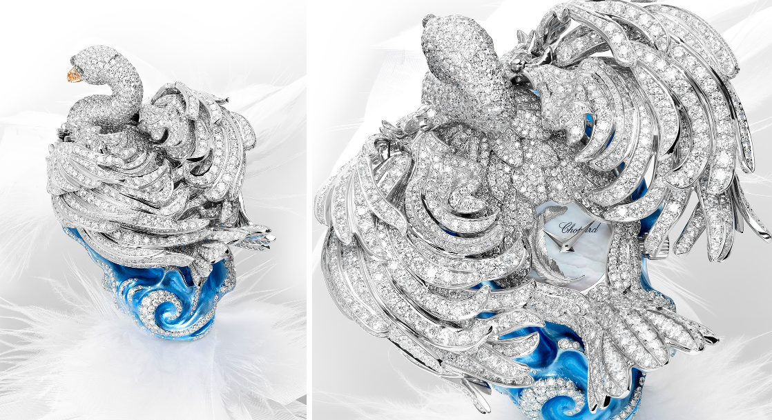 à kiệt tác đồng hồ trang sức duy nhất từ Chopard trong năm 2025, chiếc đồng hồ hóa thân hình ảnh thiên nga trắng kiêu hãnh thành một tuyệt phẩm cơ khí đậm chất thơ – Swan Lake. Ẩn dưới chiếc cổ thiên nga mềm mại là mặt đồng hồ đường kính 20.5 mm bằng xà cừ khắc họa tiết lông vũ, chỉ hiện ra khi phần đầu xoay về vị trí trung tâm và cơ chế mở cánh được kích hoạt, ba lớp cánh xếp mở dần, như một điệu múa ballet thanh thoát. Toàn bộ vỏ đồng hồ được chế tác từ vàng trắng, vàng vàng 18K và titanium, gắn 35.09 carat đá quý gồm kim cương trắng – đen và đá spessartite màu cam ấm. Bộ máy cơ lên dây cót tay Calibre 10.01-C với độ dày chỉ 8.7 mm và trữ cót 45 giờ là trái tim mảnh mai của thiết kế này. Dây đeo satin viền lông vũ trắng, cố định bằng khóa kim hình lông vũ bằng vàng trắng, là điểm kết tinh giữa nghệ thuật kim hoàn đỉnh cao và sự dịu dàng bất tận của thiên nhiên.