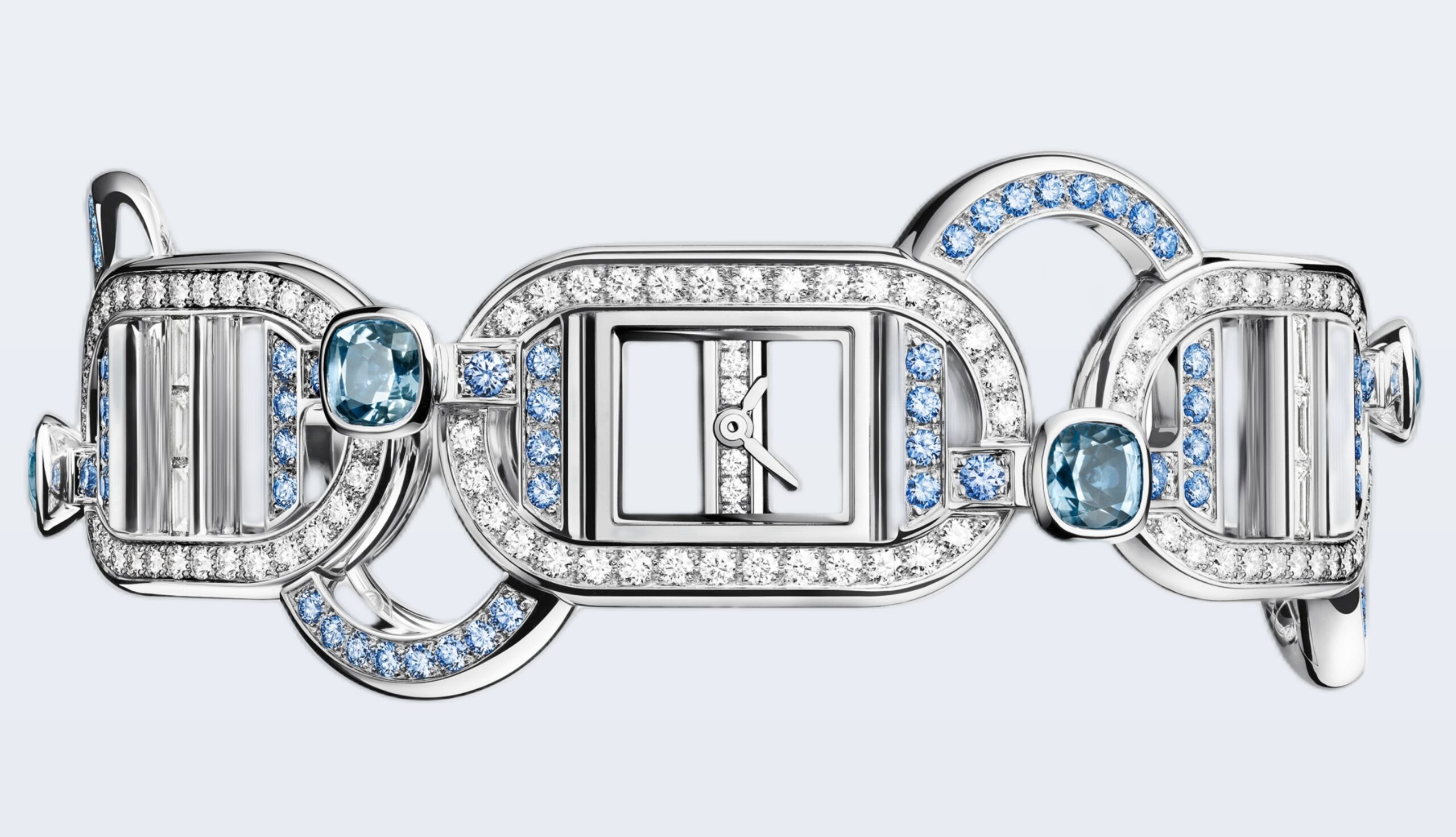 Với thiết kế táo bạo mang đậm tính điêu khắc, Hermès Maillon Libre với mã tham chiếu Ref. 408289WW00 là một tuyên ngôn nghệ thuật đích thực trên cổ tay. Dáng vỏ chữ nhật cách điệu 16.5 x 27.7mm bằng vàng trắng được kết nối bằng các mắt xích tựa như chuỗi nữ trang cao cấp, tạo nên hiệu ứng chuyển động mềm mại đầy cuốn hút. Mặt số tối giản ẩn mình trong sự lấp lánh của 188 viên kim cương (3.98 ct), 114 viên sapphire xanh (2.53 ct) và 4 viên tourmaline (3.350 carat), được sắp đặt tinh tế như một bản hòa âm ánh sáng, vừa tinh xảo nhưng cũng vừa không phô trương. Bộ máy quartz mang lại sự tiện dụng nhẹ nhàng, phù hợp với những quý cô yêu cái đẹp và trân trọng sự chính xác. Maillon Libre không đơn thuần là đồng hồ, mà là hiện thân của tinh thần haute joaillerie đương đại mà Hermès theo đuổi: nơi thời gian trở thành trang sức, và trang sức kể câu chuyện vượt ngoài thời gian.
