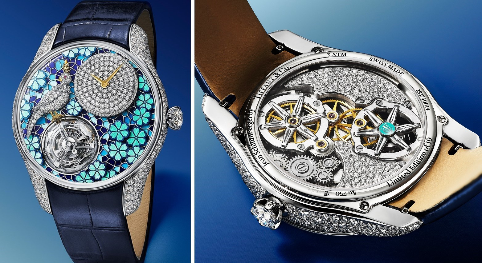 Kiệt tác tourbillon này là tuyệt phẩm kết tinh giữa nghệ thuật kim hoàn đỉnh cao và kỹ thuật chế tác đồng hồ thượng hạng. Giới hạn chỉ 10 chiếc trên toàn cầu, thiết kế này lấy cảm hứng từ huyền thoại “Bird on a Rock” của Jean Schlumberger, nổi bật với mặt số đa tầng phủ men champlevé, hoa sơn mài thủ công và flying tourbillon được bảo vệ bởi tinh thể sapphire trong suốt. Chú chim nhỏ bằng vàng 18K nạm 70 viên kim cương yêu cầu đến hơn 40 giờ chế tác công phu. Tổng thể đồng hồ được điểm xuyết bởi 771 viên kim cương với trọng lượng hơn 3.8 carat, khẳng định di sản chế tác đá quý gần hai thế kỷ của Tiffany & Co. Vận hành siêu phẩm tuyệt đẹp này là bộ máy lên dây thủ công Caliber AFT24T01 dự trữ năng lượng trong 50 giờ. Cuối cùng, dây da cá sấu xanh đậm hoàn thiện ngoại diện đẳng cấp của thiết kế.