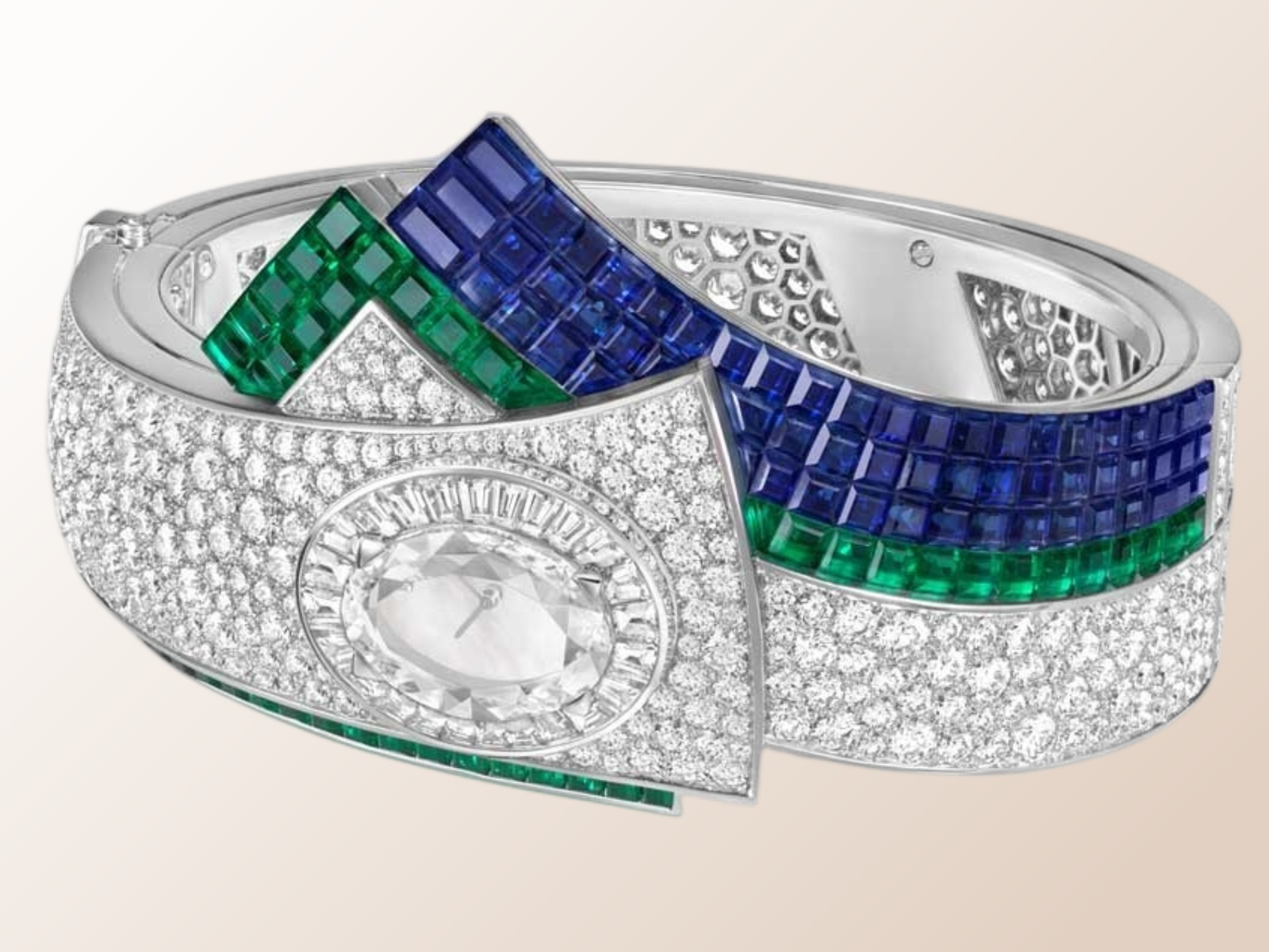 Lấy cảm hứng từ thế giới thời trang cao cấp, Ruban Mystérieux tái hiện sự tinh tế của dải ruy băng duyên dáng quấn quanh cổ tay quý cô xinh đẹp. Ở trung tâm của tác phẩm, một viên kim cương DIF 3,72 carat bầu dục nằm trên mặt đồng hồ, để lộ giờ và phút nhờ độ tinh khiết đến tuyệt hảo. Trên tuyệt phẩm này, vàng trắng được che giấu khéo léo và kín đáo bên dưới lớp phủ kim cương nhờ cách nạm đá snow-set, đồng thời tôn lên sắc thái phong phú của đá sapphire và ngọc lục bảo được gắn kết theo kỹ thuật Mystery Set. Được cấp bằng sáng chế bởi Maison vào năm 1933, kỹ thuật tinh xảo mang tính biểu tượng này cho phép sắp đặt các viên đá lên những thanh ray bằng vàng. Đá quý được cắt tỉ mỉ sẽ che phủ hoàn hảo bề mặt ray, mang đến cho tác phẩm hiệu ứng rạng rỡ như một tấm lụa nhung. Chiếc đồng hồ vận hành nhờ bộ máy cơ lên dây cót bằng tay có kích thước nhỏ, vốn đòi hỏi độ chính xác cao khi lắp vào vỏ.