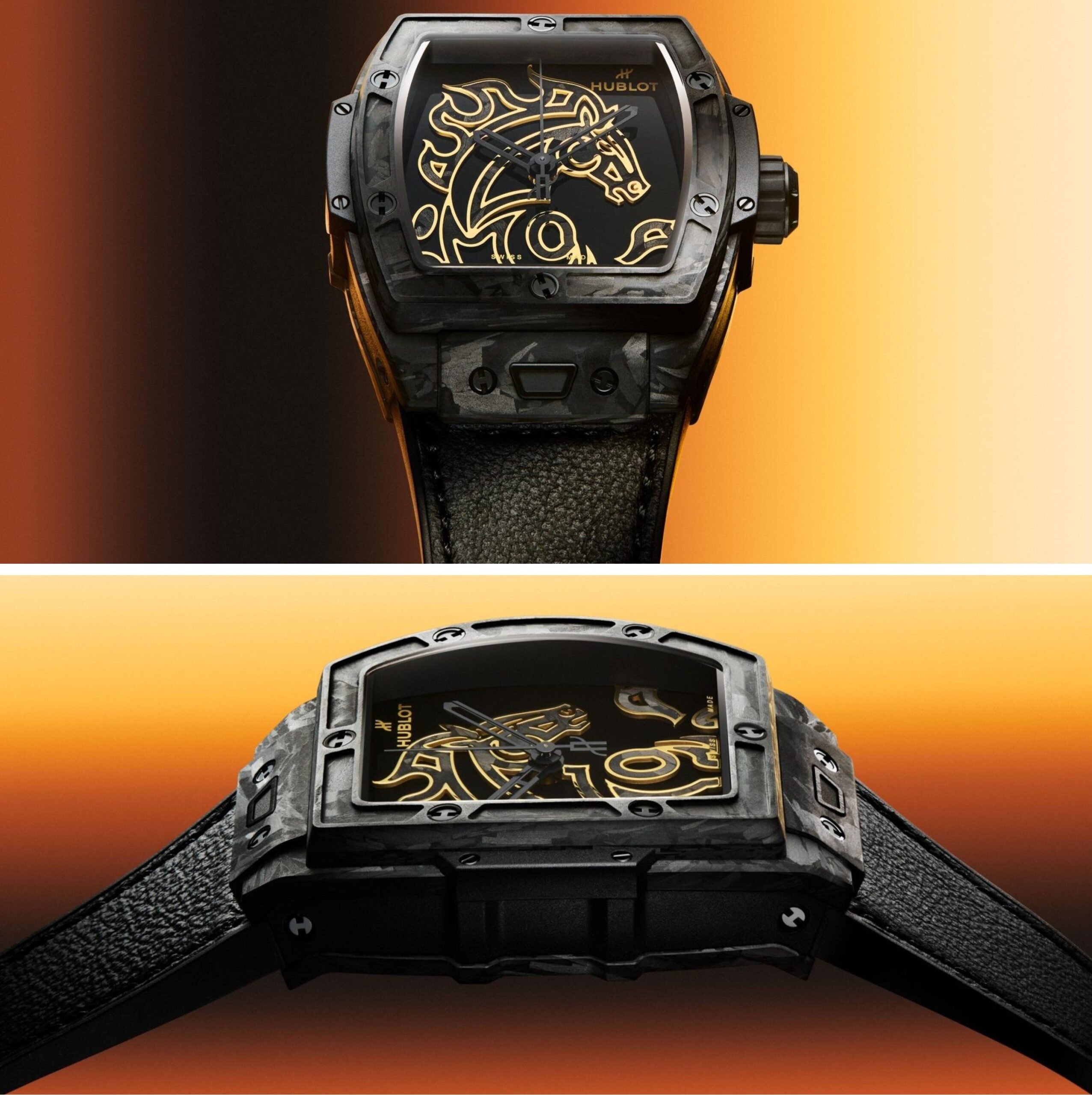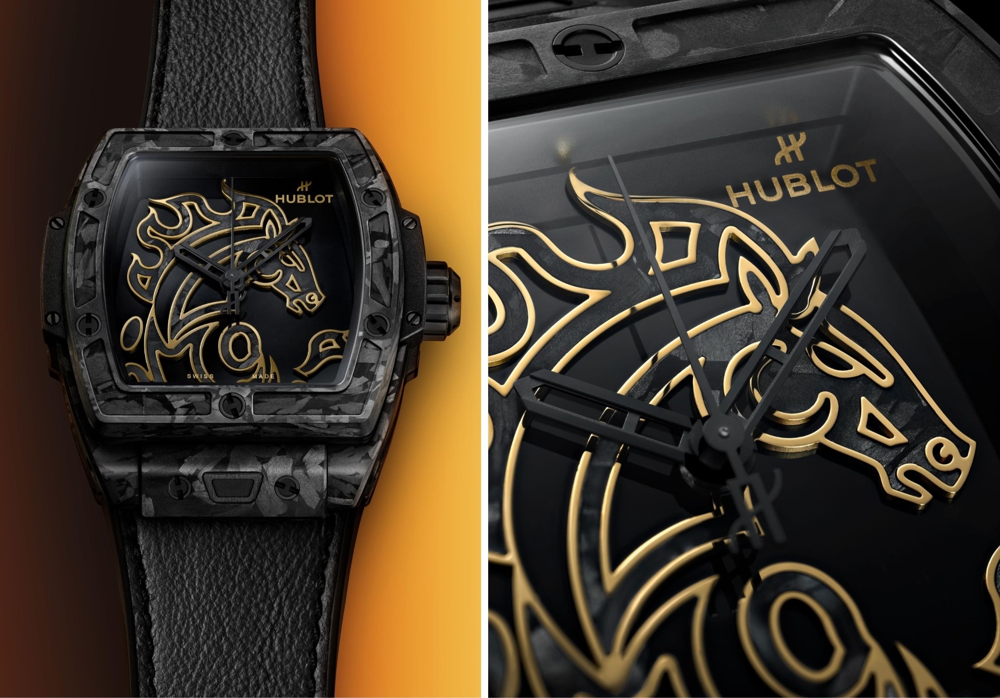 hia sẻ về chiếc đồng hồ mới, CEO Hublot – ông Julien Tornare cho biết: “Thiết kế này thể hiện khát vọng đổi mới vượt qua mọi khuôn mẫu của chúng tôi. Với Spirit of Big Bang Year of the Horse, chúng tôi biến carbon và vàng thành nghệ thuật điêu khắc, và chuyển hóa biểu tượng thành độ chính xác kỹ thuật. Bởi lẽ, chúng tôi làm chủ vật liệu cũng như làm chủ thời gian theo cách không giới hạn”.Hublot nâng carbon – một trong những vật liệu hiệu suất cao chủ lực – lên tầm dấu ấn thị giác độc quyền. Mặt số kết hợp khảm carbon thủ công cùng các chi tiết đồng mạ vàng 3N tạo hình chú ngựa. Theo đó, mỗi mảnh carbon đều được cắt, căn chỉnh, lắp ráp thủ công, thể hiện sự làm chủ tuyệt đối đối với một trong những vật liệu khó xử lý nhất ngành đồng hồ hiện đại. Những đường vàng ba chiều, lấy cảm hứng từ nghệ thuật thêu trên trang phục nghi lễ cổ Trung Hoa, mang lại sự hiện diện mạnh mẽ cho hình tượng ngựa.