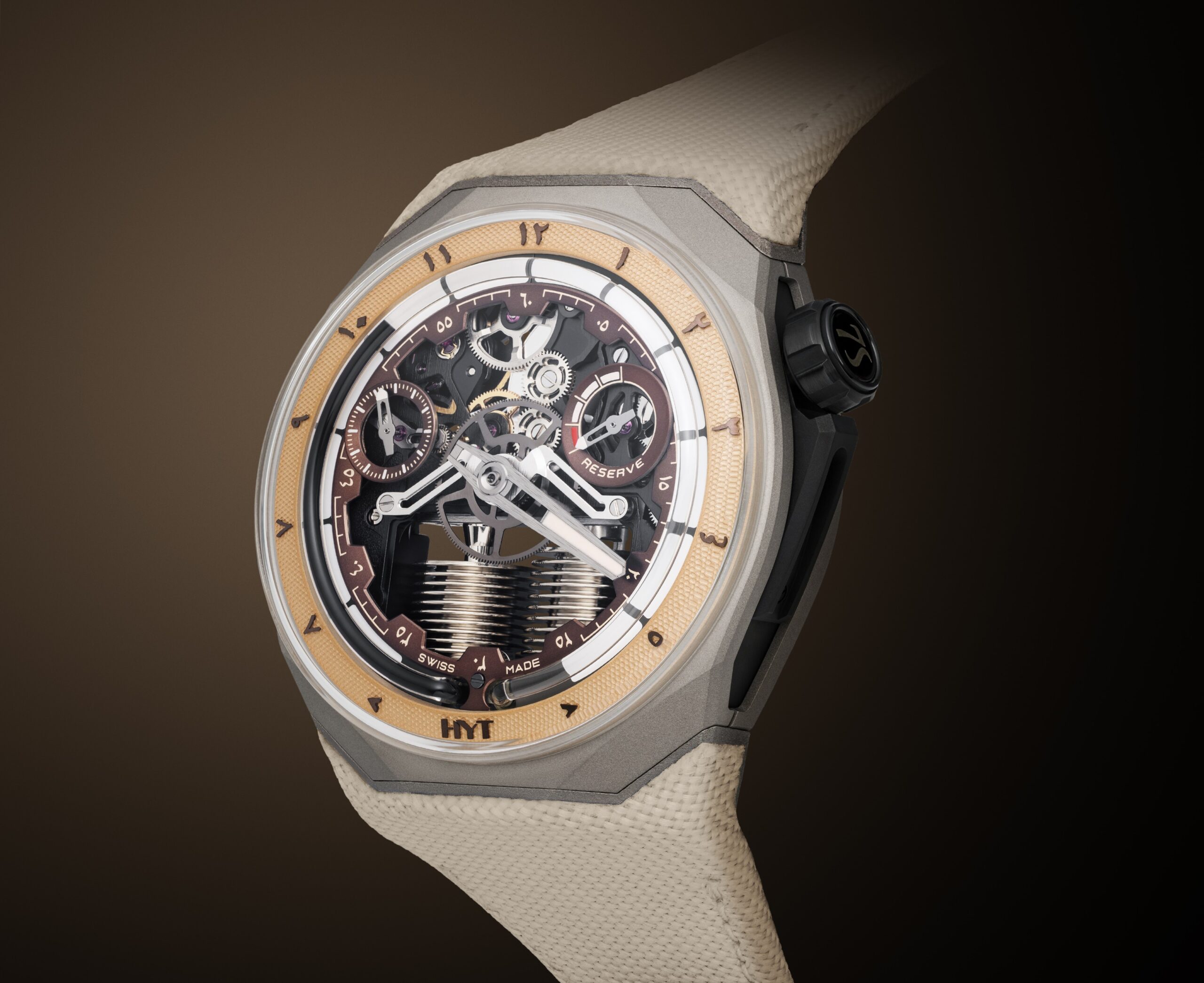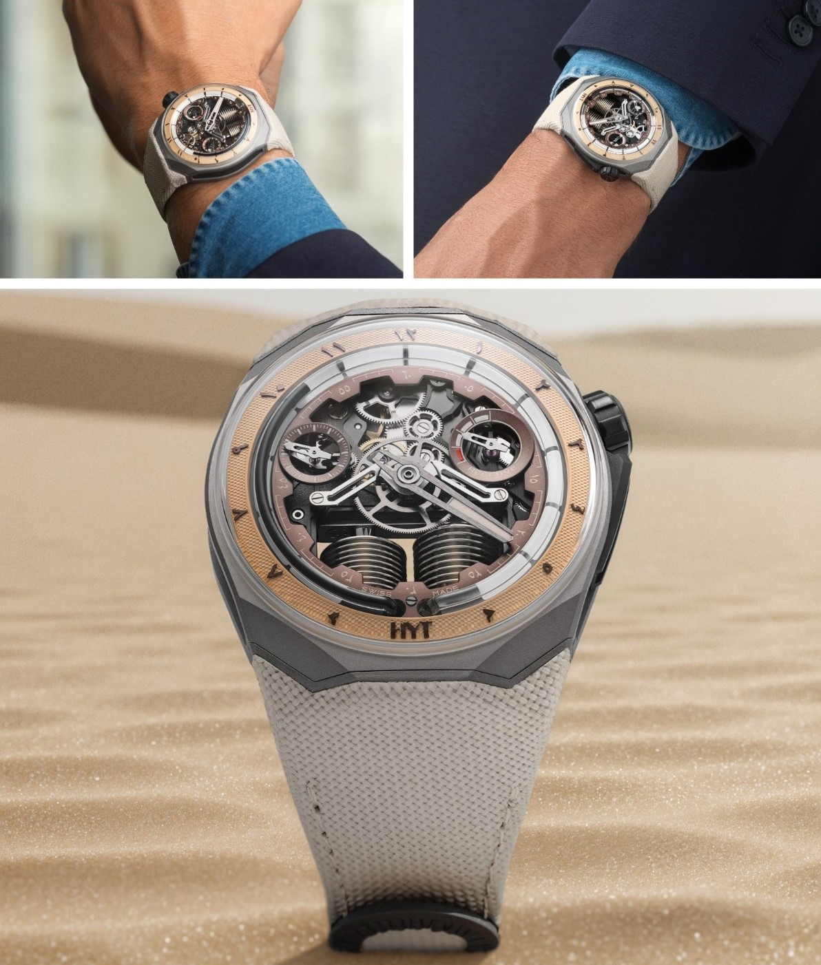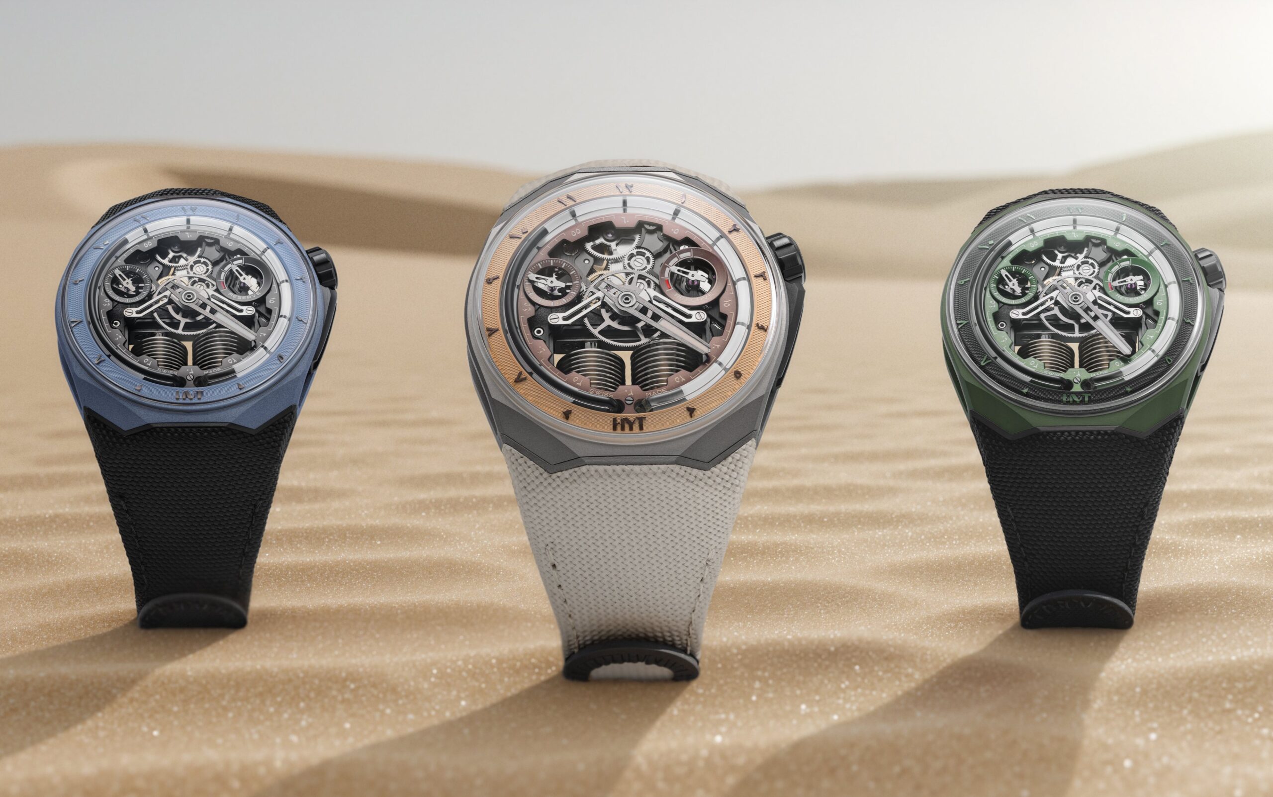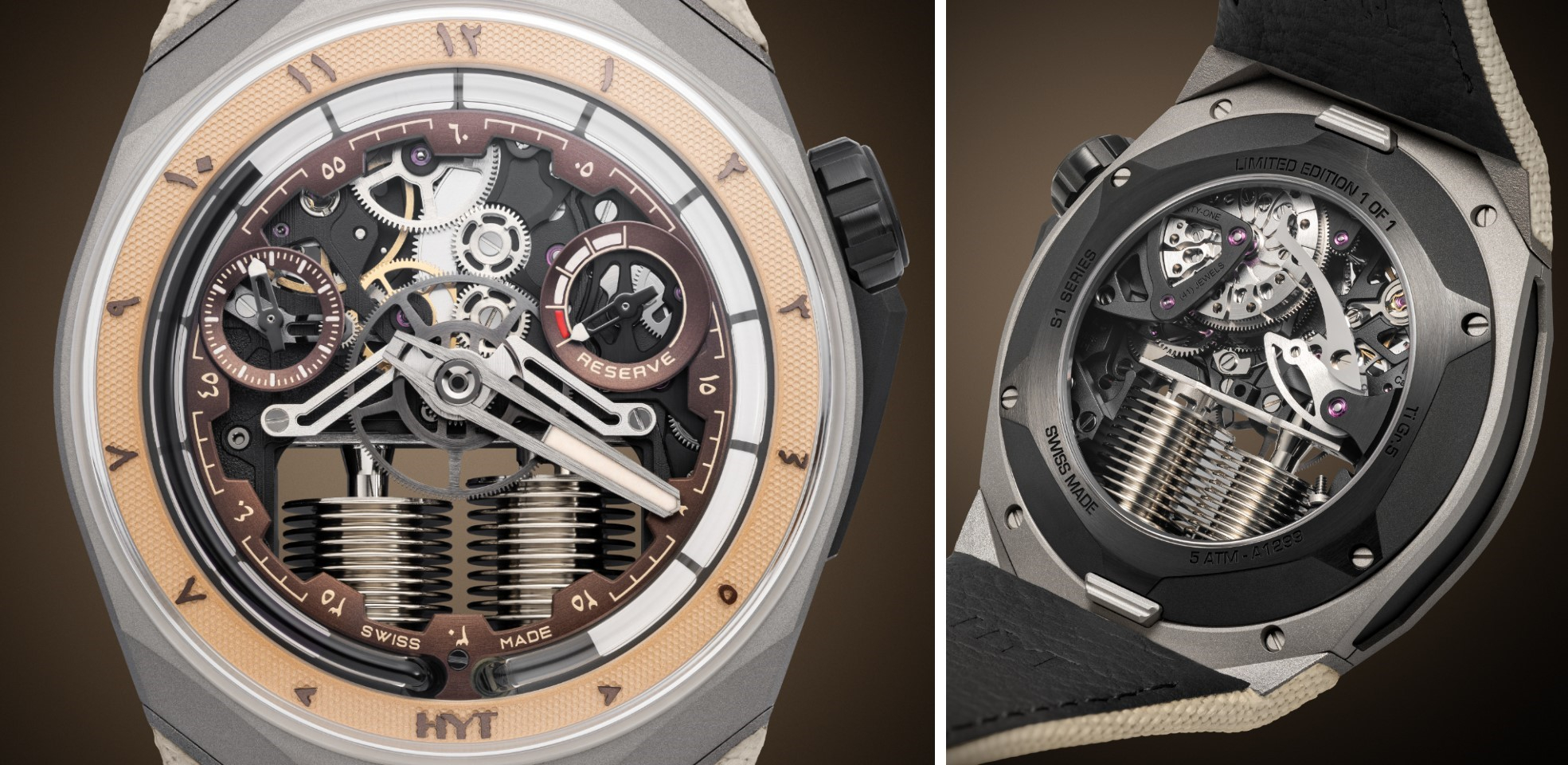 Kỹ nghệ thủy cơ học Thụy Sỹ hòa quyện cùng di sản Trung Đông trong ba tuyệt tác độc bản thuộc dòng S1 Bespoke Edition: Titanium Green, Titanium Blue và Titanium Sand. Tự hào mang hệ số Ả Rập cổ cùng ký tự “7S” chạm khắc, bộ ba “cỗ máy thời gian” HYT thuật lại câu chuyện về di sản, tầm nhìn, thành công rực rỡ suốt 75 năm qua của Ahmed Seddiqi & Sons, nhà phân phối đồng hồ cùng xa xỉ phẩm hàng đầu Dubai.
