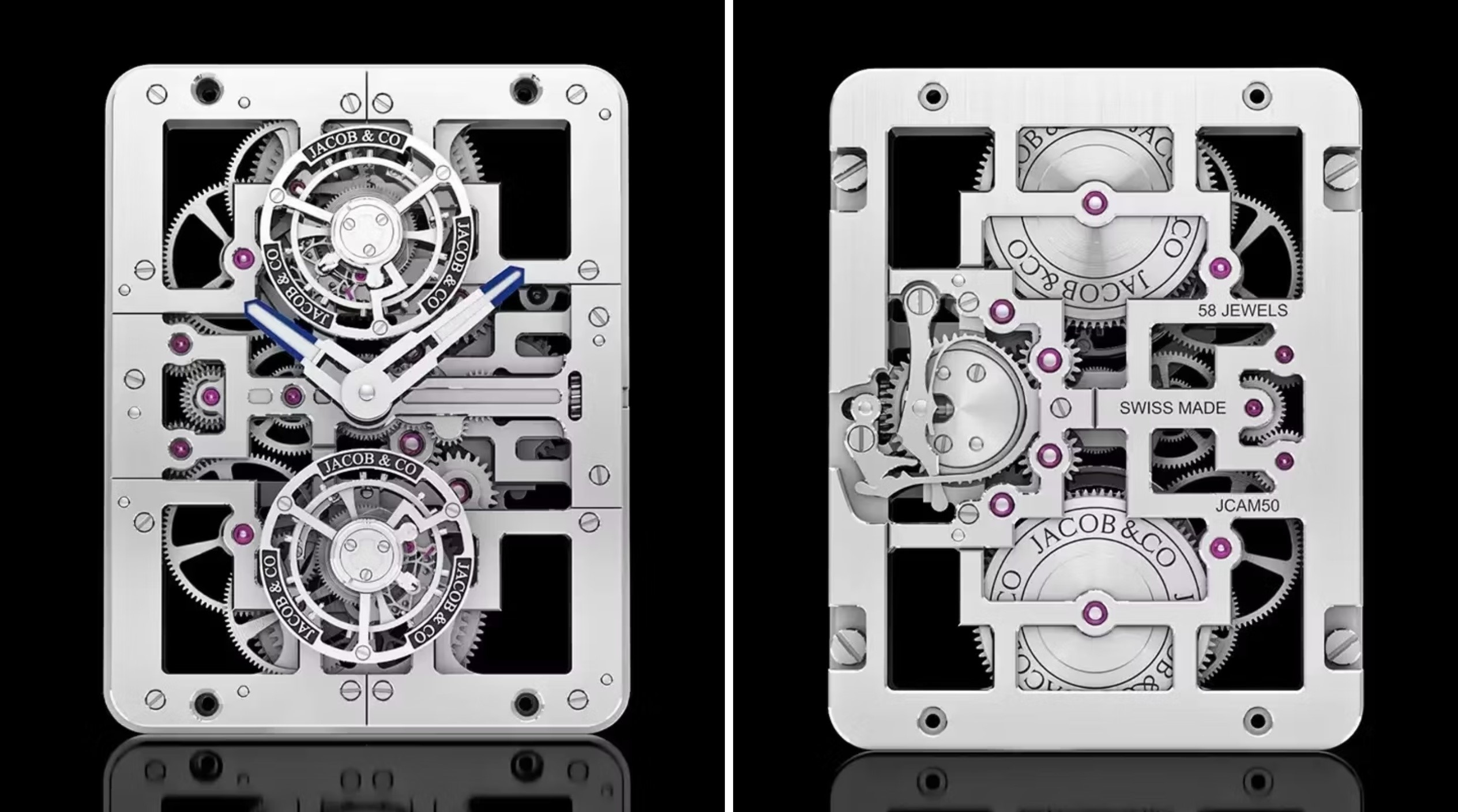 Trên vỏ cùng mặt số bằng vàng trắng, 298 viên kim cương với tổng trọng lượng gần 79 carat tạo nên một trường ánh sáng liền mạch, không ngắt quãng. Bên dưới lớp hào quang rực rỡ, Calibre JCAM50 vận hành hai flying tourbillon lần lượt chiếm ngự vị trí 12 và 6 giờ.