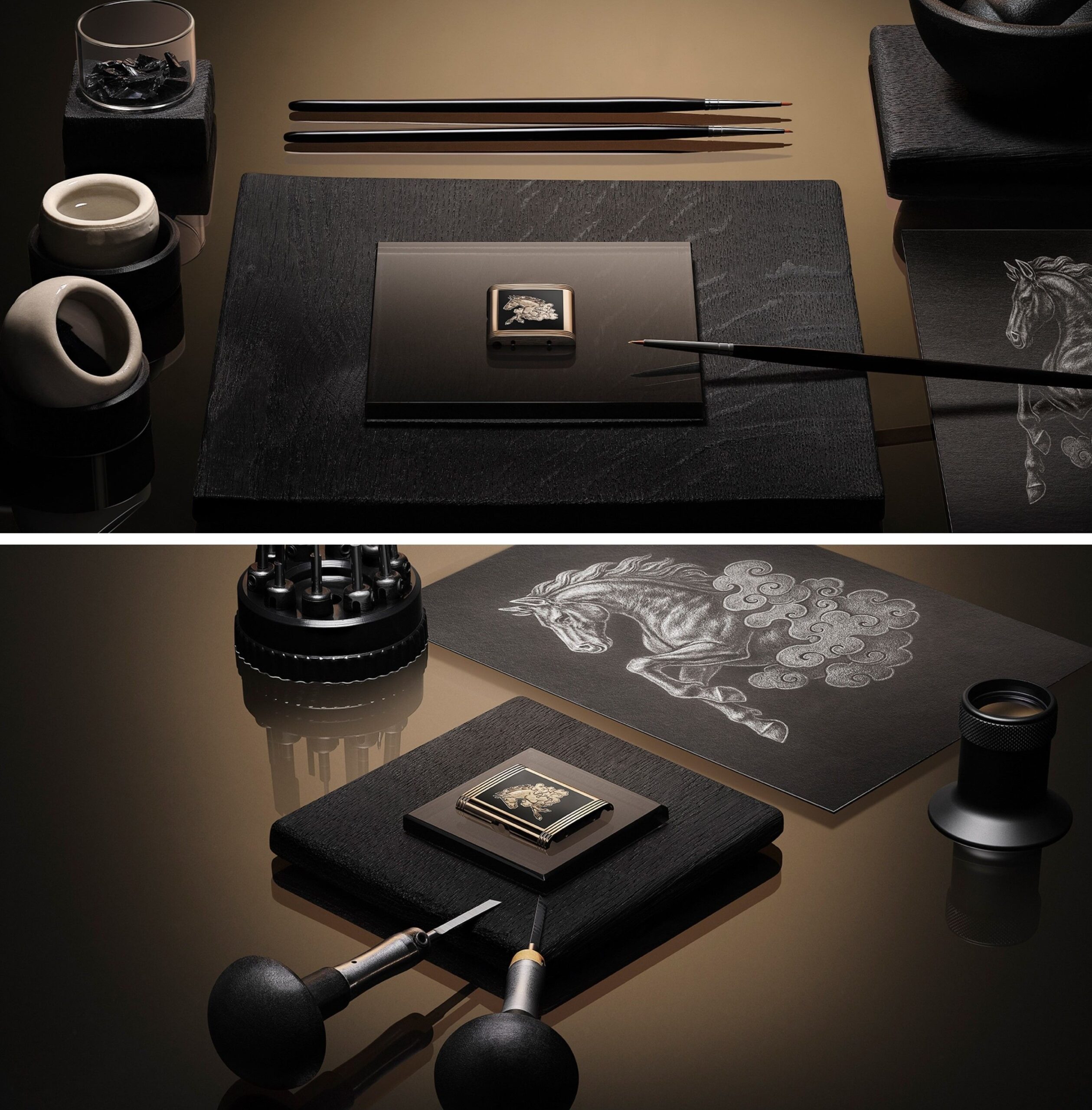 Giữ vai trò nhân vật trung tâm vỏ sau, hình ảnh chú ngựa uy nghi được chạm khắc thủ công, với phần đầu cùng hai chân trước như đang bật khỏi những đám mây vàng lơ lửng giữa không trung. Bao quanh chủ thể, lớp men Grand Feu đen mờ, tôn lên ánh bóng của các bề mặt ngựa đánh bóng tinh xảo. Những chi tiết tương phản trên bờm, mõm và móng vẽ tay bằng rhodium đen tạo nên vẻ sống động vô ngần. Ảo giác chuyển động càng tăng cường nhờ kết cấu phun cát trên các đám mây.