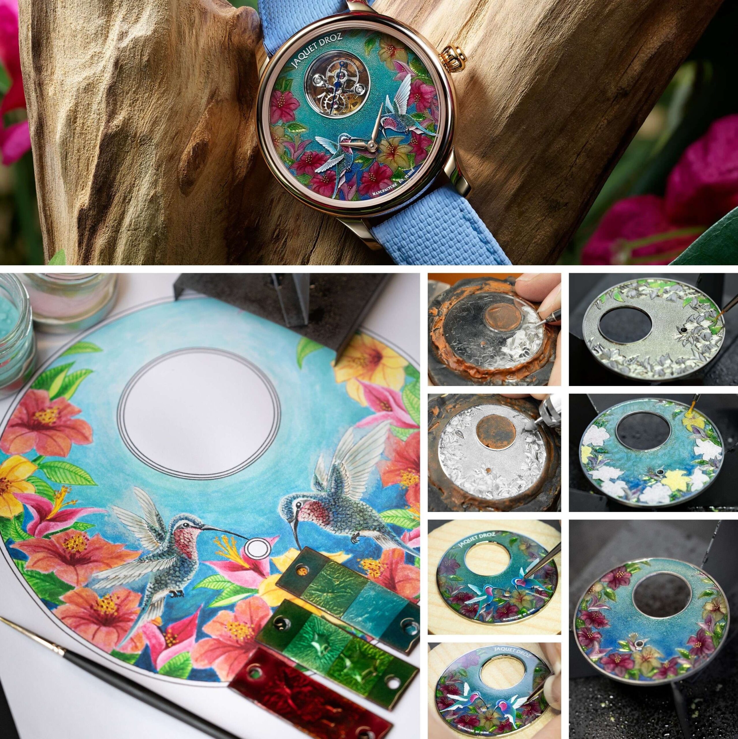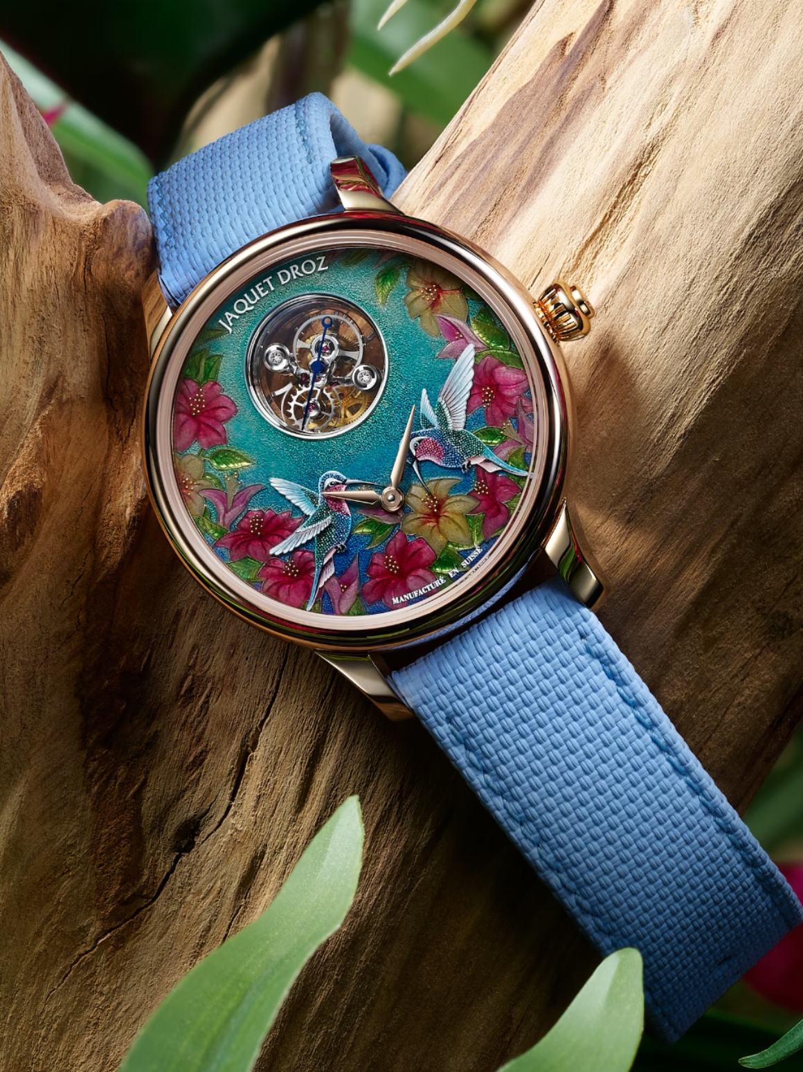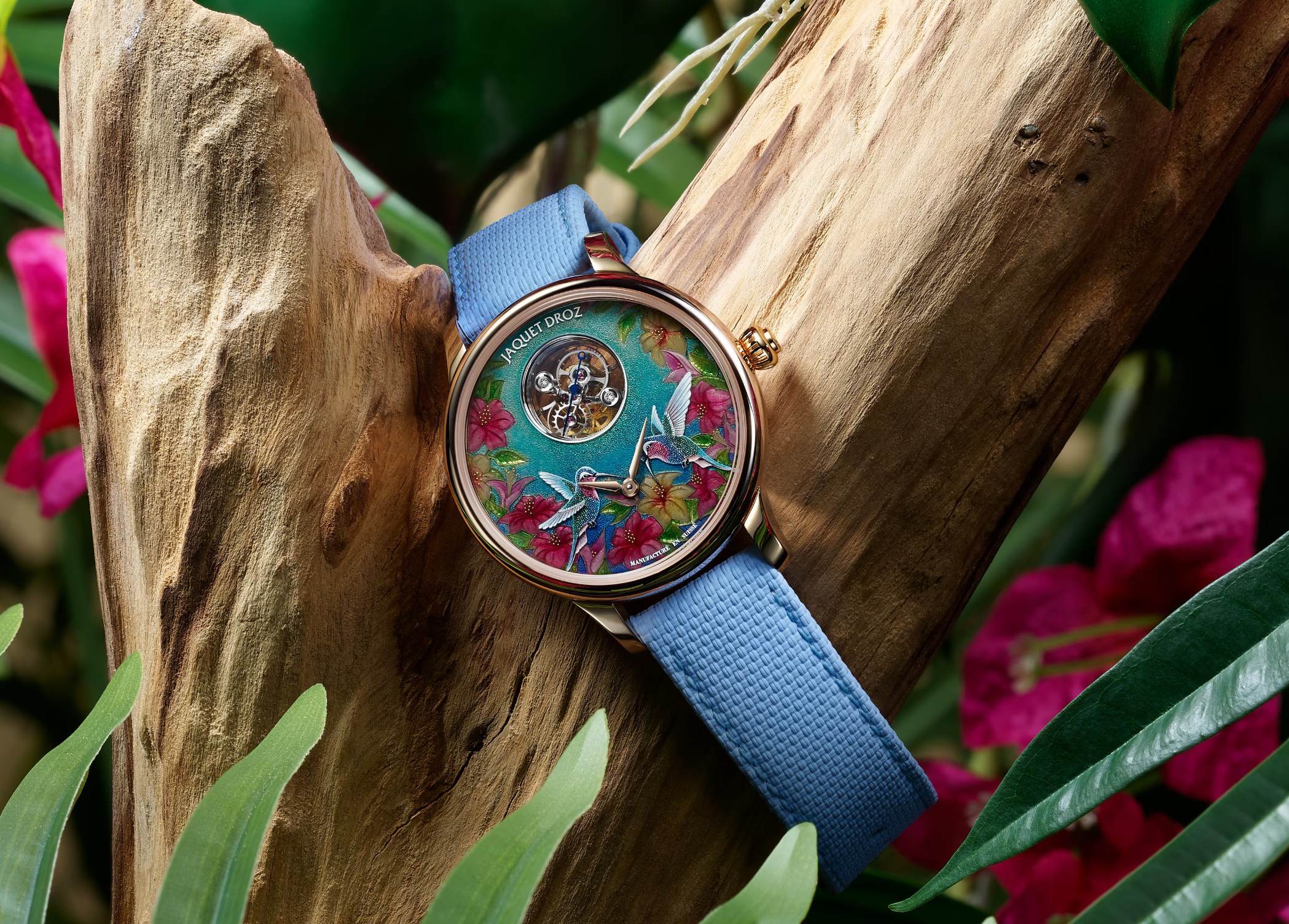 iện gây chú ý với những sáng tạo mang tinh thần “Disruptive Legacy”, nhưng Jaquet Droz chưa bao giờ lãng quên di sản thẩm mỹ của mình. Hiện thực hóa yêu cầu của một nhà sưu tầm tầm sành sỏi, đội ngũ nghệ nhân đã tạo nên Petite Heure Minute Red Gold – Hummingbird, một tác phẩm độc nhất nhằm tôn vinh chủ nhân.Chiếc đồng hồ hội tụ nhiều dấu ấn đặc trưng của Jaquet Droz, trước hết là chủ đề tự nhiên, thể hiện qua hai chú chim hút mật trên những đóa dâm bụt – gợi nhắc mối quan tâm của giới học giả Thời Khai sáng đối với thảo mộc cùng thực vật học. Chim chóc đã hiện diện trong thế giới Jaquet Droz từ năm 1738, thông qua nghệ thuật vẽ, khắc, tạo hình động, đặt trong lồng hay hộp để mê hoặc các vị hoàng đế và giới quý tộc.