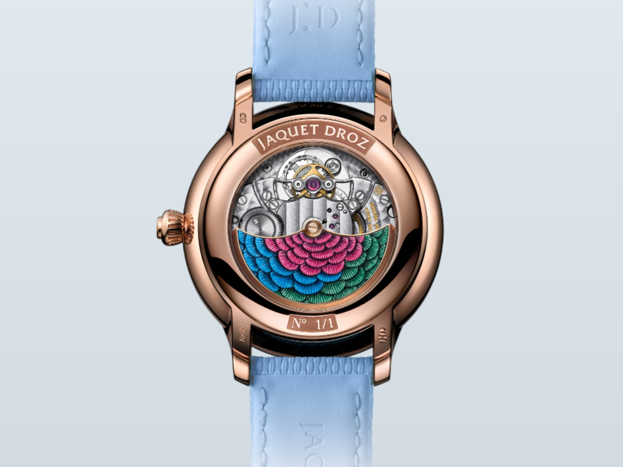 Tại vị trí 12 giờ, tourbillon như “lơ lửng” với lồng và cầu sapphire trong suốt. Được cấp bằng sáng chế năm 1801, khi Jaquet Droz đã là một Maison thịnh đạt, tourbillon không ngừng tiến hóa, chứng minh giá trị về độ chính xác cùng tính tự chủ. Petite Heure Minute Red Gold – Hummingbird trang bị bộ thoát silicon, giúp ổn định trước biến thiên môi trường, cùng 7 ngày năng lượng dự trữ. Trở thành trung tâm mặt sau, rotor vàng 18K chạm khắc kết hợp sơn theo sắc lông đôi chim hút mật phía trước mặt số, hoàn thiện một kiệt tác dung hòa hoàn hảo giữa kỹ thuật và nghệ thuật.