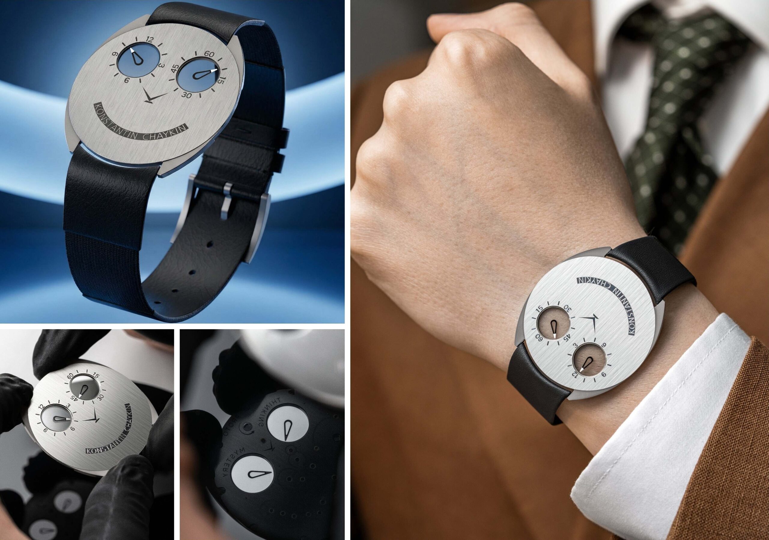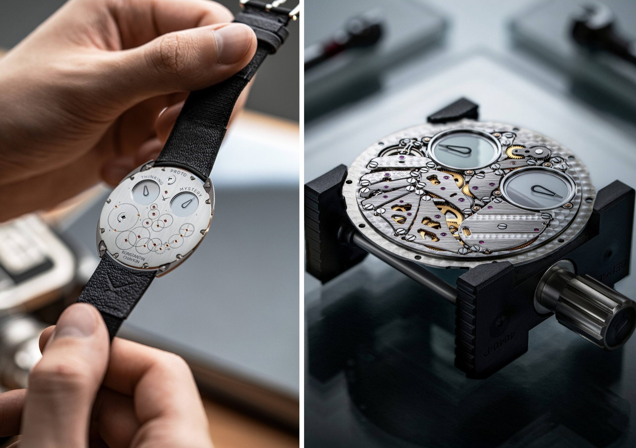 Khác với phiên bản độc bản siêu mỏng từng lập kỷ lục trước đó, ThinKing Mystery được phát triển từ hai nguồn cảm hứng. Thiết kế vẫn giữ lại tinh thần của dòng Joker huyền thoại – mẫu đồng hồ mang tính nhận diện cao nhất của Konstantin Chaykin. Tuy nhiên, lần này, diện mạo được bổ sung một chi tiết mang tính định hình: “đôi mắt” giờ đây hoàn toàn trong suốt, với các thanh ngang biến mất khỏi cấu trúc. Ở phiên bản mới, cơ chế truyền động ngang vận hành trực tiếp các đĩa sapphire nguyên khối, qua đó loại bỏ sai số đảo trục ngay từ thiết kế. Độ ổn định tiếp tục được tăng cường nhờ ba con lăn bố trí quanh mỗi chỉ báo, dẫn hướng chuyển động và đưa sai số đảo kính tiệm cận về mức bằng không, đồng thời giảm thiểu tổn hao năng lượng từ hộp cót.