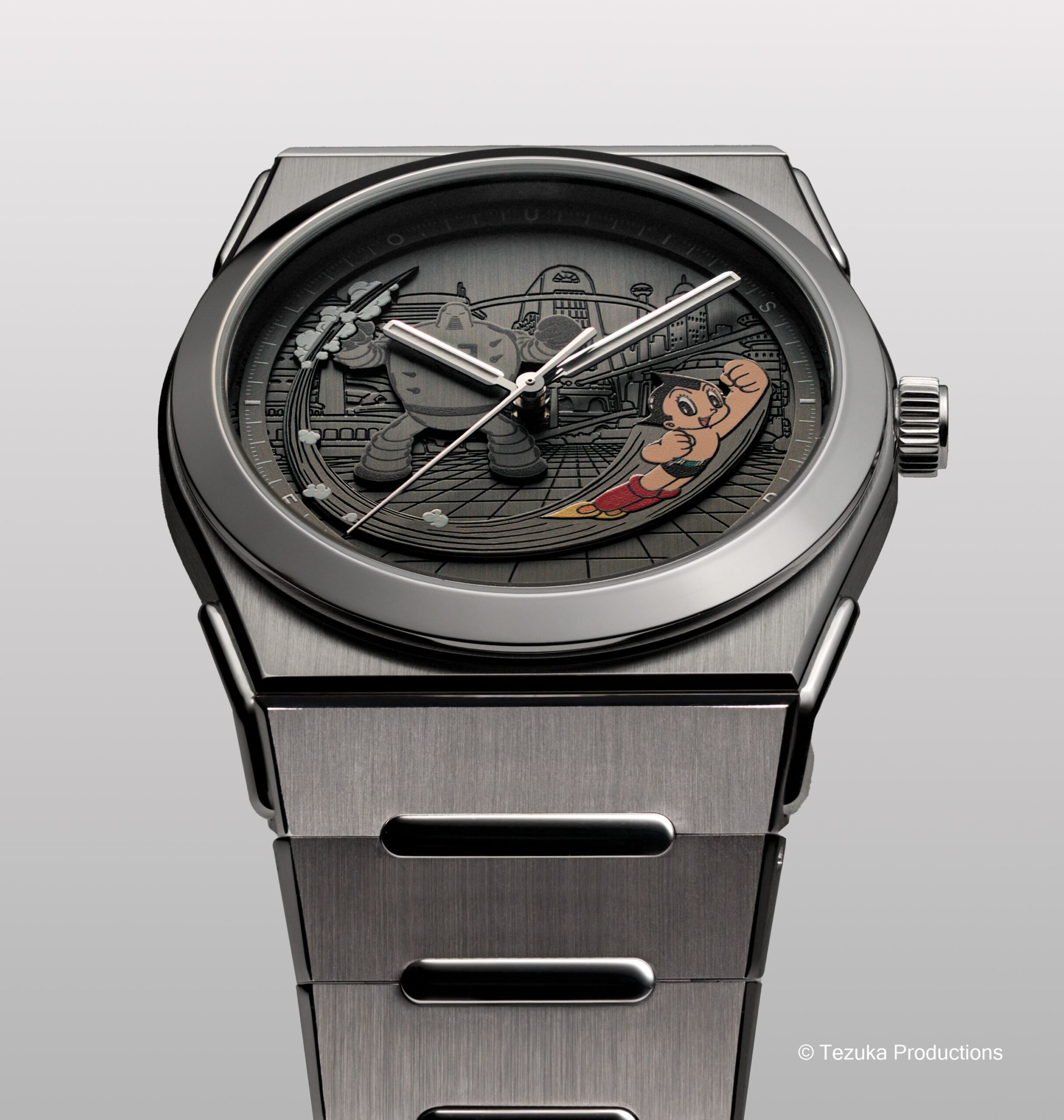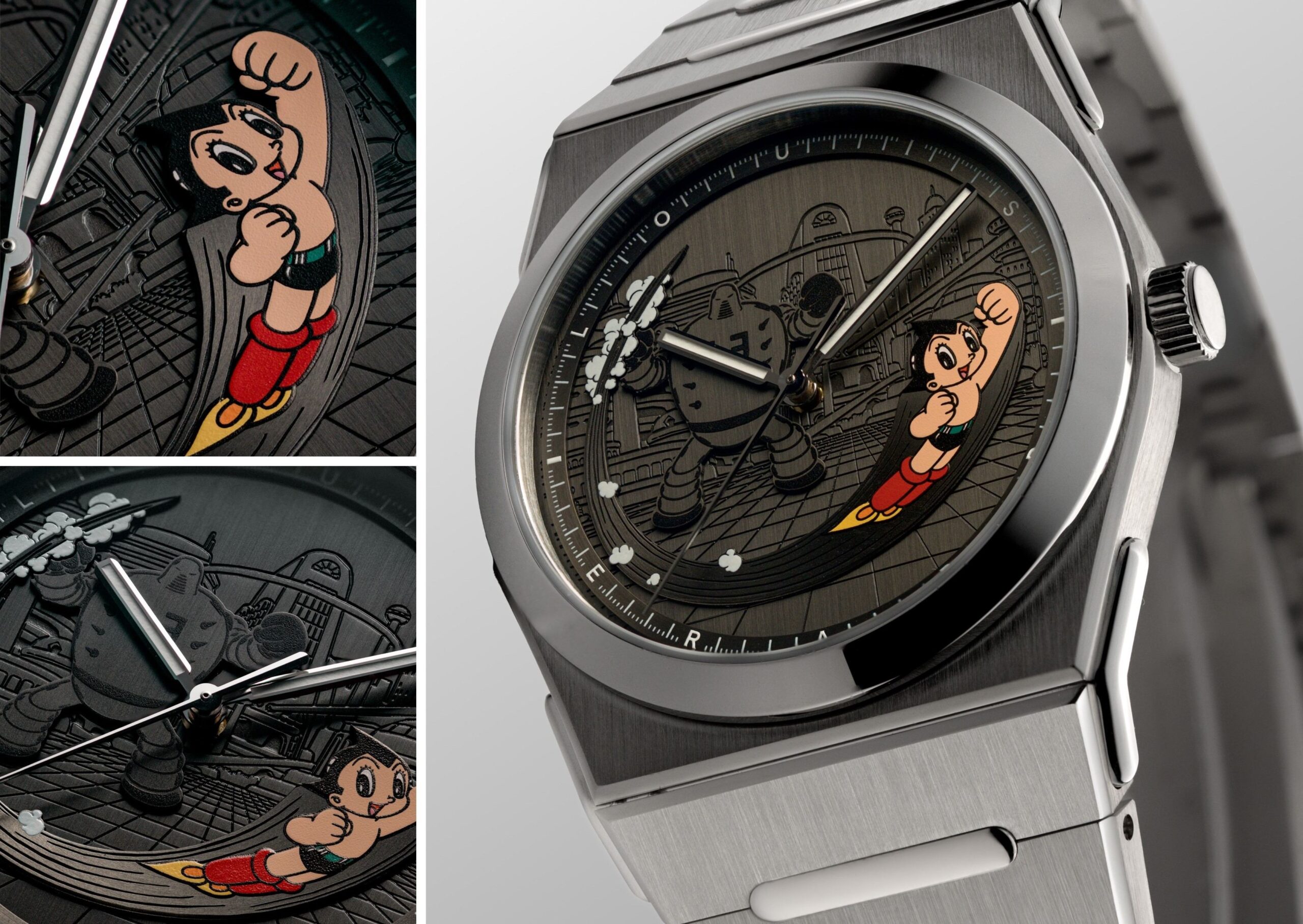 Trong khi đó, khung cảnh Metro City chiếm khoảng không gian từ vị trí 6 đến 12 giờ, tái hiện thế giới nơi câu chuyện bắt đầu. Bao quanh khung cảnh, vòng rehaut nhô cao mang vạch phút trắng phủ Super-LumiNova® SLN-C1 hiển thị tên Louis Erard phát sáng xanh, tái hiện ánh sáng của tương lai. Nhấn mạnh hơn nữa mối quan hệ hợp tác, mặt sau mang hình khắc riêng như lời tri ân đến di sản cùng lý tưởng mà Astro Boy đã chiến đấu để bảo vệ.