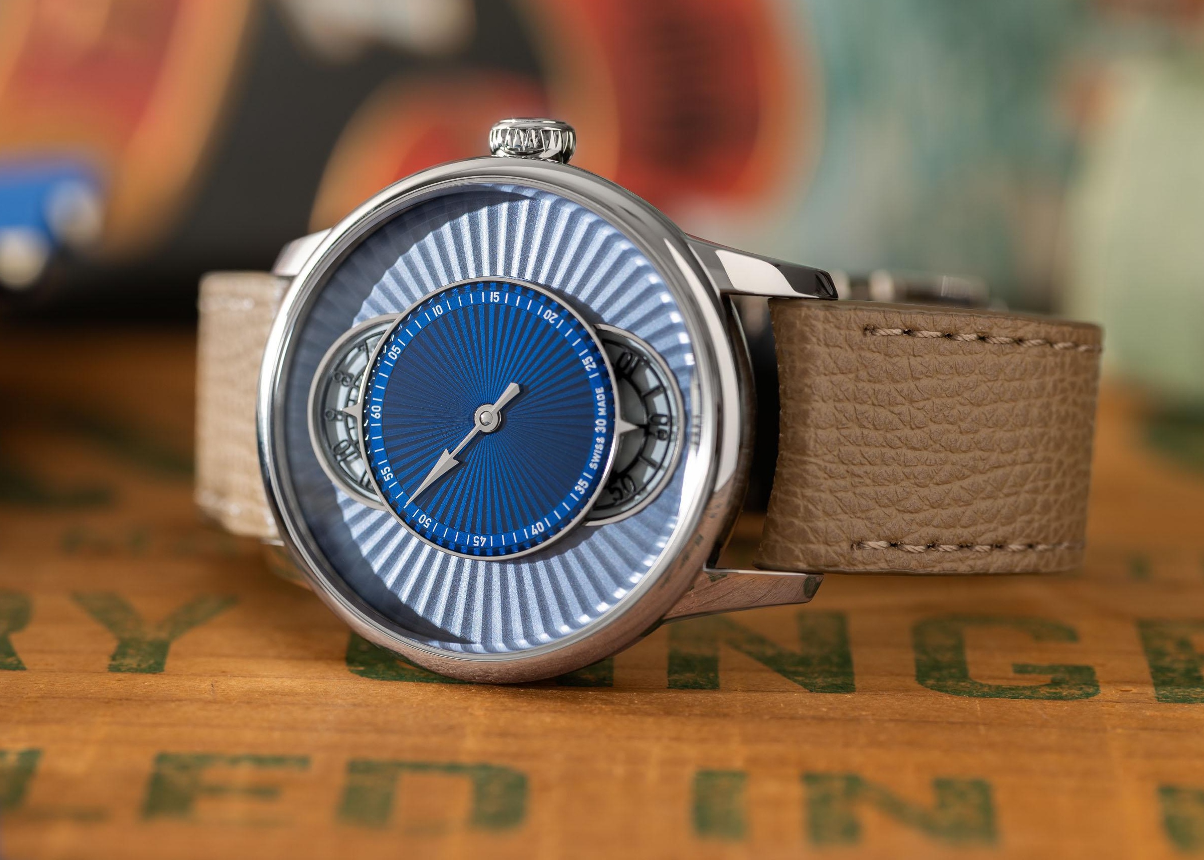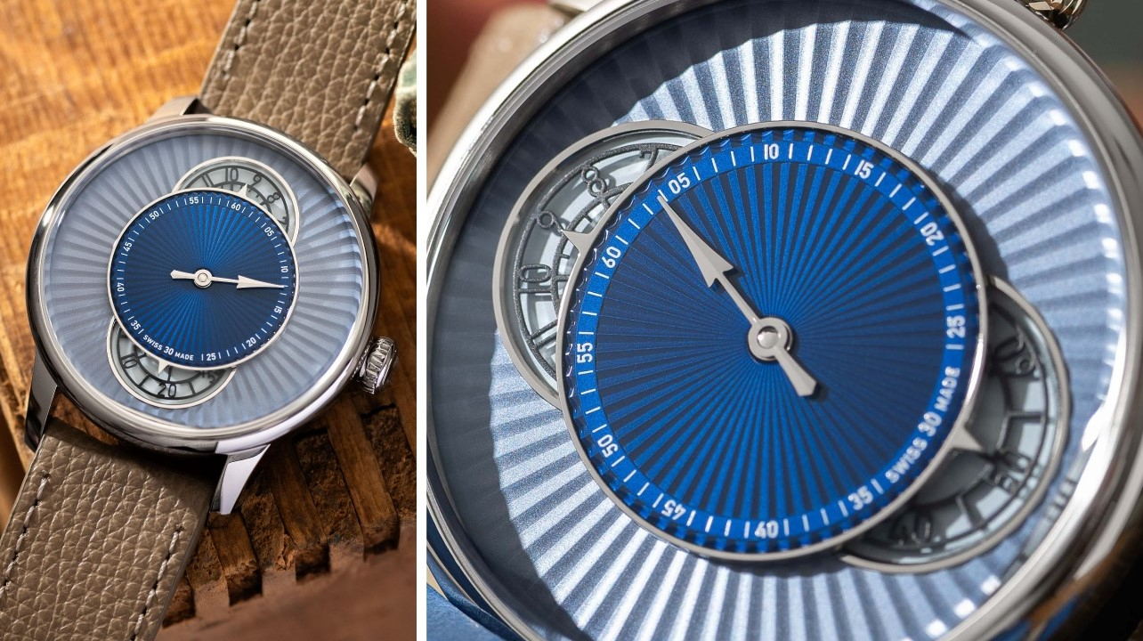 Mẫu regulator của Louis Erard, với bố cục tách biệt giờ, phút và giây, trở thành nền tảng lý tưởng. Chính cấu trúc hiếm gặp này vừa đặt ra thách thức, vừa mở ra cảm hứng cho một mặt số ba tầng giàu biểu cảm. Tầng đáy là nền trắng gần thuần với sắc độ lạnh tinh tế, nơi hai đĩa skeleton hiển thị giờ cùng giây như đang lơ lửng. Bên trên, mảng phút màu xanh nhạt được hoàn thiện dạng rãnh, đảm nhiệm việc hiển thị một cách tinh gọn. Lớp cao nhất, phủ sơn mài cobalt đậm, thu hút ánh nhìn với bộ số và vạch hiển thị rõ ràng. Toàn bộ tạo nên sự giao hòa ấn tượng giữa chuyển động và chiều sâu, giữa tinh thần cổ điển cùng thiết kế đương đại.