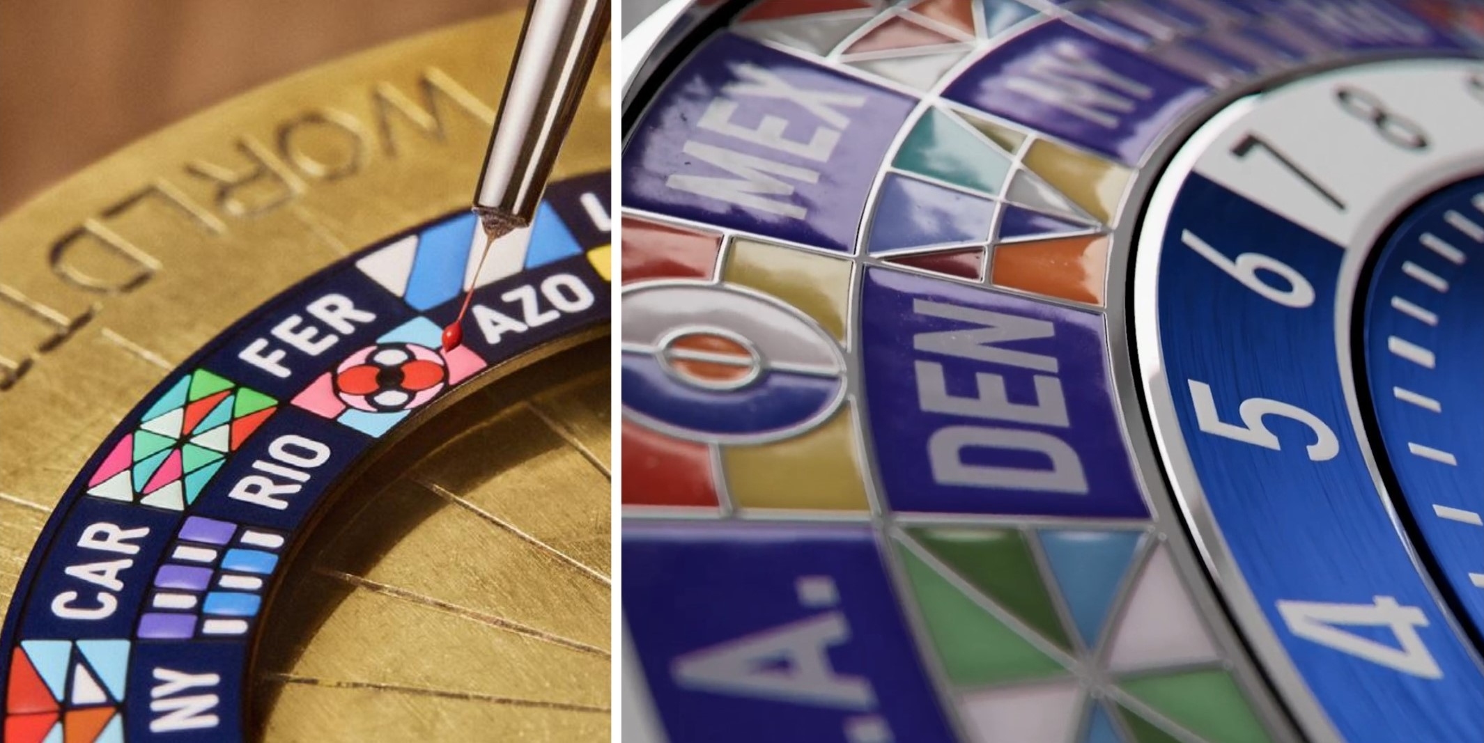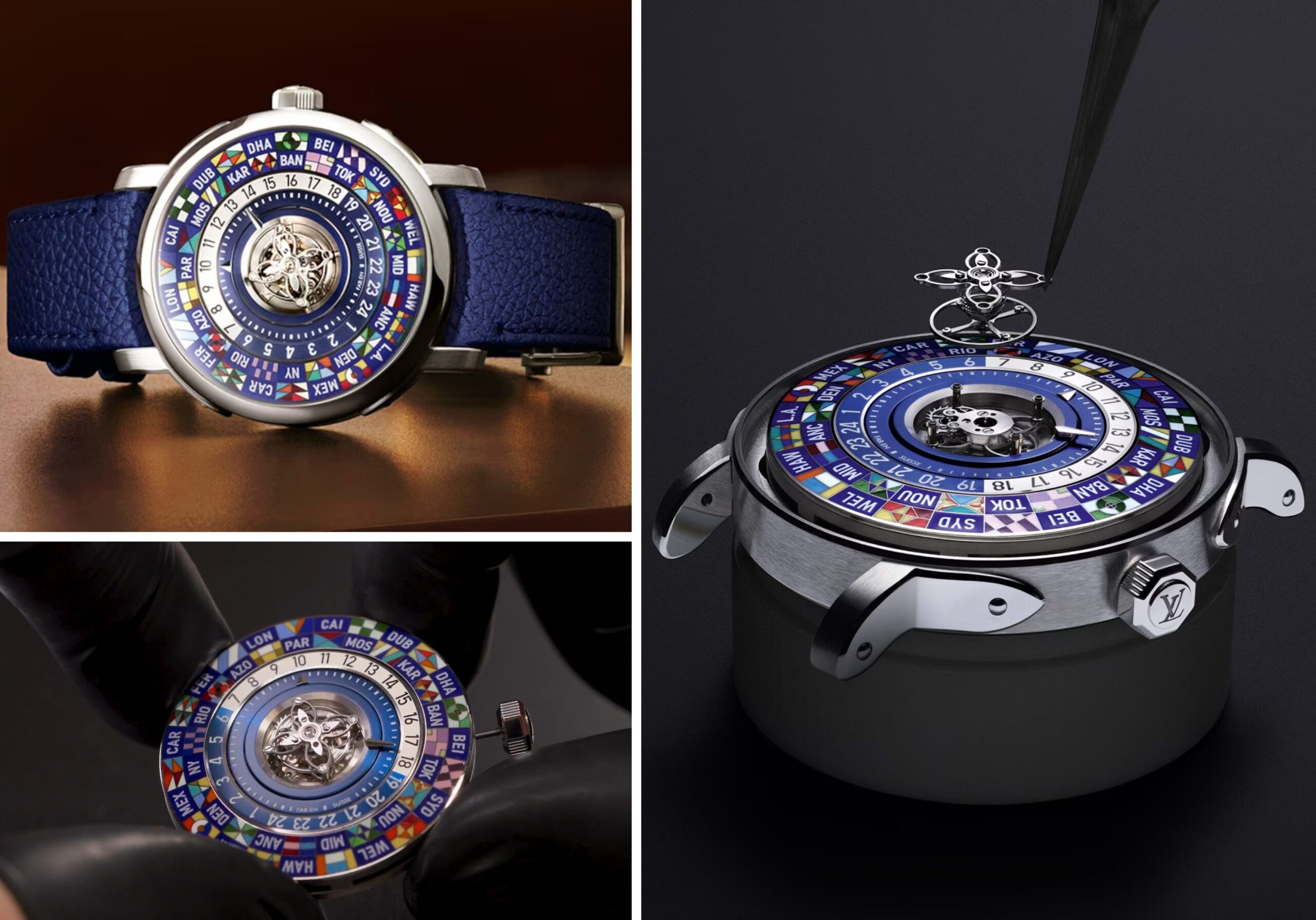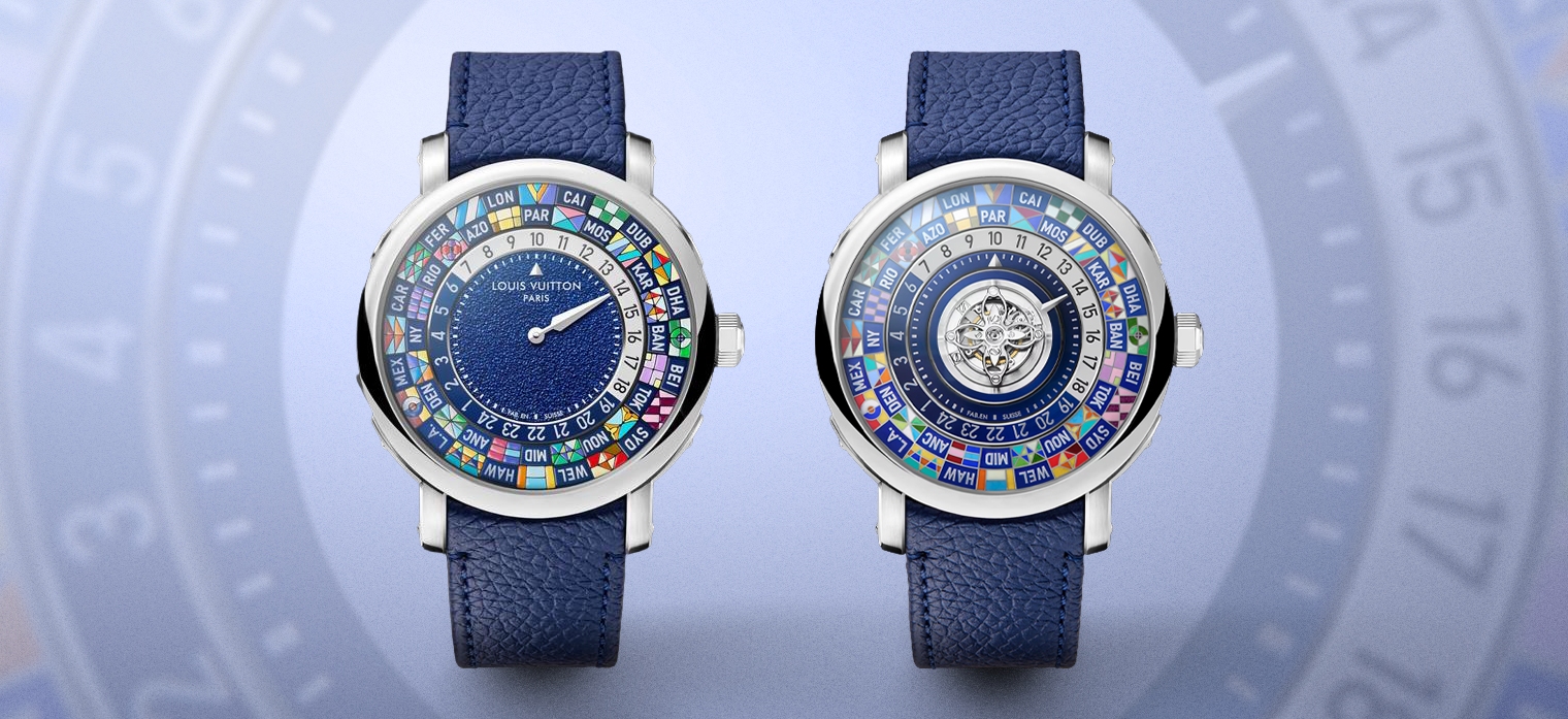 ghệ thuật du lịch hiển hiện trên mặt số Escale Worldtime trưng bày 24 lá cờ chế tác hoàn toàn bằng men đại diện cho các thành phố lớn trên toàn cầu. Chúng phản ánh nguồn cảm hứng đến từ những họa tiết lịch sử của Louis Vuitton, như lớp lót rương malletage chần hình thoi cùng họa tiết Damier biểu trưng. Họa tiết Monogram Flower danh tiếng cũng được tái hiện ở kích thước thu nhỏ, cùng chữ “V” đặc trưng của Gaston-Louis Vuitton – cháu trai nhà sáng lập – đại diện cho thành phố Paris. Trong kỷ nguyên tàu viễn dương, những dấu hiệu vượt qua vai trò yêu tố trang trí để trở thành dấu hiệu nhận diện hành lý khi vị chủ nhân mải mê băng qua các lục địa và đại dương. Khi được tái hiện trên mặt số, những biểu tượng cá nhân hóa ấy gợi nhớ một thời kỳ mà savoir-faire hòa quyện cùng bản sắc riêng.