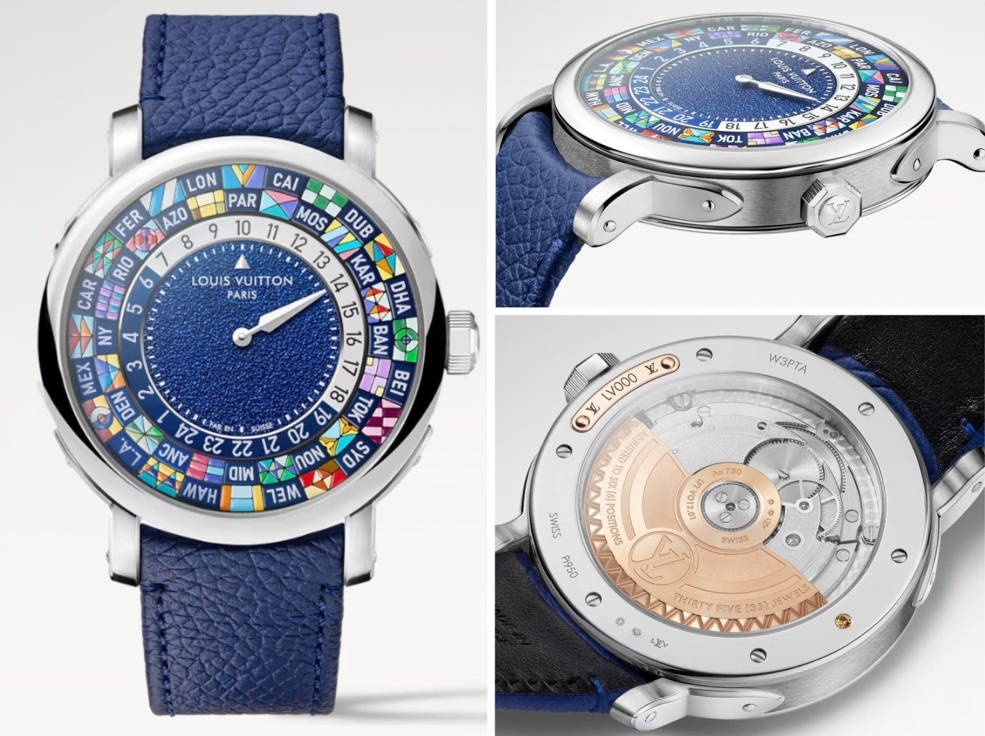 Escale Worldtime tái hiện hình ảnh kinh điển với vòng worldtime vẽ tiểu họa và trung tâm mặt số xanh dương vân hạt, được tinh chỉnh để tăng độ rõ nét, đồng thời tri ân kết cấu Monogram canvas lịch sử. Dù các họa tiết worldtime vẫn quen thuộc, Calibre LFT VO 12.01 – bộ máy tự động trữ 62 giờ năng lượng, đã nâng tầm complication, báo hiệu một kỷ nguyên mới cho biểu tượng này. Calibre Worldtime cho phép đọc giờ trên 24 múi giờ một cách trực quan, với cả thành phố tham chiếu lẫn thời gian đều có thể điều chỉnh thuận tiện qua núm vặn. Trong khi đó, đĩa jumping hour tiếp tục nâng cao độ rõ ràng, giúp việc đọc giờ trở nên dễ dàng trên mặt số.