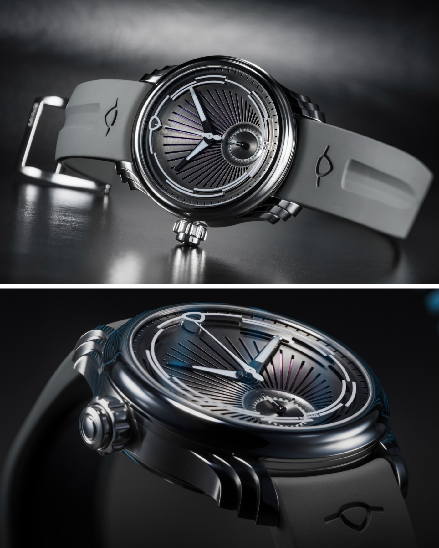 Một trong những trụ cột cốt lõi – chronograph monopusher – được MING tái hiện sống động trong 57.04 Phoenix. Dẫu khiêm nhường hơn so với “người anh em” Iris rực rỡ, “cỗ máy thời gian” thép 40mm vẫn hé lộ những sắc màu ẩn dưới mặt số xám lõm sâu, mở ra góc nhìn vào phiến đế xử lý bằng lớp multiphasic đổi màu ấn tượng.