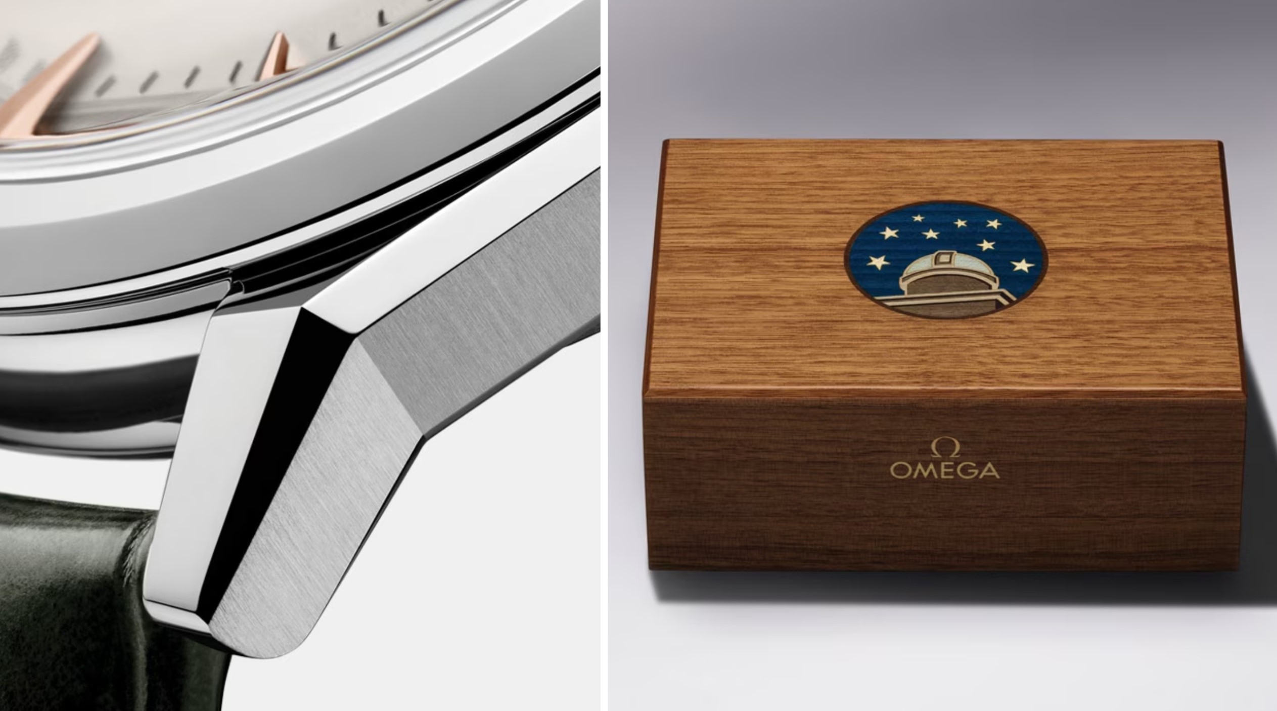 Phần vấu nối dog-leg với đường nét góc cạnh – đặc trưng các mẫu Omega trong một thời kỳ – là một trong những mã thiết kế tiêu biểu của thương hiệu, mang đến dáng vẻ riêng biệt với độ cong ôm sát cổ tay. Đặc biệt, mỗi mẫu đồng hồ kim loại quý thuộc OMEGA Constellation Observatory Collection đều đi kèm hộp trưng bày bằng gỗ riêng biệt, nổi bật biểu tượng Constellation Observatory, được chế tác bằng kỹ thuật marquetry.