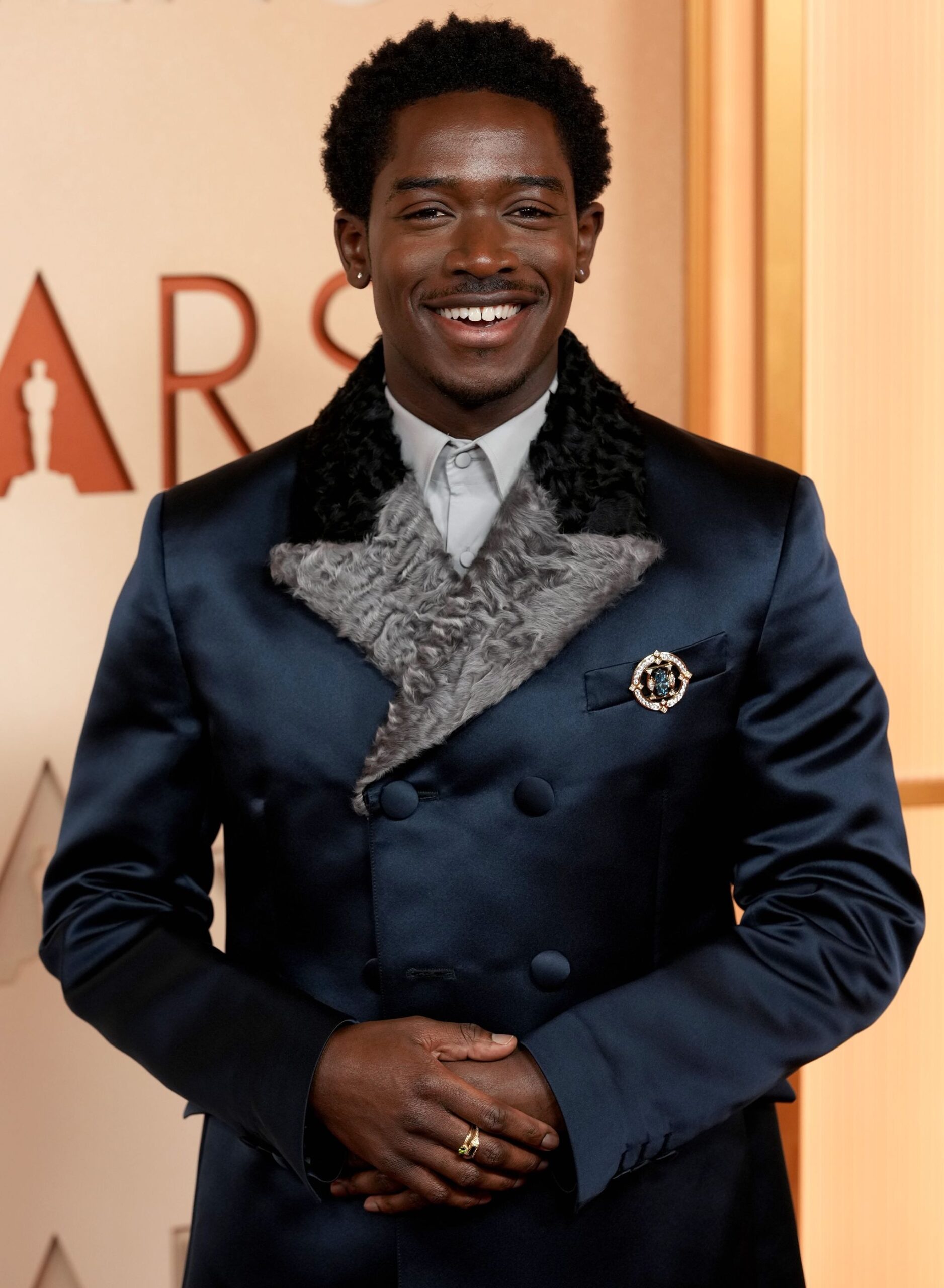 Trang sức nam giới cũng không đứng ngoài cuộc. Damson Idris phá vỡ quy chuẩn với trâm cài tùy biến đính kim cương xanh 7 carat.