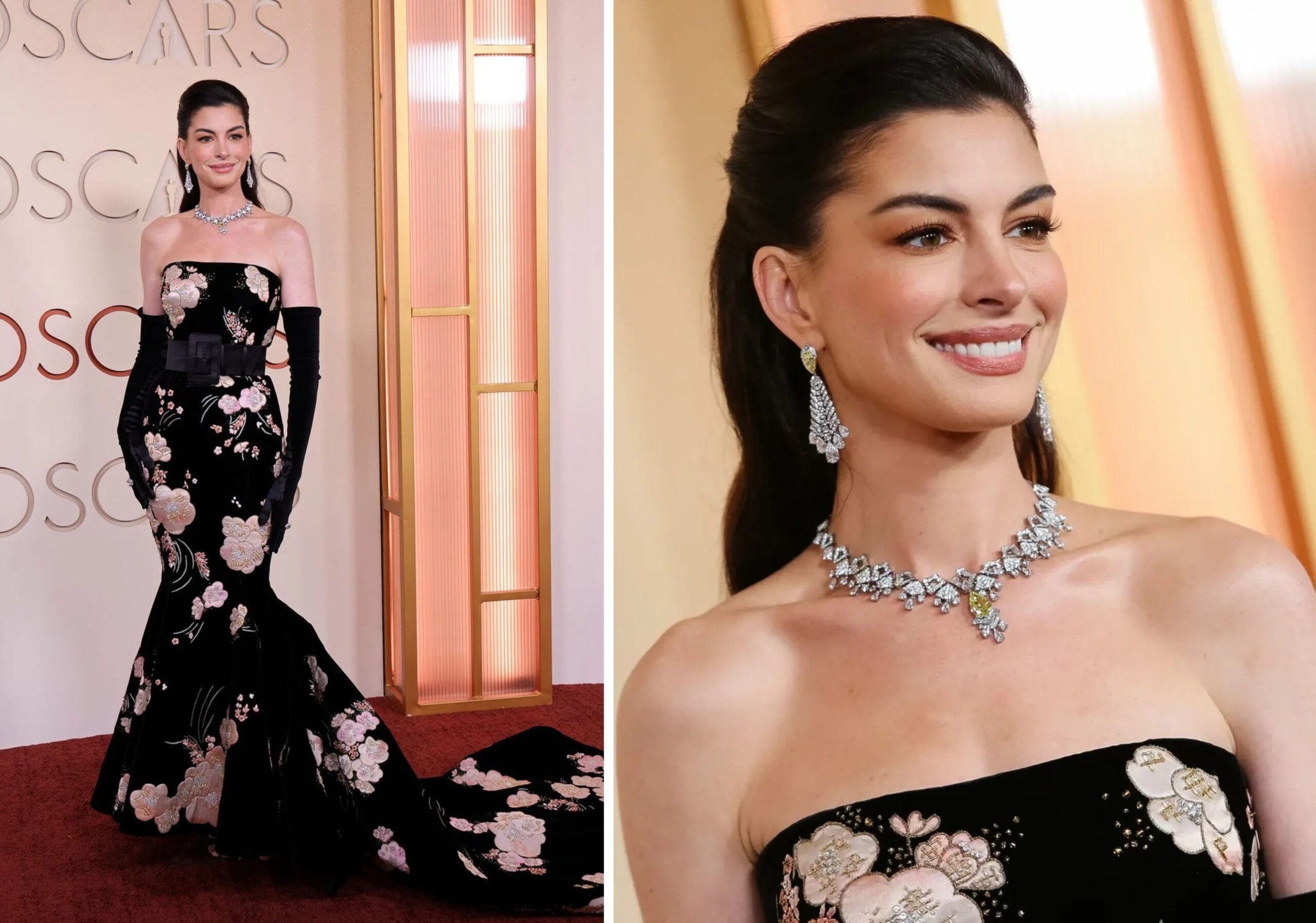 Trong khi đó, Anne Hathaway mang đến sự cân bằng hoàn hảo giữa cổ điển và rực rỡ với chiếc vòng cổ Bvlgari, nơi viên kim cương vàng 8.02 carat trở thành tâm điểm cho dải tinh tú 35 carat, kết tinh từ 850 giờ thao tác tỉ mỉ.