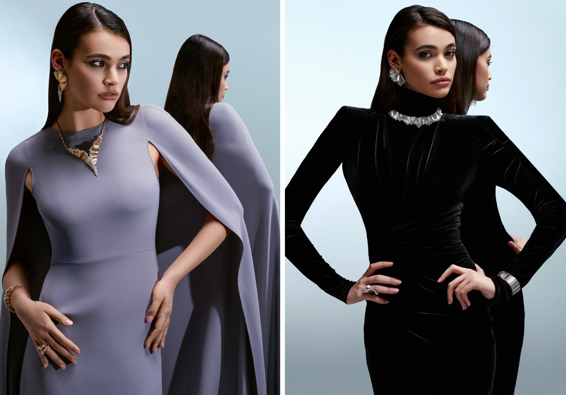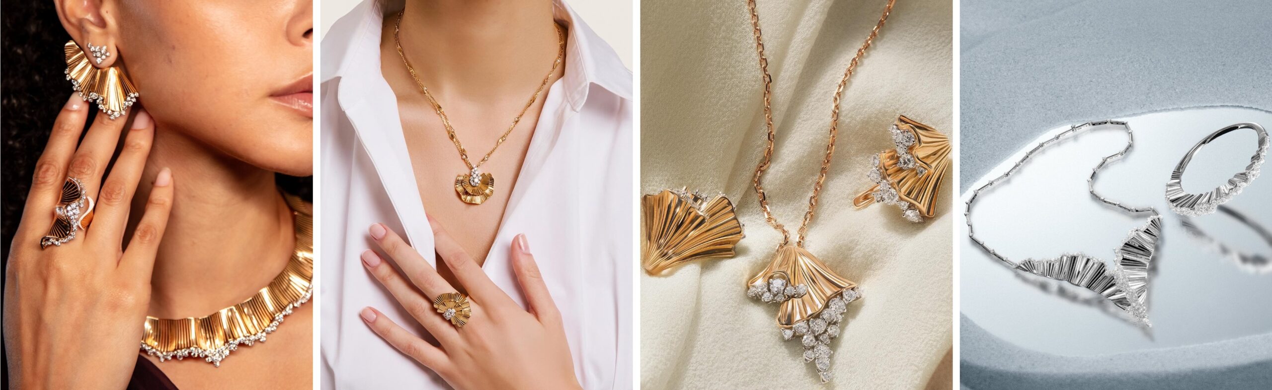 Mỗi thiết kế “họa” nên một bức tranh ánh sáng được chạm khắc trong kim loại quý. Trong khi vòng tay, dây chuyền tựa như đường chân trời rực nắng, thì hoa tai phản chiếu những tia sáng lấp lánh và nhẫn mang hình dáng nhỏ gọn nhưng chứa đựng trọn vẹn vẻ rực rỡ. Đường nét uốn cong duyên dáng dung hòa thiết kế phân tầng chất liệu giúp từng món trang sức vừa có chiều sâu vừa toát lên vẻ đẹp thanh thoát vô ngần.