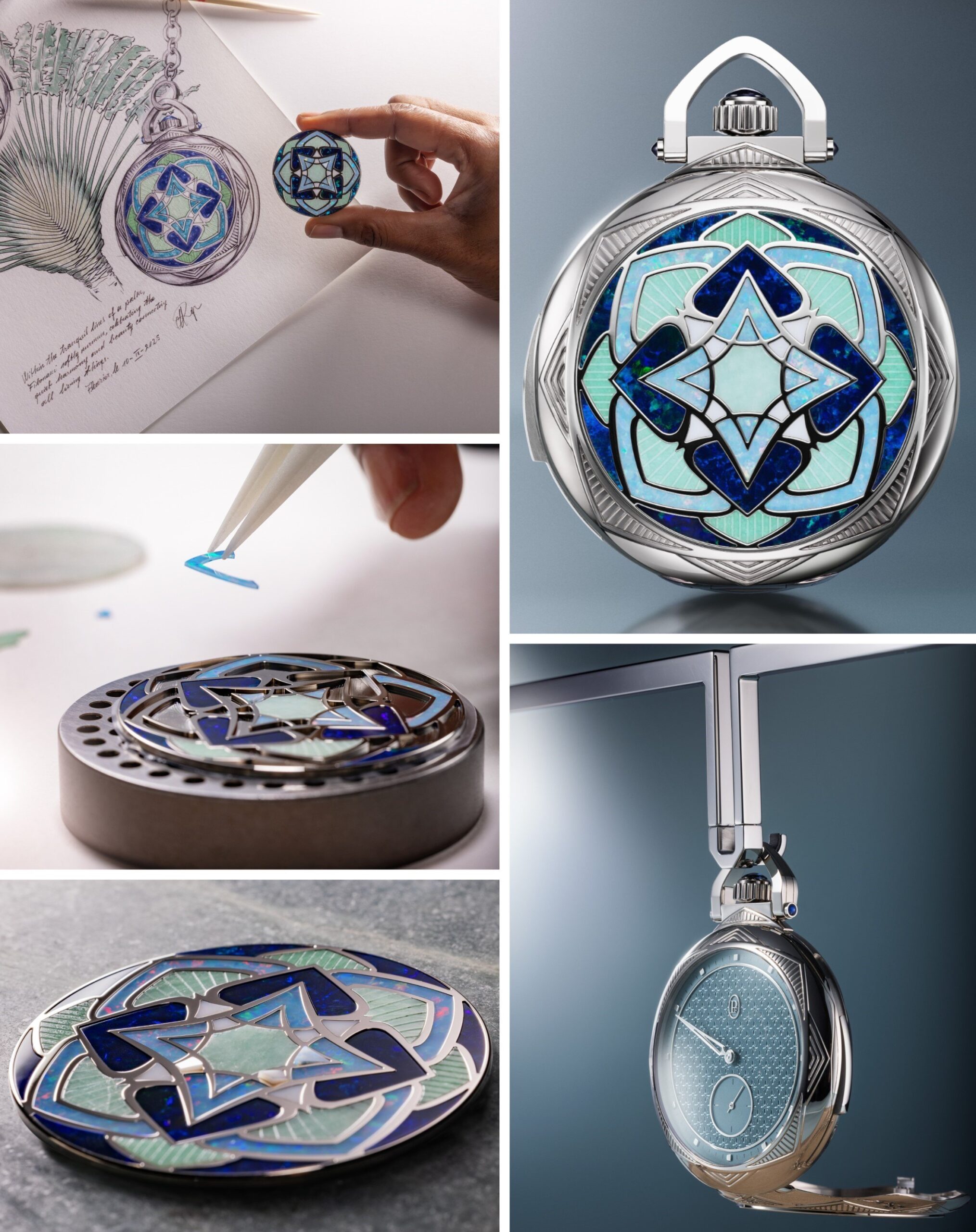 Ở mặt trước, La Ravenale gây ấn tượng với sắc xanh sâu, kết quả của quy trình phủ PVD siêu mỏng lắng đọng trong môi trường chân không, tạo nên chiều sâu màu sắc hiện đại nhưng vẫn hòa hợp với tinh thần thủ công truyền thống của tác phẩm. Khi xoay chiếc đồng hồ để quan sát mặt sau, tinh thần “đối thoại chất liệu” hiện lên rõ nét. Vỏ vàng trắng mở ra bề mặt marquetry kết hợp opal và jade, nơi từng mảnh opal – loại đá luôn thay đổi sắc độ theo ánh sáng – được cắt, tạo hình và đánh bóng hoàn toàn thủ công. Jade đóng vai trò là điểm tựa thị giác, mang đến sự ổn định và độ khuếch tán ánh sáng mềm mại hơn. Ba loại đá quý – jade Guatemala, opal trắng ngà Thổ Nhĩ Kỳ và opal xanh Australia – hòa quyện, tạo nên bố cục vừa tương phản vừa cân bằng trong tổng thể thiết kế.