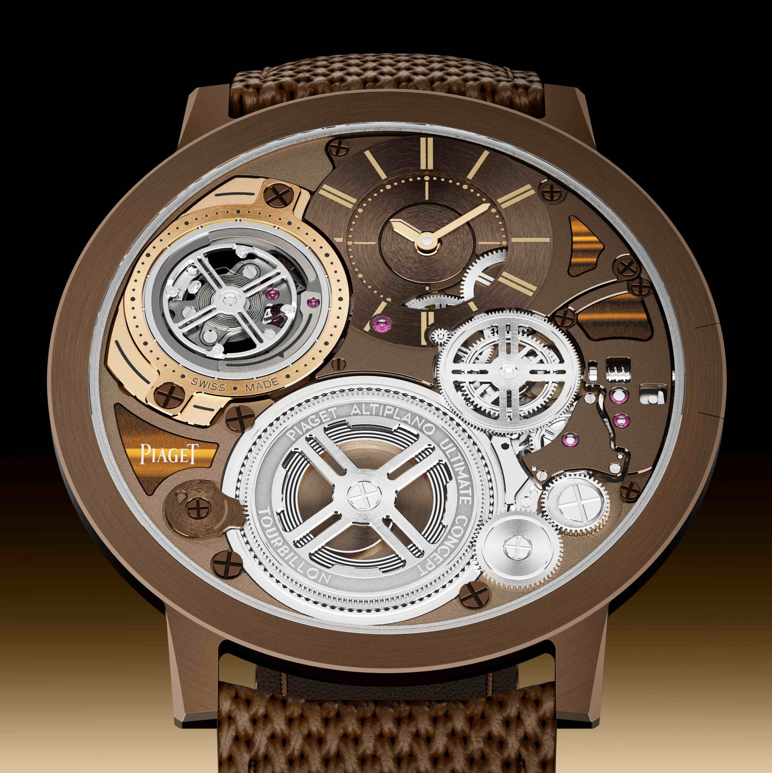 Ở bình diện kỹ thuật cao nhất, Piaget còn đưa đá trang trí vào Altiplano Ultimate Concept Tourbillon dày chỉ 2mm. Đây là một thử thách đặc biệt, bởi đá được gắn lên những thành phần thuộc chính bộ máy, đòi hỏi quá trình làm sạch rồi lắp ráp ở mức chính xác cực cao.