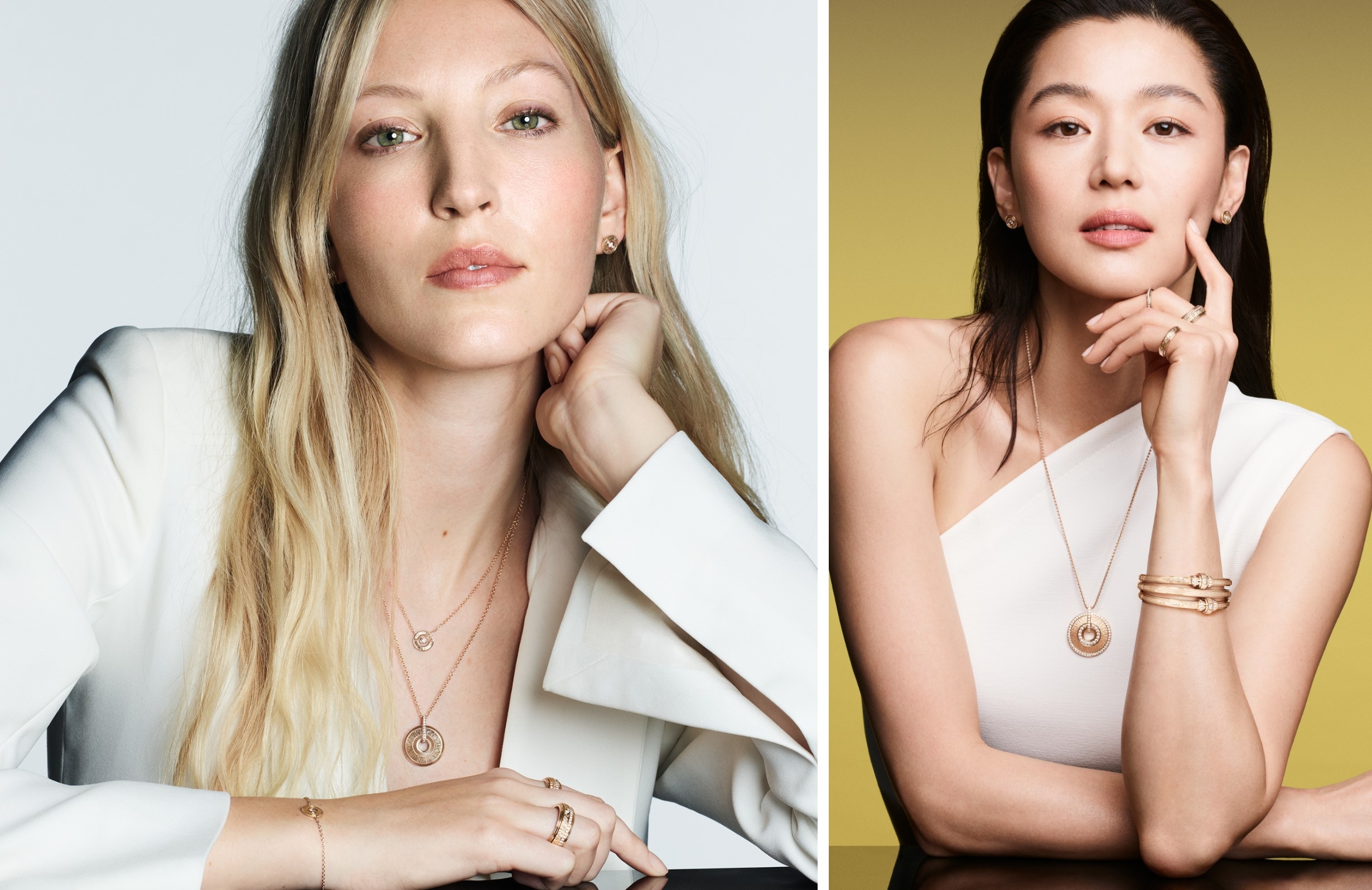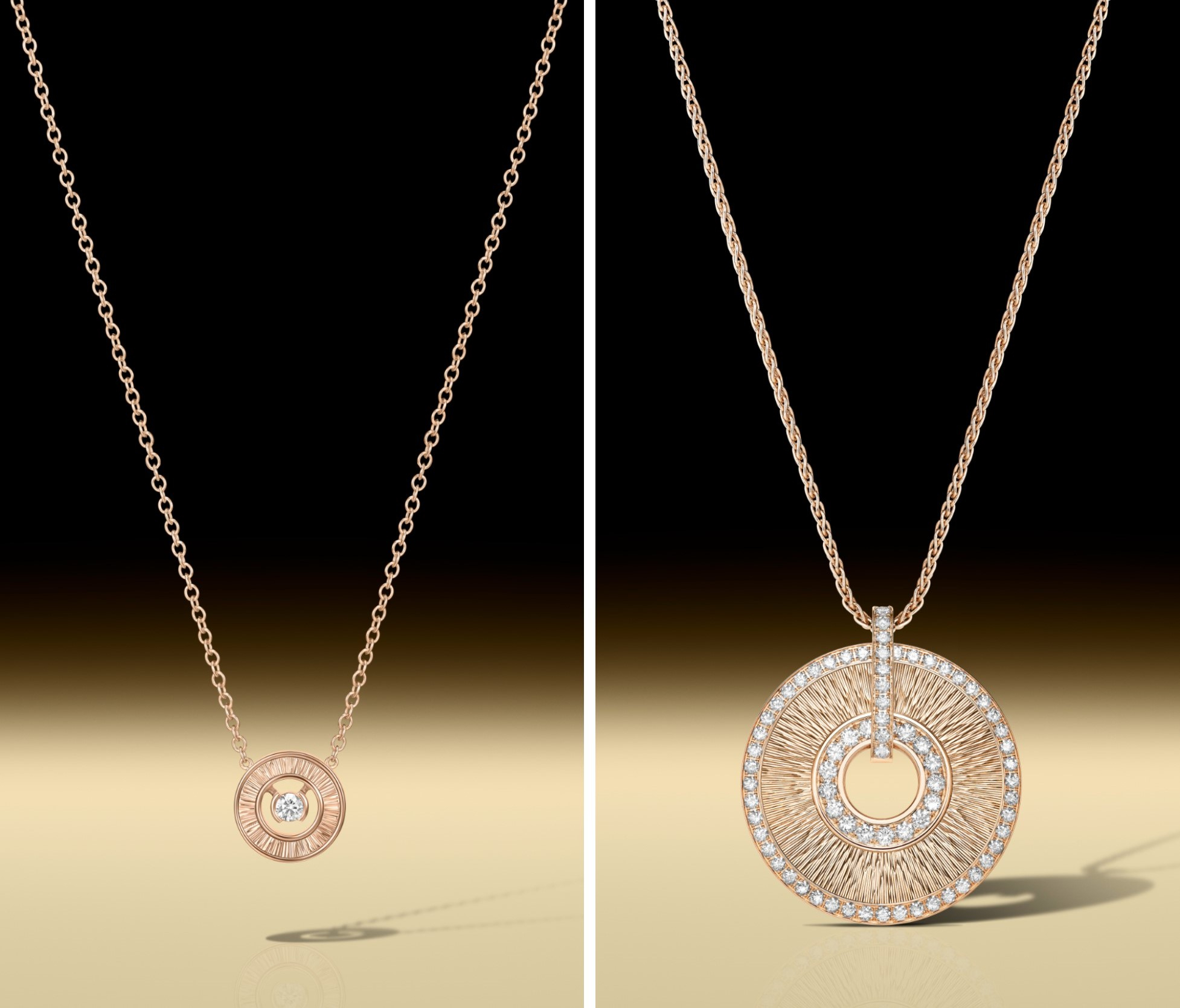 Các thiết kế mới hiện diện trong ba kích thước nhỏ, trung và lớn, di chuyển linh hoạt, tỏa sáng cùng chuyển động của người đeo. Hai mẫu mặt dây chuyền nhỏ tinh xảo thể hiện kỹ nghệ khắc Decor Palace trên nền vàng hồng hoặc vàng trắng, điểm xuyết kim cương rực rỡ giữa hai giá đỡ chạm khắc tinh xảo, đi kèm vòng tay đồng điệu. Phiên bản cỡ trung mang phong cách đối lập đầy cuốn hút: vàng đánh bóng hoặc nạm kim cương kết hợp cùng Decor Palace, nổi bật khoen nối nạm đá. Trong khi đó, mặt dây chuyền lớn càng sang trọng bội phần nhờ ánh sáng kim cương cùng chuỗi dây palm-mesh đặc trưng. Hoàn thiện bộ sưu tập, đôi hoa tai vàng hồng Decor Palace, điểm xuyết kim cương, mang lại cảm giác quyến rũ cho người đeo.