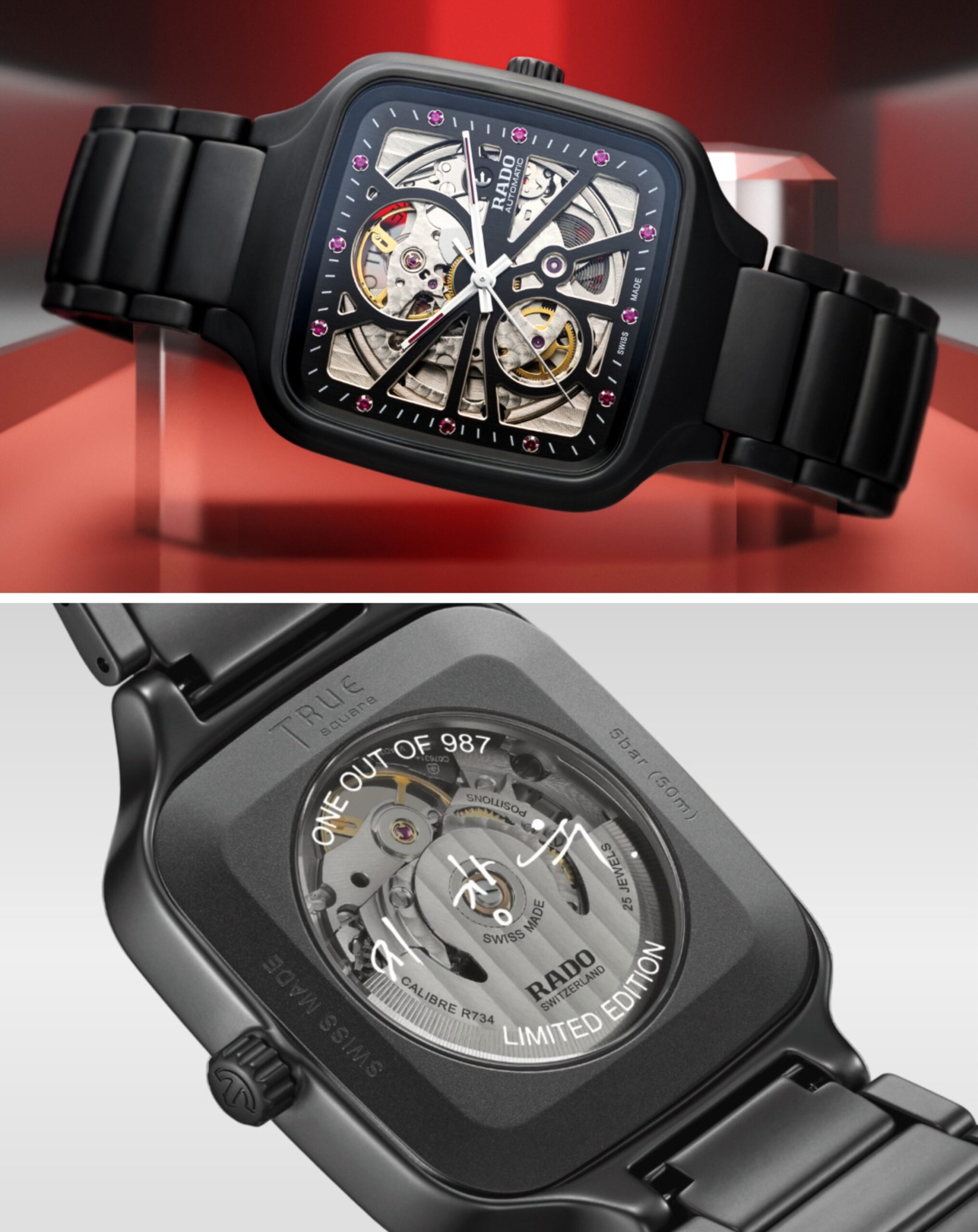 True Square Open Heart x Ji Chang-wook ghi dấu sự kết hợp giữa kỹ nghệ gốm công nghệ cao cùng câu chuyện cá nhân giàu ý nghĩa của Ji Chang-Wook. Đóng vai trò cọc số, mười hai viên ruby – loại đá quý gắn với tháng sinh của nam tài tử Hàn Quốc kiêm đại sứ thương hiệu Rado – kiêu hãnh thắp sáng mặt số skeleton tiết lộ nhiều chi tiết cấu thành Calibre R734.
