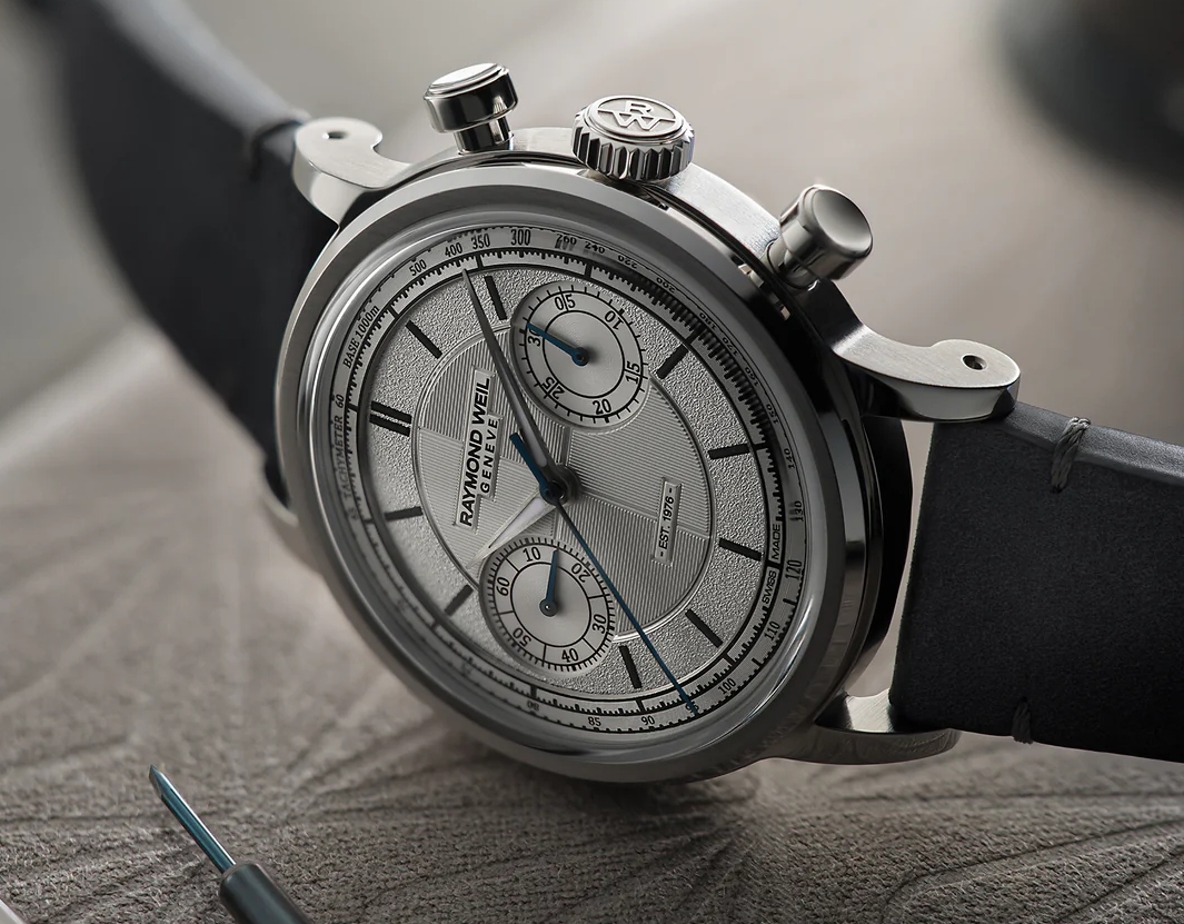 Khu vực bên dưới các cọc số sở hữu bề mặt dạng hạt, tạo hiệu ứng khối tinh thể phản chiếu ánh sáng nhẹ nhàng. Phần trung tâm được dập họa tiết “tapestry” với chuỗi đường gadroon xen kẽ, lấy cảm hứng từ hoàn thiện chải xước dọc cùng trục thập tự đặc trưng bộ sưu tập, vừa bắt sáng vừa nâng đỡ các cọc số phủ Super-LumiNova®. Khối monobloc này được ký bằng logo RAYMOND WEIL bên cạnh dòng chữ “EST. 1976” in đen, hơi nổi nhẹ để bắt sáng một cách tinh tế. Mặt số phụ giây nhỏ vị trí 9 giờ cùng bộ đếm 30 phút vị trí 9 giờ được chế tác riêng biệt, sở hữu hoàn thiện, màu sắc và xử lý trang trí riêng, qua đó tăng cường khả năng đọc.