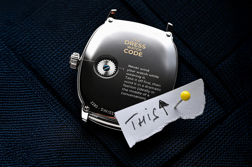 Với mặt đáy gần như khép kín, dấu chấm phá cuối cùng của Romaric André được khắc tinh tế đúng theo tinh thần: “Đừng bao giờ lên dây cót khi đang đeo đồng hồ. Hãy tháo ra trước, rồi lên dây theo cách thật kịch tính!”. Phía sau đó, bánh răng duy nhất hiện hữu – bánh răng trụ – điểm vân chải xước cùng một vít xanh, là lời tri ân kín đáo dành cho những cử chỉ thủ công được giới sưu tầm trân trọng: lên dây cót Calibre RW4100.