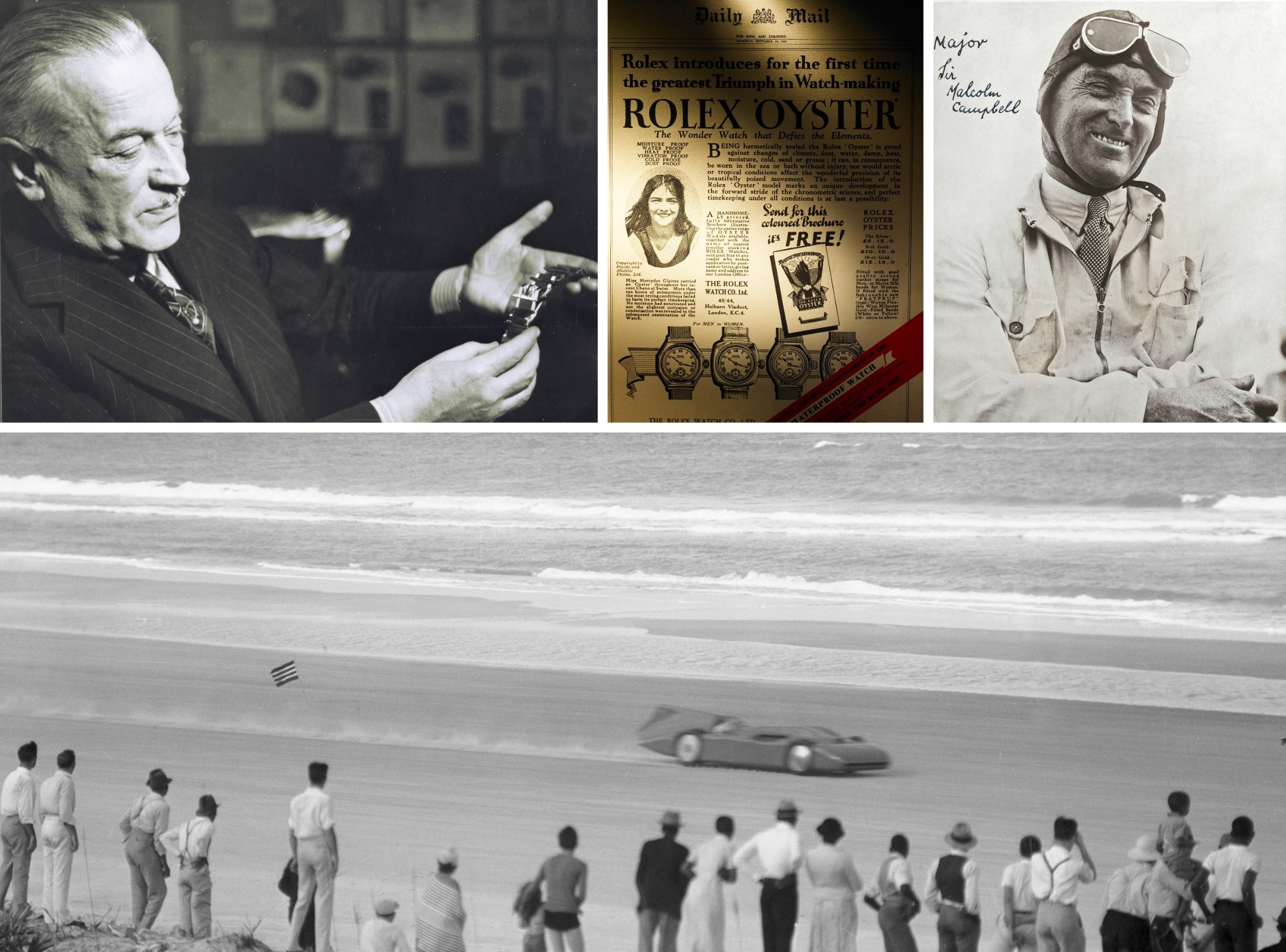 Trái sang phải, trên xuống dưới: Nhà sáng lập Rolex – Hans Wilsdorf; bài viết về sự ra mắt của Rolex Oyster; Sir Malcolm Campbell – testimonee đầu tiên của Rolex trong môn thể thao đua xe; Sir Malcolm Campbell cùng chiếc xe đua Bluebird trên bãi biển Daytona năm 1935