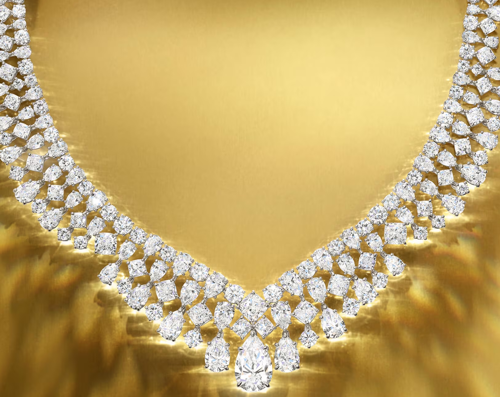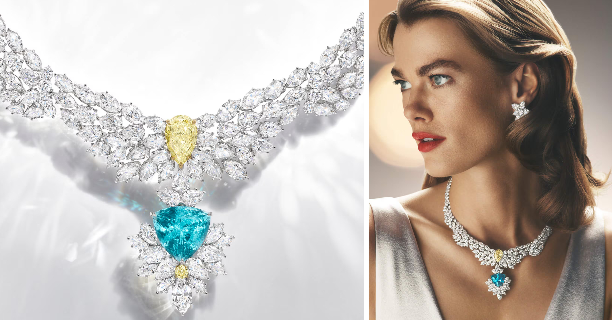 Một trong những tuyệt phẩm tiêu biểu là vòng cổ Paraiba và kim cương, với viên Paraiba tourmaline trọng lượng 16,10 carat giữ vai trò tâm điểm, được tô điểm bởi 5,01 carat kim cương vàng cùng hơn 65 carat kim cương trắng. Thiết kế này thể hiện triết lý “lấy đá quý làm linh hồn sáng tạo” – nền tảng trong tầm nhìn của Harry Winston. Nghệ thuật chế tác của Harry Winston thể hiện trong kỹ thuật nạm kim cương chính xác tuyệt đối, tạo ảo giác chuyển động mềm mại quanh cổ. Sự sắp đặt khéo léo giữa kim cương cắt marquise, quả lê, brilliant khiến chiếc vòng cổ trở thành tác phẩm nghệ thuật sống động, minh chứng cho tinh hoa trau dồi cũng như gìn giữ suốt gần một thế kỷ.