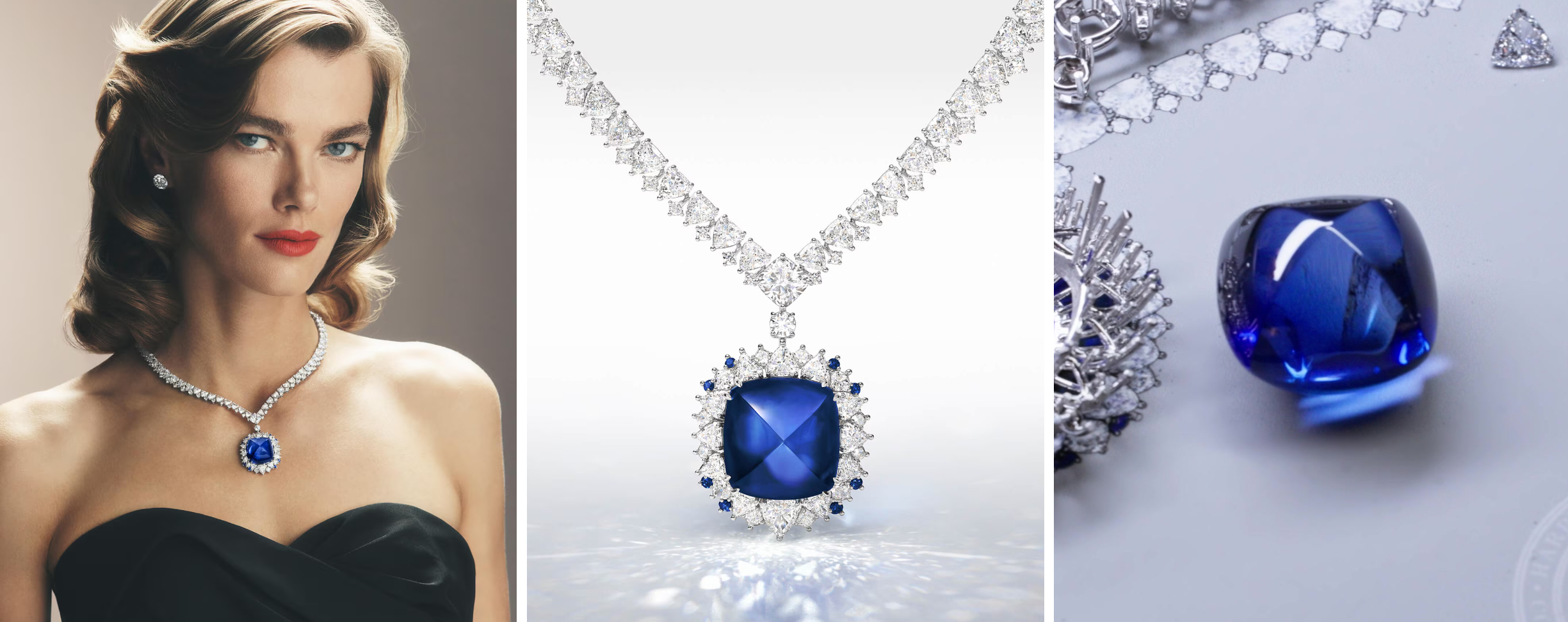 Kiêu hãnh khoe vẻ đẹp khó bì, vòng cổ Sapphire Cabochon 65,61 carat điểm xuyết viên lam ngọc cabochon mang sắc xanh hoàng gia rực rỡ và độ trong tuyệt mỹ. Cùng kiến tạo hào quang rực rỡ, kim cương cắt riêng ôm trọn dáng sugarloaf độc đáo, cùng chín viên sapphire tròn tạo nên bố cục hài hòa giữa màu sắc và ánh sáng – tôn vinh tài năng “giác quan thứ sáu” của ngài Winston trong việc nhận diện đá quý phi thường.