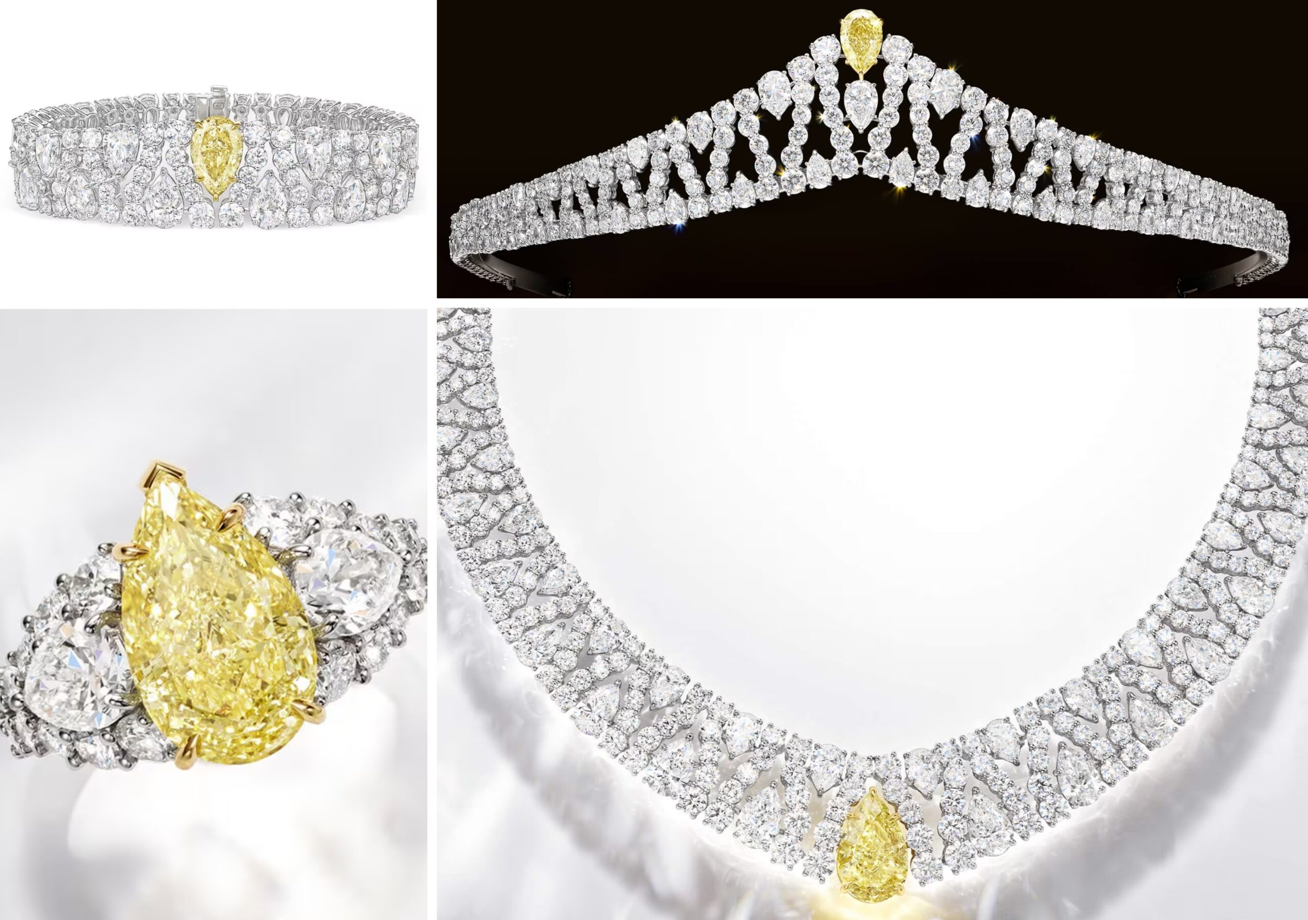 Bên cạnh đó, set trang sức kim cương vàng kết hợp kim cương trắng tiếp nối di sản của những viên kim cương huyền thoại như Taylor-Burton hay Indore Pears. Hai hàng kim cương dáng quả lê xen kẽ kim cương tròn brilliant bao quanh viên kim cương vàng đậm 6,53 carat ở trung tâm. Sự chuyển động uyển chuyển, cân đối hoàn hảo và ánh sáng lan tỏa qua từng viên đá thể hiện rõ nghệ thuật nạm kim cương đỉnh cao, dấu ấn của “Rare Jeweler of the World”.