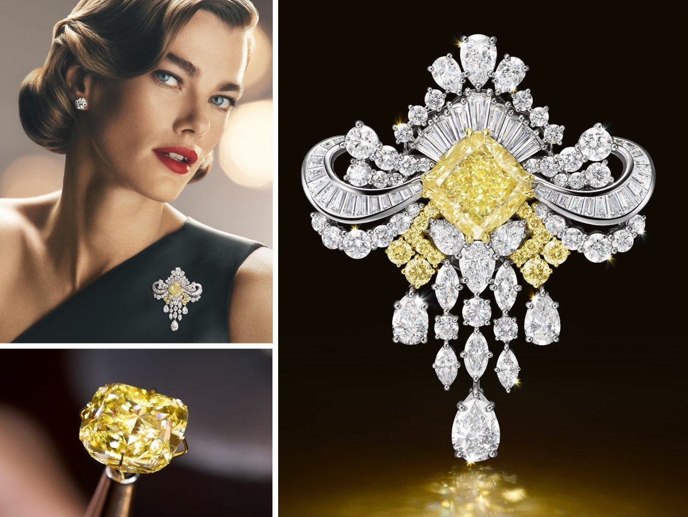 Bên cạnh đó, ghim cài áo kim cương vàng là tuyệt tác kết tinh tinh thần “Jeweler to the Stars”. Viên kim cương vàng cushion 9,81 carat ở trung tâm được bao quanh bởi những đường vòng tinh xảo từ kim cương baguette cùng kim cương đa dạng kích cỡ, tạo cảm giác chuyển động, chiều sâu và độ rực rỡ hoàn mỹ. Được lựa chọn kỹ lưỡng bởi đội ngũ chuyên gia Harry Winston, những viên đạt chuẩn mực tuyệt đối về màu, độ tinh khiết và độ rực sáng mới được chọn để góp phần tạo nên tuyệt phẩm này.