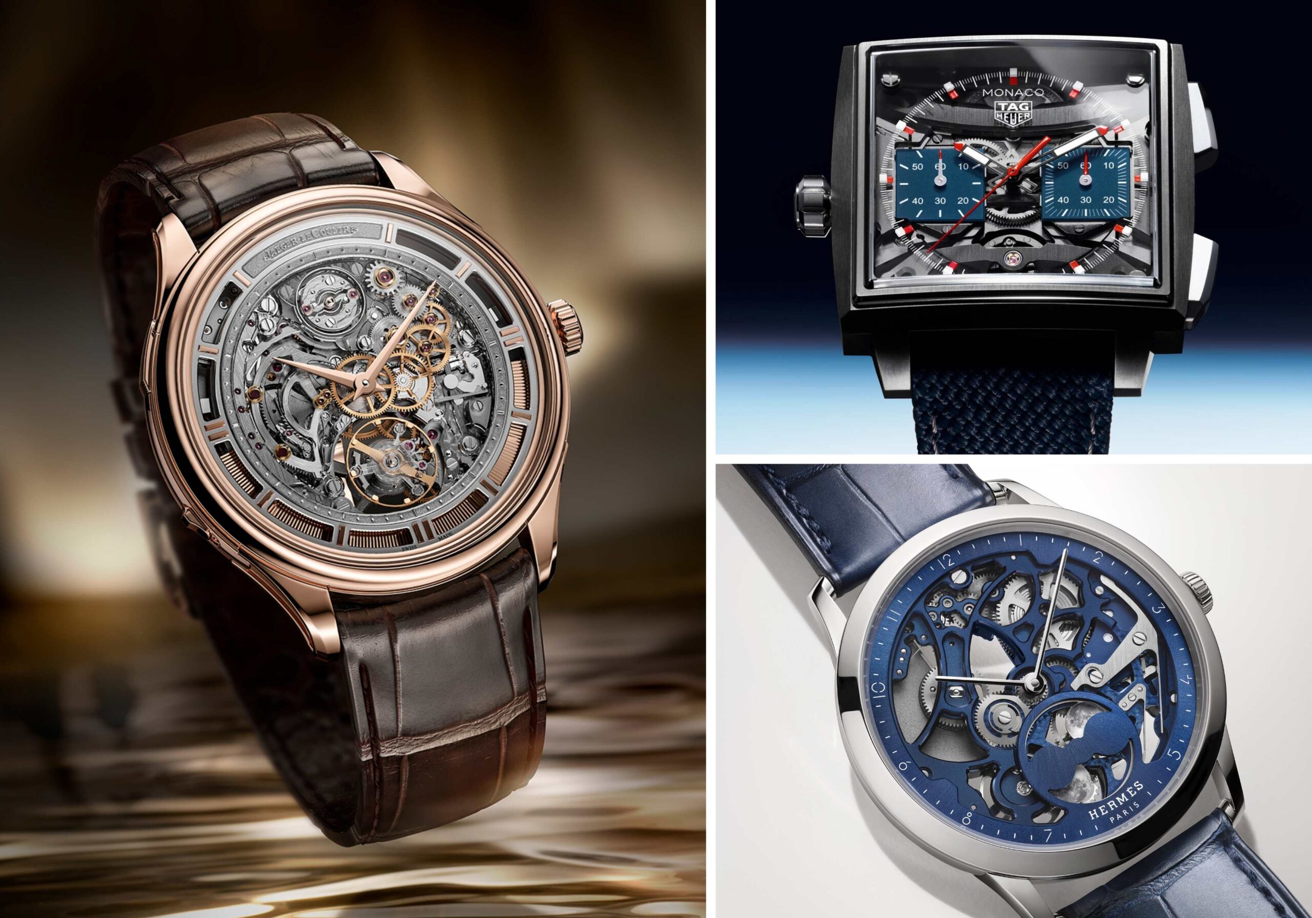 Bên cạnh đó, một số thương hiệu vẫn lựa chọn hướng thể hiện rõ ràng hơn về mặt cơ khí. Jaeger-LeCoultre, TAG Heuer và Hermès mang đến các thiết kế skeleton và open-worked, tạo thêm chiều sâu thị giác và sự đa dạng cho toàn bộ triển lãm.