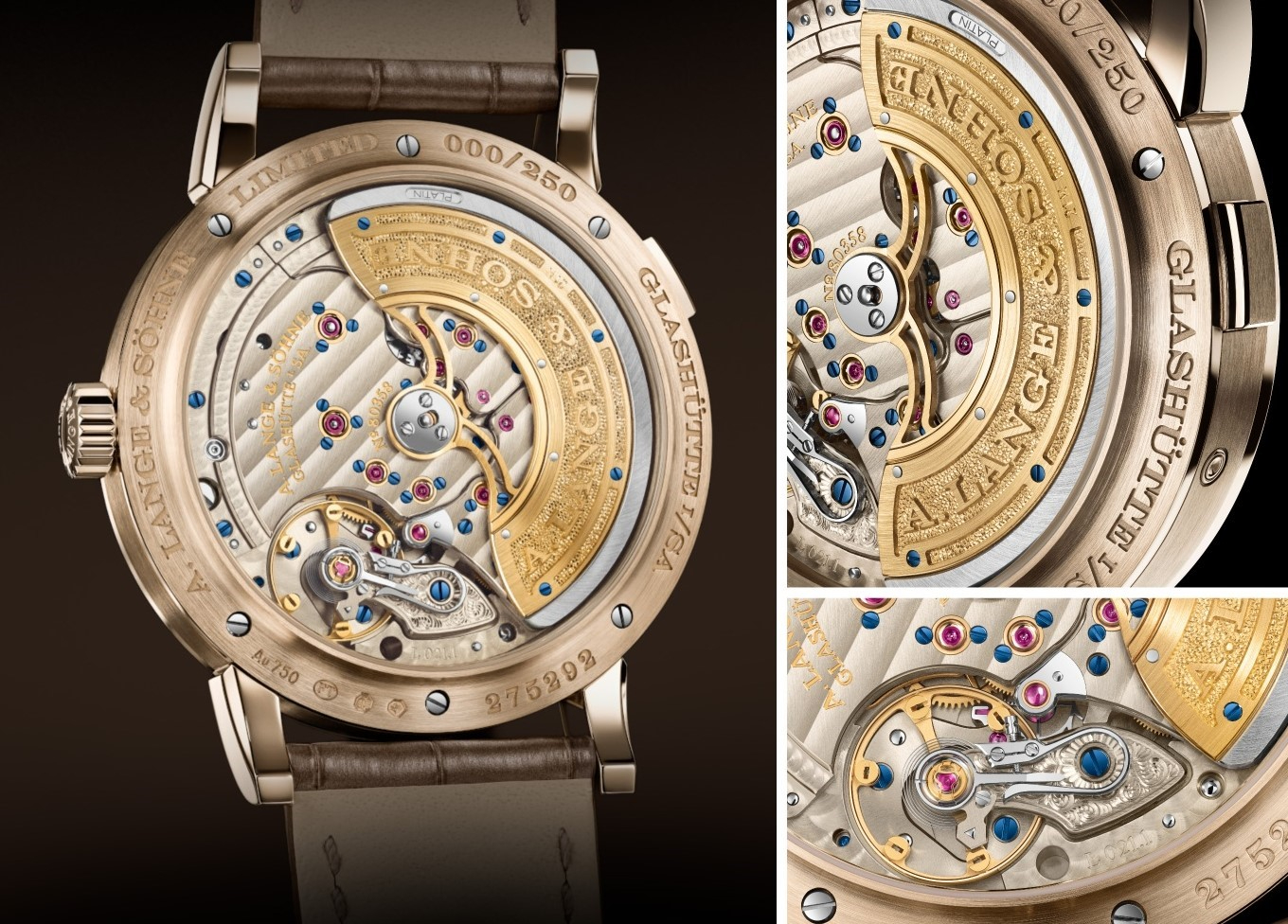 Khả năng lên dây hiệu quả và truyền lực ổn định được đảm bảo nhờ rotor trung tâm kích thước lớn, bao trùm toàn bộ đường kính bộ máy. Phần lõi rotor bằng vàng 875 mang chữ ký “A. Lange & Söhne” dập nổi, trong khi vành quán tính ly tâm chế tác từ platinum 950. Sự phối hợp sắc màu giữa vàng ánh ấm, platinum sắc lạnh và vít nhuộm xanh tạo nên điểm nhấn thị giác đầy cuốn hút, toát lên vẻ đẹp kỹ thuật tinh tế. Bốn nan rotor thanh mảnh giúp giảm chấn khi va đập, bảo vệ bộ máy trước những tải trọng lớn.