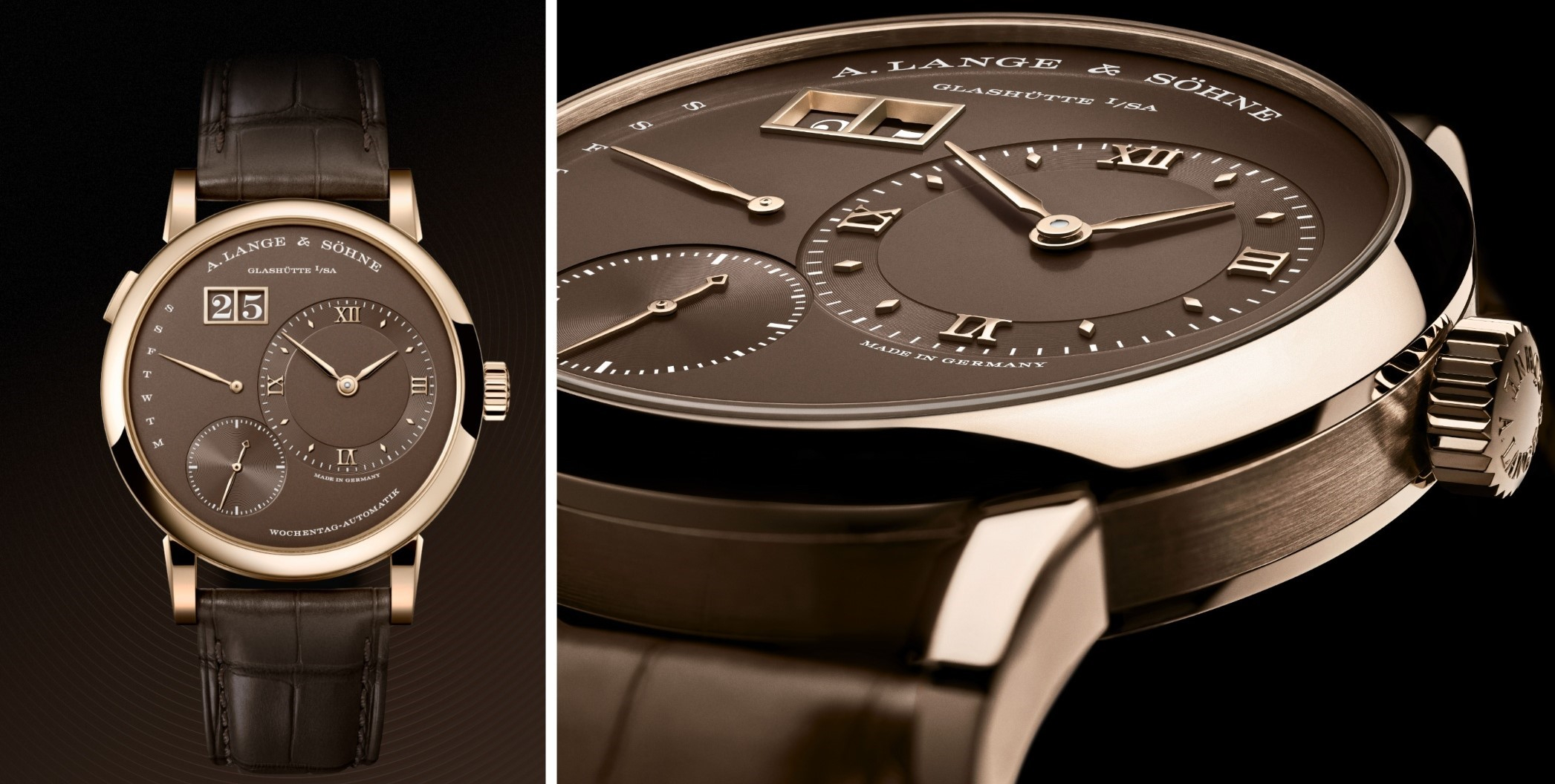 Vỏ Lange 1 Daymatic Honeygold sở hữu tỷ lệ cân đối cùng những đường nét hài hòa. Với đường kính 39,5 mm và độ dày 10,4 mm, chiếc đồng hồ ôm gọn cổ tay, dễ dàng nằm gọn dưới cổ tay áo sơ mi. Các chi tiết như vấu, vành gờ được tinh chỉnh nhẹ nhàng, mang lại cho tổng thể một cảm giác thanh thoát, nhẹ nhàng hơn. Sự kết hợp giữa vỏ vàng Honeygold cùng mặt số nâu làm từ bạc 925 tạo nên diện mạo độc đáo và đầy tinh tế cho “cỗ máy thời gian”. Ánh sắc ấm áp của hợp kim quý này được phản chiếu đồng điệu trên bộ kim, cọc số appliqué cùng khung cửa sổ lịch ngày cỡ lớn. Hơn thế, mặt số còn gây ấn tượng bởi nhiều chi tiết giàu chiều sâu, tiêu biểu là vòng hiển thị giờ, phút hạ thấp hơn tiền nhiệm một chút, giúp tăng hiệu ứng ba chiều. Ô lịch ngày cỡ lớn hiển thị chữ số trắng trên nền nâu, hài hòa hoàn hảo với sắc độ tổng thể của mặt số.