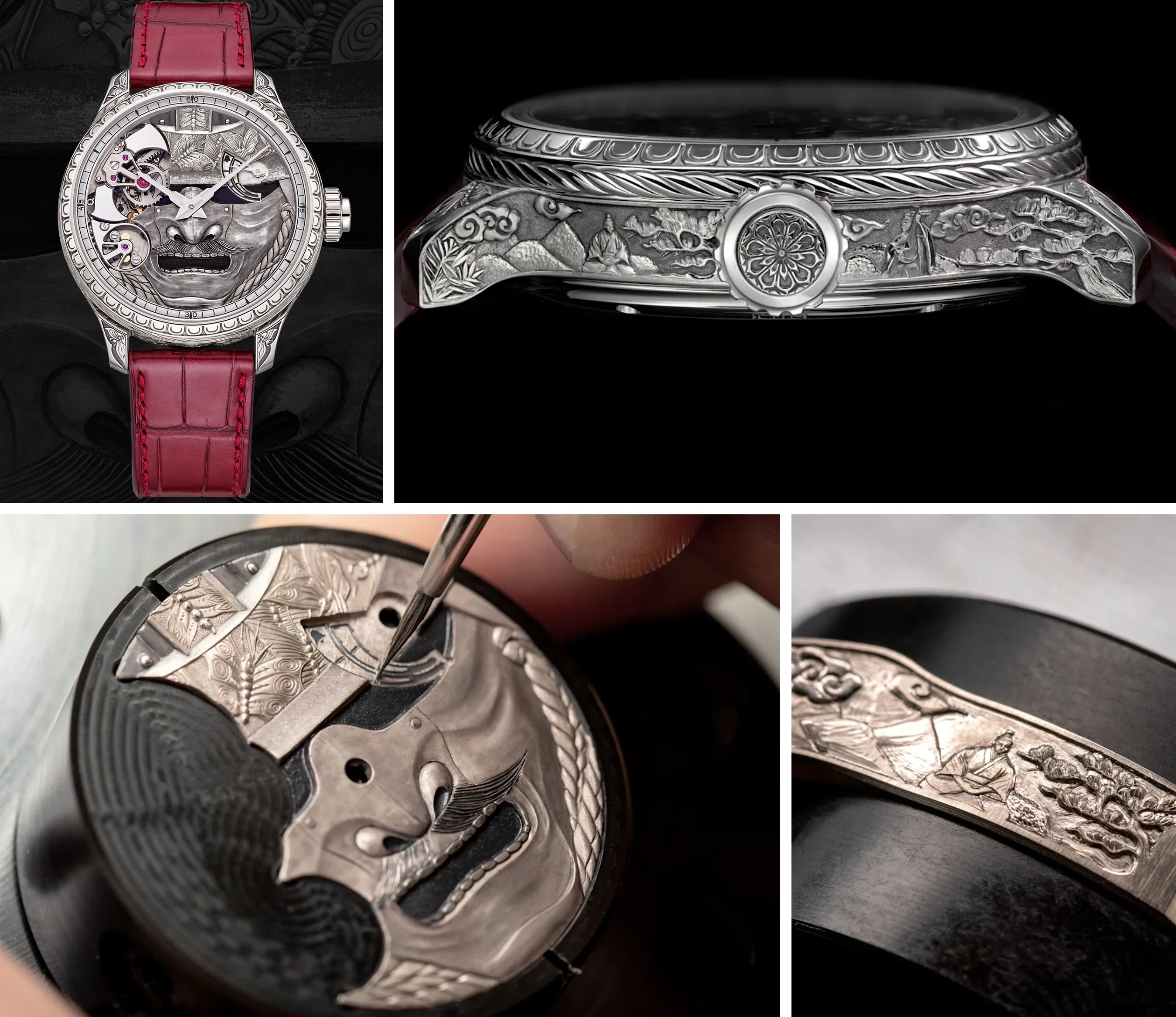 Trên mặt số, hình ảnh mặt nạ menpō của một samurai hiện lên uy nghi – biểu tượng cho danh dự, kỷ luật và lòng trung thành, những giá trị đồng điệu với tinh thần Haute Horlogerie. Với vẻ dữ tợn, ria rậm, miệng mở rộng, chiếc mặt nạ gợi nhớ đến mặt nạ sắt thời Edo, vừa mang tính răn đe vừa biểu trưng cho sức mạnh nội tâm. Nhân vật trung tâm này mang lại sắc thái võ hiệp đậm chất biểu tượng, vừa kịch tính, vừa quyền lực.