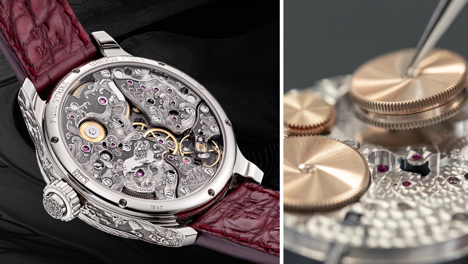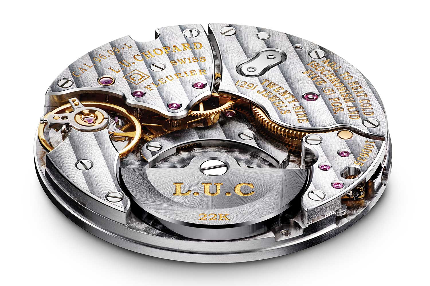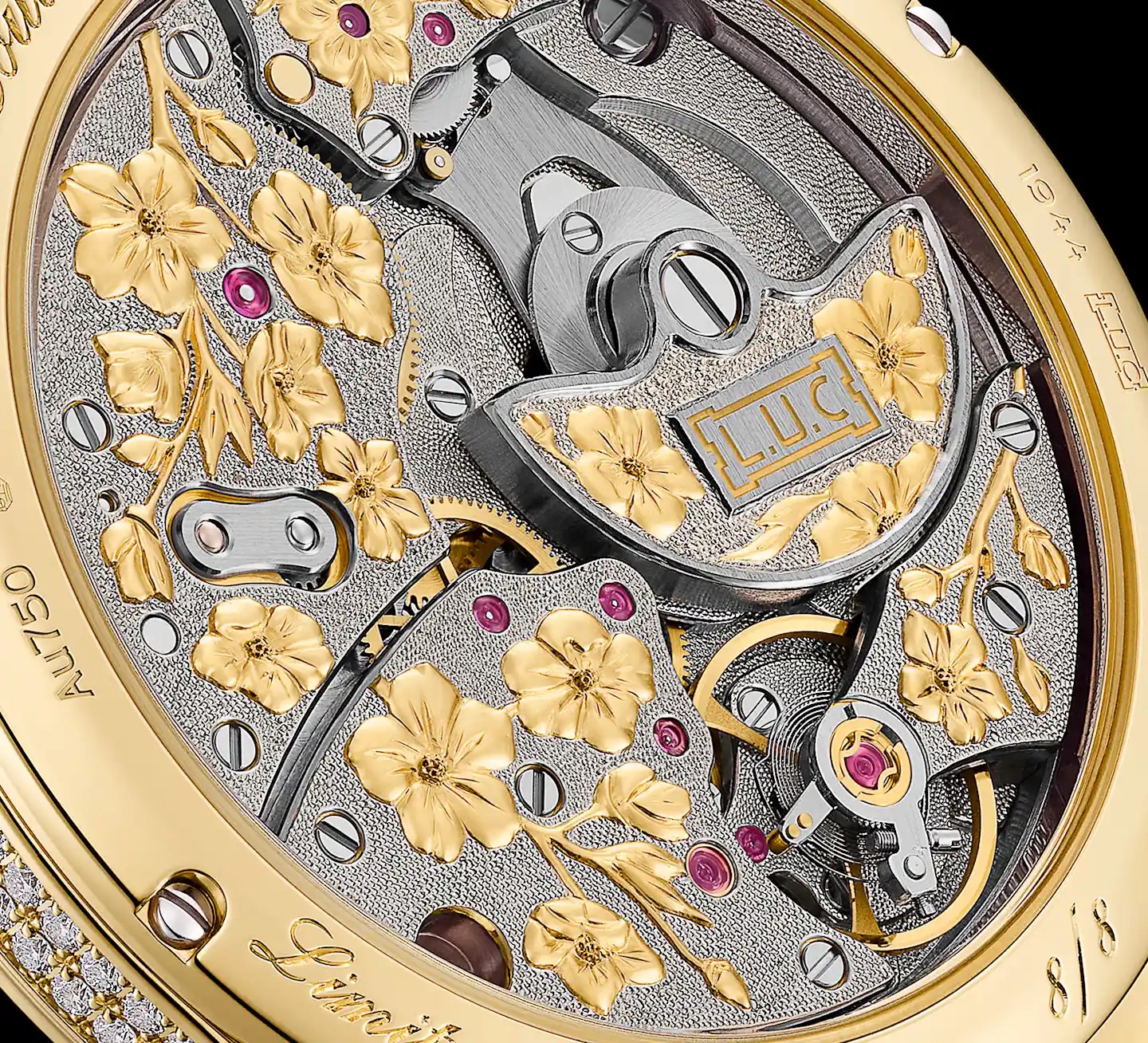Calibre L.U.C 08.01-L – bộ máy minute repeater biểu tượng – cũng được trang trí thủ công tỉ mỉ