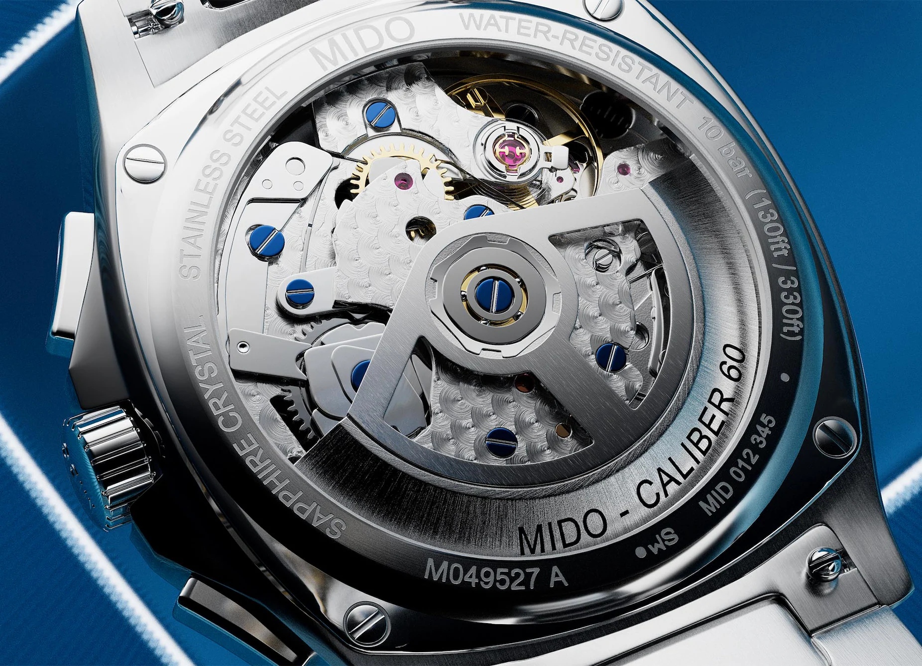 Đặt trong vỏ thép không gỉ cứng cáp có kích thước 42 mm được hoàn thiện phối hợp cả đánh bóng và chải mờ satin với núm vặn và mặt kính sapphire có phủ lớp chống phản chiếu. Đồng hồ được trang bị bộ chuyển động Calibre 60 tự động của Thụy Sĩ, có lắp lò xo cân bằng làm từ vật liệu Nivachron™ đem đến khả năng vượt trội chống sốc, kháng từ trường và sự thay đổi nhiệt độ. Mặt sau trong suốt để lộ bộ máy được trang trí tinh xảo điểm xuyến những con ốc màu xanh lam, những hoa văn tròn và con lắc kiểu khung xương có khắc logo Mido. Với khả năng dự trữ năng lượng 60 giờ, mức độ chống nước 10 bar (100 m/330 ft) và tặng kèm hai dây đeo có thể hoán đổi dễ dàng, gồm một dây thép không gỉ và nột dây vải tổng hợp màu xanh lam, Multifort TV Chronograph mang đến cả ba cùng một lúc: độ chính xác, độ bền bỉ và phong cách.