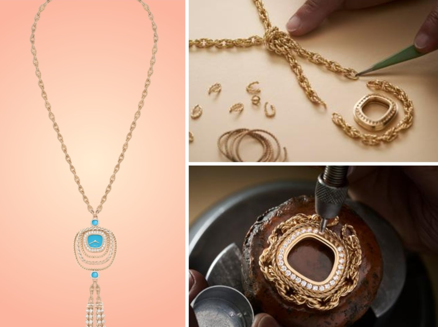 Hoàn thiện dòng sản phẩm, dây chuyền Swinging Sautoir huyền thoại khác, ôm trọn mặt số ngọc lam hình thang trong vòng dây vàng xoắn như thắt nút ngẫu nhiên nhưng lại được chế tác tỉ mỉ bằng kỹ nghệ thủ công đặc trưng Piaget. Tuyệt phẩm này xóa mờ ranh giới giữa trang sức và đồng hồ, hiện thân cho triết lý: đồng hồ không chỉ để đeo trên cổ tay, mà còn tô điểm cơ thể như những tác phẩm nghệ thuật.