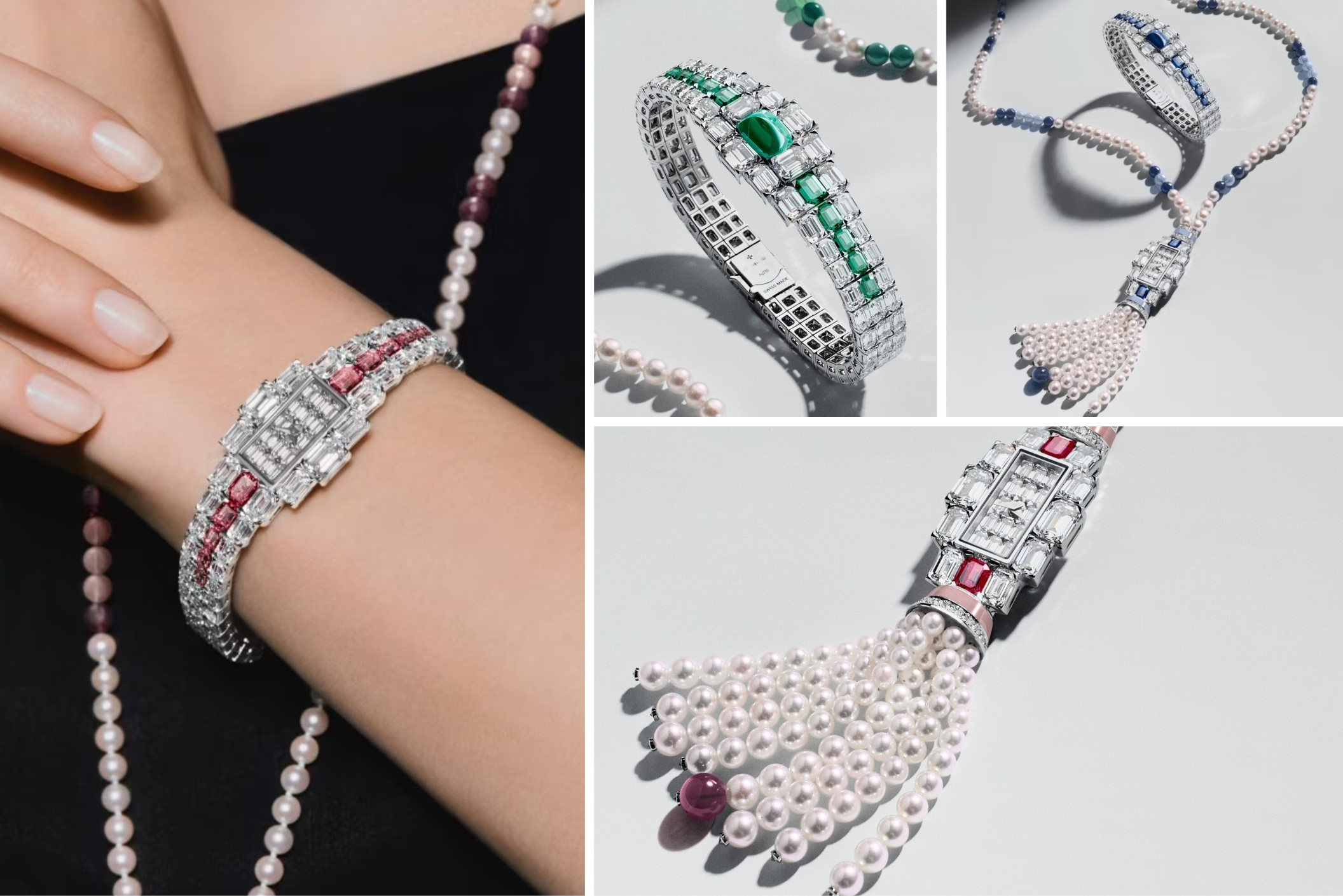 Grand Lady Kalla 2025 thể hiện đỉnh cao của nghệ thuật chế tác đồng hồ trang sức Vacheron Constantin, nơi kỹ nghệ thủ công tinh vi hòa cùng tinh thần Art Deco cổ điển. Thiết kế mang ngôn ngữ hình khối dứt khoát của vỏ, vòng tay và mặt trang sức, kết hợp với sự uyển chuyển của chuỗi sautoir để tạo nên vẻ đẹp vừa kiêu sa vừa mềm mại. Đáp lại mong muốn của phái đẹp về những món trang sức đa dụng, Grand Lady Kalla mới được cấu thành từ bốn chi tiết có thể thay đổi, cho phép biến hóa linh hoạt theo bốn cách đeo khác nhau – phù hợp với nhiều phong cách và dịp khác nhau, từ buổi tiệc sang trọng đến khoảnh khắc thường nhật đầy tinh tế.