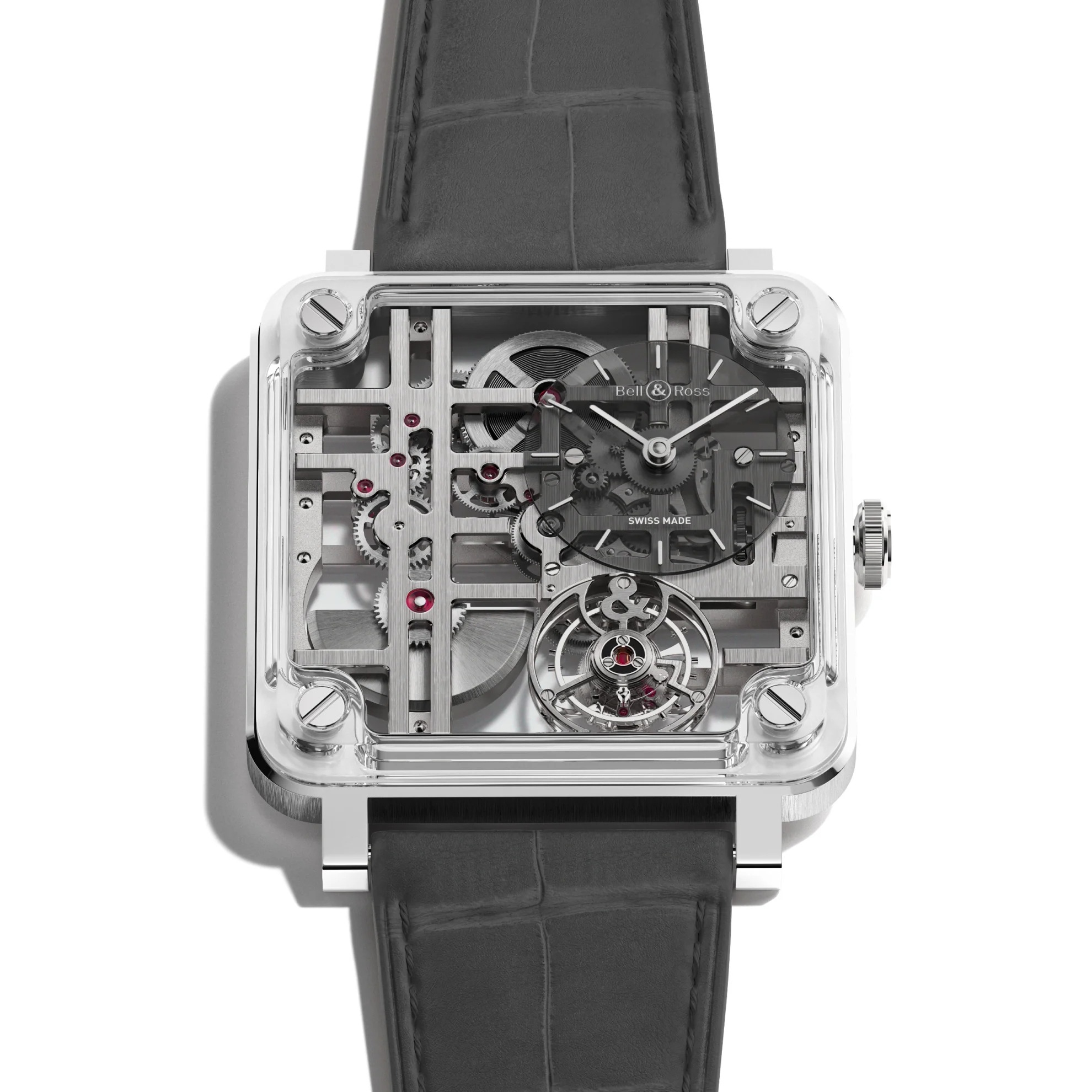 Với BR-X3 Tourbillon Micro-Rotor, Bell & Ross chuyển hóa ngôn ngữ thiết kế “vòng tròn bên trong hình vuông” quen thuộc thành một tuyên ngôn Haute Horlogerie đậm tính kiến trúc. Phiên bản giới hạn 25 chiếc sở hữu vỏ 40mm với phần khung thép satin kết hợp mặt trên và đáy sapphire, tạo nên một cấu trúc trong suốt nơi bộ vỏ và bộ máy hòa làm một. Những cầu nối skeleton xếp lớp mô phỏng đồ họa Mondrian, được nhấn nhá bằng 26 chân kính ruby, mang lại cảm giác trật tự và nhịp điệu thị giác rõ ràng. Lồng tourbillon bay ở vị trí giữa 5 và 6 giờ trở thành tâm điểm đầy mê hoặc, trong khi mặt hiển thị giờ phút lệch tâm tại 2 giờ giữ bố cục tối giản có chủ ý. Micro-rotor được đặt phẳng cùng mặt phẳng bộ máy giúp đồng hồ chỉ dày 9mm nhưng vẫn đảm bảo khả năng dự trữ năng lượng 58 giờ. Điểm nhấn cuối cùng trên đồng hồ là dây da cá sấu màu xám lịch lãm.