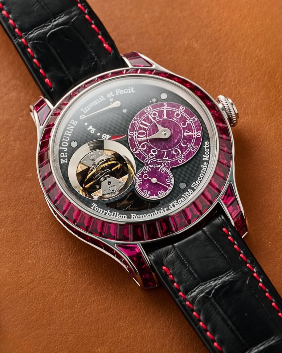 Mẫu đồng hồ F.P. Journe này gây choáng ngợp bởi 93 viên ruby baguette nạm trên vỏ platinum 44mm, tổng trọng lượng khoảng 25 carat và được tuyển chọn trong suốt tám năm. Tính minh bạch trong nguồn gốc đá quý còn được chứng nhận bởi Responsible Jewellery Council. Sự lộng lẫy tiếp tục lan tỏa trên mặt số với tấm chính đồng hồ bằng vàng hồng chạm khắc phủ lớp hoàn thiện đen sâu thẳm, kết hợp các mặt số phụ rubellite vẽ tay. Bên trong, calibre lên dây tay 1519 sở hữu cơ chế remontoir d’égalité tạo lực ổn định, cho phép hiển thị giây “deadbeat” hiếm gặp và giúp kiệt tác hoạt động mượt mà trong suốt 80 giờ. Sự ấn tượng còn được thể hiện qua dây da cá sấu đen kết hợp đường chỉ khâu màu đỏ cá tính.
