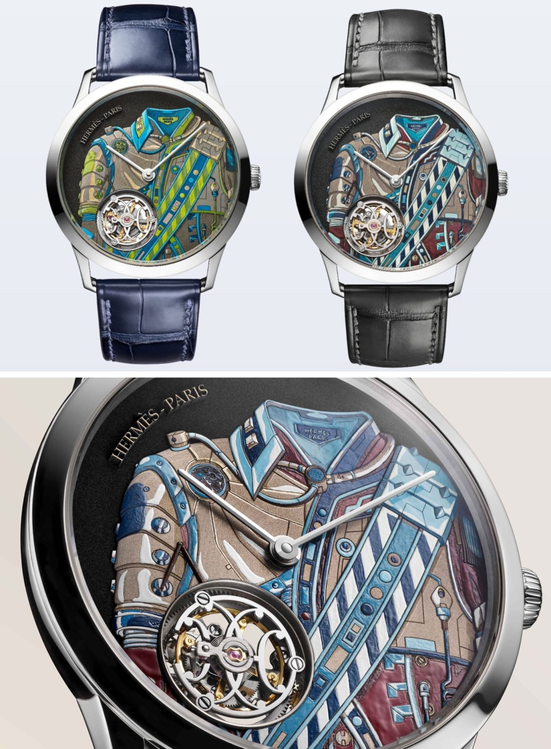 Hermès mang tinh thần couture bước vào địa hạt tourbillon với Slim d’Hermès Neo Brandebourgs. Vỏ platinum 39,5mm thanh lịch trở thành nền cho hai phiên bản mặt số giới hạn 24 chiếc lấy cảm hứng từ chiếc áo quân phục tương lai do Daisuke Nomura diễn giải từ họa tiết khăn lụa Brandebourgs năm 1972. Những mảng màu neon xanh lục, xanh teal hay burgundy xanh lam được tạo nên bằng sự kết hợp giữa khắc tay và vẽ tiểu họa, từ đó mang đến chiều sâu và sức sống hiếm có cho một tạo tác thời gian. Lần đầu tiên trong dòng Slim d’Hermès, tourbillon xuất hiện tại vị trí 7 giờ với lồng xoay mang họa tiết lịch sử lấy cảm hứng thang máy cửa hàng Faubourg Saint-Honoré. Bộ máy siêu mỏng tự động H1950T vừa đảm bảo thẩm mỹ tinh tế, vừa duy trì hoạt động trong 48 giờ, phản ánh cách Hermès dung hòa nghệ thuật ứng dụng và kỹ nghệ cơ học. Hãng kết hợp hai phiên bản này cùng với dây đeo da cá sấu màu xanh dương và đen cơ bản.